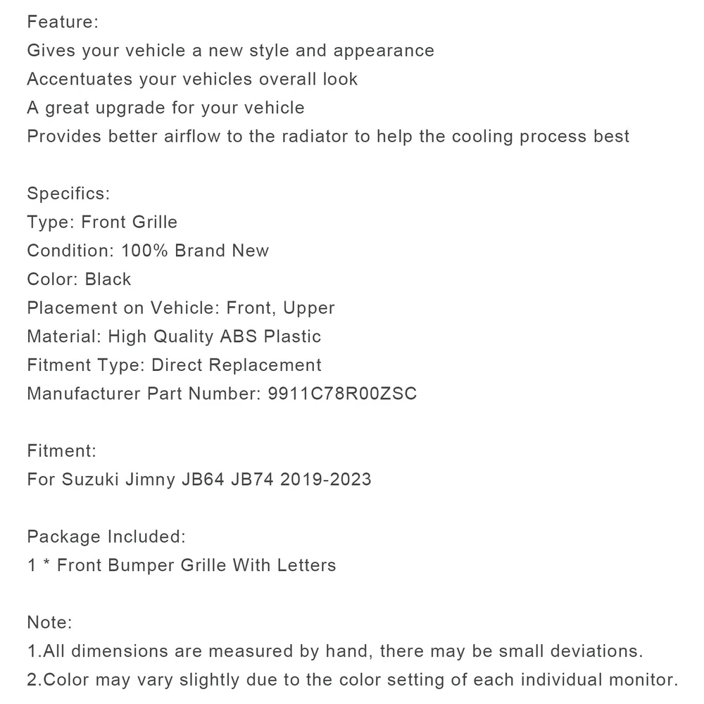 SAFE & SECURE SHOPPING 100% SATISFACTION GUARANTEED FAST SHIPPING Store Categories Store Categories Other eBay Motors Grille You may also like 6X Ignition Coils +Spark Plugs UF303 For Chevrolet Trailblazer EXT 4.2L 02-05 !! 196.65 USD Free shipping Left+Right Rear Bumper Reflector Light Without bulb 31656865/66 For VolvoXC40 US 93.65 USD Free shipping Front Bumper Grill Grille fit Mercedes Sprinter W907 W910 2018-2023 !! 362.65 USD Free shipping 1PCS Fuel Injector 1278216 127-8216 fit Caterpillar 3114 3116 3126 3126B 171.65 USD Free shipping Timing Chain Kit W/Phasers for Ford Expedition F150 3.5L 2017-2023 2024 510.99 USD Free shipping Front Bumper Grill Grille Fit Mercedes Benz E-CLASS W207 Coupe 2014-2017 176.65 USD Free shipping Honeycomb Front Bumper Grill Grille Fit Suzuki Jimny JB74 2019-2023 Black !! Product Description Feature: Gives your vehicle a new style and appearance Accentuates your vehicles overall look A great upgrade for your vehicle Provides better airflow to the radiator to help the cooling process best Specifics: Type: Front Grille Condition: 100% Brand New Color: Black Placement on Vehicle: Front, Upper Material: High Quality ABS Plastic Fitment Type: Direct Replacement Manufacturer Part Number: 9911C78R00ZSC Fitment: For Suzuki Jimny JB64 JB74 2019-2023 Package Included: 1 * Front Bumper Grille With Letters Note: 1.All dimensions are measured by hand, there may be small deviations. 2.Color may vary slightly due to the color setting of each individual monitor. About Us Shipping Terms Contact Us About Us Bruce & Shark is a company Focus on Motorcycle parts more than 11 years. The design inspiration comes from the awe of the vast sea and worship of the fighting sharks, therefore Bruce & Shark takes a shark as brand logo. Since its inception, we have always put the "customer first" and "top quality" as our principle. We specialized in selling Motorcycle parts and providing customers with various types of high-quality products. Our brand Bruce & Shark has enjoyed good reputation in America, Europe, Japan, Canada and Africa, covering more than 30 countries. Our vision is to deliver high-quality Motorcycle parts products and sincere services to the world. Our main products are motorcycle mounted, fuel pump, stator, windshield, Seat Cover, motorcycle fairing. Welcome to our shop to choose products that are worth more for your Motorcycle! Please Add me to your list of favorite sellers and visit often. Thank you for your business. Shipping Shipping Terms International Buyers – Please Note: 1. Import duties, taxes and charges are not included in the item price or shipping charges. These charges are the buyer’s responsibility. 2. Please check with your country’s customs office to determine what these additional costs will be prior to bidding/buying. 3.Buyers' Information: We strive our best to provide you the most reliable, affordable way of shipping service. But sometimes international delivery is highly depended on the courier company and local customs/duties. If you do not receive your item on time, please sent us ebay message immediately for further assistance. Thank you for your understanding. Terms We stand behind everything that we sell and will do everything possible to assure you are satisfied. When you receive your purchase if you are not 100% satisfied, please sent me ebay message and we will do our best to make you happy. If you still want to return your purchase, simply ship the item(s) back to us and we will refund your original purchase price and the original shipping charge. Buyers are responsible for the postal cost of returning the items. We must be notified of the intent to return your item within 30 days of receiving the item. Items returned must be in the same condition that they were received. How to return 1,Please ask us for return address . 2,Shipping back the package . The RMA#(Return Merchant Authorization Number = Your ebay ID) must be clearly written on the return package ,Otherwise the package will be refused. 3,Sent us the return tracking number. 4,All returns will be inspected prior to a credit being issued. Contact Us Sent ebay message in English If you have any questions, our Customer Service staffs welcome you to sent me ebay message. We strive to answer all questions and resolve any problems as quickly as possible. Business Hours: HongKong Time GMT+8:00 Monday-Saturday 9:00-17:00 Copyright © 2022 Tongtool