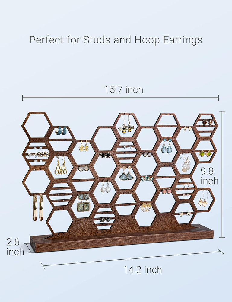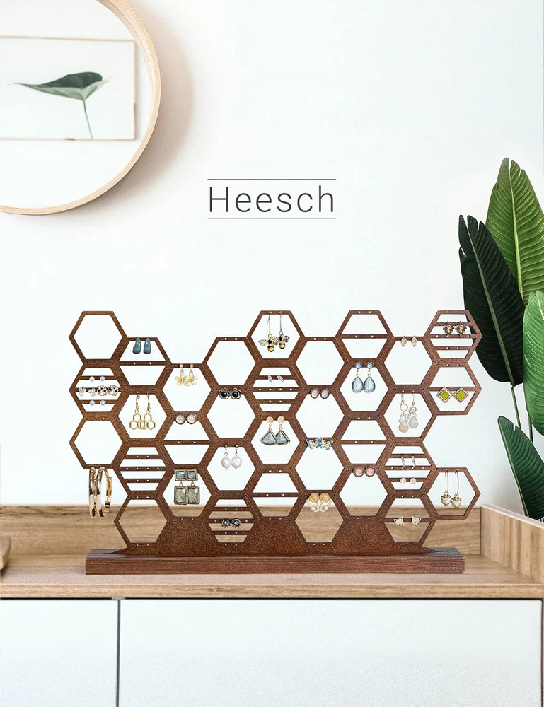 Capacious Earring Organizer & Display - Organizes at least 65 pairs of earrings with 130 holes. It's a great way to display your earrings and helps you choosing different pieces to wear much easier. Stable Structure - Product including a honeycomb design organizer frame and a solid base stand. The size of the frame is 15.7"x 0.19"x 9.2" and the size of the stand is 14.2"x 2.6"x 0.6". Total weight is 297g. Easily installation, just to insert the organizer frame into the base stand. Stylish Honeycomb Design - The design of the organizer allows for dangling earrings, hook earrings, stud earrings and hoop earrings, which make it very versatile. Elegant Room Decoration - The walnut wood earring organizer stand looks like a piece of artwork. It's an elegant decoration to the table and perfectly matches your bedroom or living room. Perfect for Gift - The product comes with a beautiful gift box. It can be the perfect gift for girls and women who wearing earrings. Product Description Package content : 1 x Honeycomb organizer frame 1 x Solid wood base stand 1 x Gift box Size: 14.2"x 2.6"x 0.6" Weight: 297g Color: walnut wood Material: wood Shape: Honeycomb Heesch Honeycomb Earring Holder Stand Capacious Earring Organizer & Display Organizes at least 65 pairs of earrings with 130 holes. It's a great way to display your earrings and helps you choosing different pieces to wear much easier. The design of the organizer allows for dangling earrings, hook earrings, stud earrings and hoop earrings, which make it very versatile. The walnut wood earring organizer stand looks like a piece of artwork. It's an elegant decoration to the table and perfectly matches your bedroom or living room. Spacious earring organization Stylish beehive design Beautiful room decoration Easy installation Perfect as a gift Product Details Stable Structure Solid wood base stand provides steady support. Easy to Assemble Product including a honeycomb design organizer frame and a solid base stand. Just to insert the organizer frame into the base stand. Perfect for Gift The product comes with a beautiful gift box. It can be the perfect gift for girls and women who wearing earrings. The design of the organizer allows for all kinds of earrings Stud Earrings Dangling Earrings Hoop Earrings