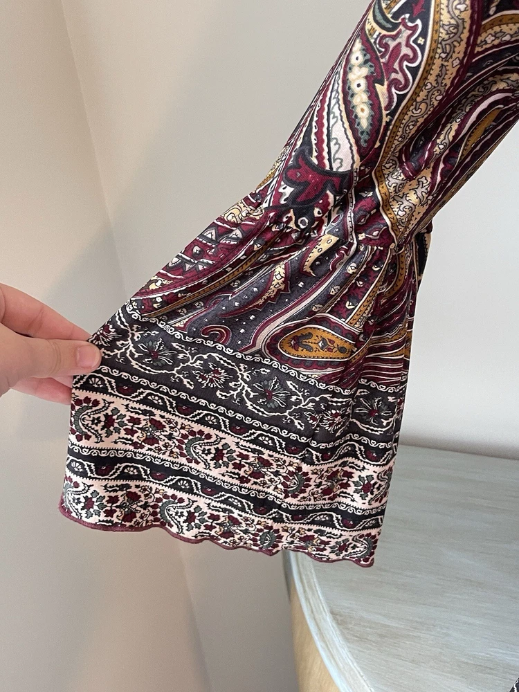 Honeyme Dress Size M 3/4 Flare Bell Sleeve Paisley Fall Colors Stretch Batteau