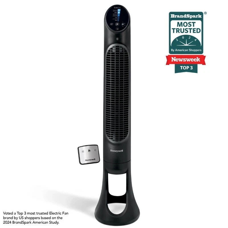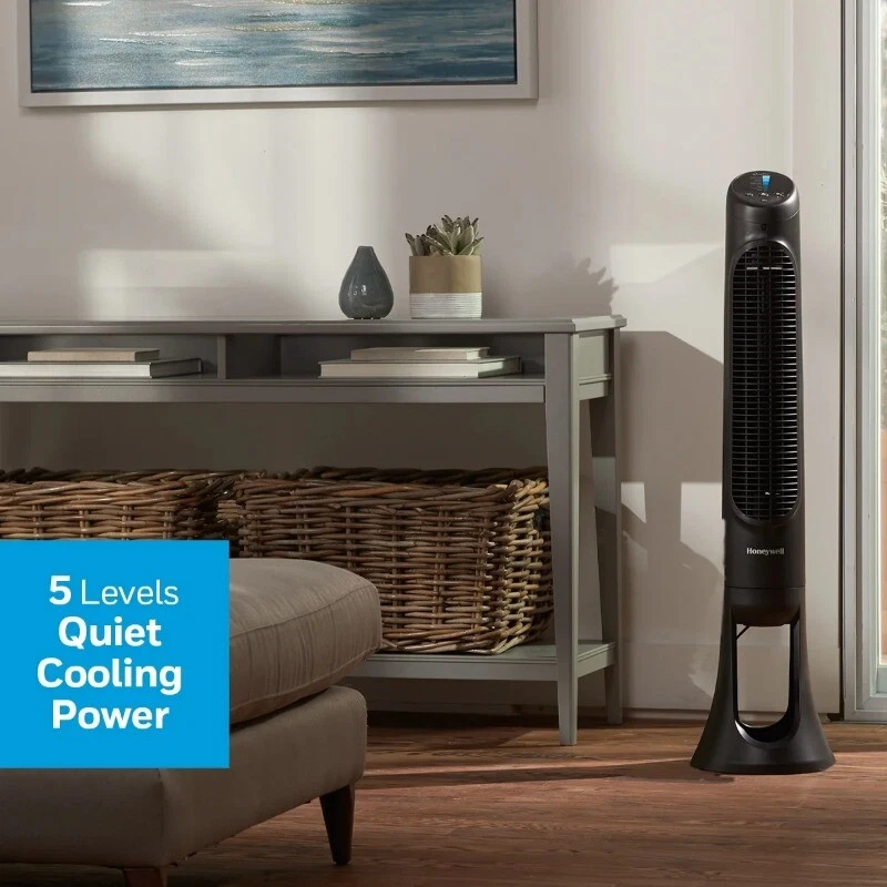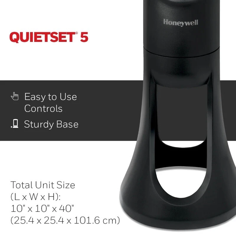 Enjoy a cool breeze in every room with the Honeywell 40" Quiet Set Tower Fan. It features five speeds that are customizable and range from sleep to power cool settings. The lights on the control panel automatically dim after 15 seconds, making it ideal for nighttime use as well. This slim tower fan has touch-button electronic controls that are easy to use and a remote-control nest. The slim design of this unit is convenient because it does not take up too much space in your home. The oscillating tower fan has a sturdy and durable base that is to easy setup, requiring no tools. 5-speed setting, customizable and range from sleep to power cool settings Powerful, quiet whole room cooling Remote control makes it convenient to control the unit from a distance Oscillation evenly cools the entire room Electric tower fan has a sturdy base Easy set up and no tools assembly Remote control nest for safe storage Auto-dim lights reduce to 50% brightness after 15 seconds ideal for nighttime use, interaction brings lights back on at 100% 1, 2, 4 and 8 hour auto shut-off timer and touch button electronic controls