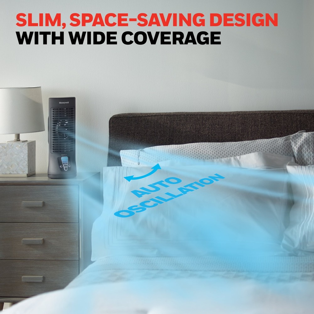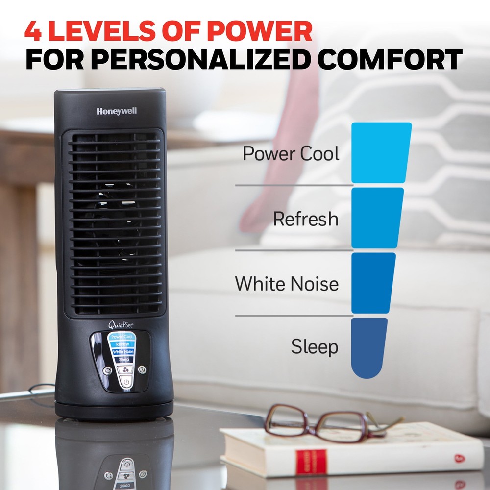 Customize your cooling and stay comfortable with the Honeywell QuietSet Personal Table Fan. This 13” mini tower fan has a slim, compact design and oscillates to provides powerful cooling with quiet operation. Choose what’s best for your environment with 4 levels of sound and power settings. Ideal for personal cooling for desktops, nightstands and more, the quiet tower fan features a 4 levels of sound/power and an automatic shut off timer. Customize your cooling to however you like it with this portable indoor fan. A house fan is an easy way to cool down any space and improve airflow. Give your air conditioner a break by using a portable indoor fan to help reduce your energy consumption and costs.* *Save up to 20% on energy bills when used with an air conditioner. Save up to 5% for each degree you raise the thermostat. Raise temperature up to 4 degrees without sacrificing comfort. Increased air flow allows the a/c to be used at lower wattage settings to help save you money. OSCILLATING TABLE FAN – The New Honeywell QuietSet 13” Personal Table Fan provides powerful personal cooling with quiet operation and a slim, compact design. Choose what’s best for your environment with 4 levels of sound and power settings in one small fan QUIET COOLING – Not just a personal fan, this oscillating tower fan offers powerful cooling with less sound. It features a compact size, quiet operation, oscillation, automatic shut-off timer and 4 levels of sound/power, so you’re always comfortable. CUSTOMIZE YOUR COMFORT – With multiple options for sound and power, you’ll always be cool. This compact fan is great as a fan for a bedroom, on nightstands, desks and more. Customize your cooling to however you like it with this quiet fan SMART SAVINGS – Fans for home are an easy way to cool down any space and improve airflow. Give your air conditioner a break by using a portable indoor fan to help reduce your energy consumption and costs.* HONEYWELL QUALITY – Help improve cooling and energy savings* anywhere in your home like the living room, bedroom or office using a Honeywell fan. We offer personal fans, whole room fans, tower fans and oscillating fans that are a great choice.