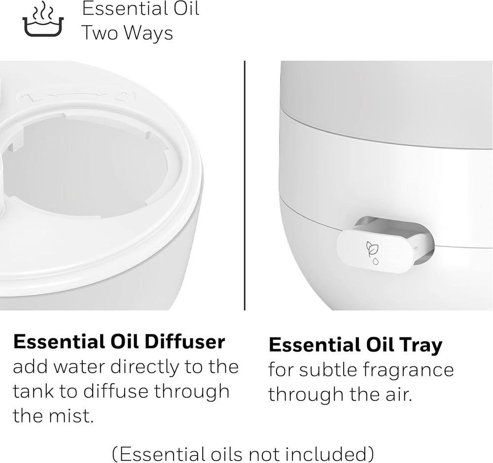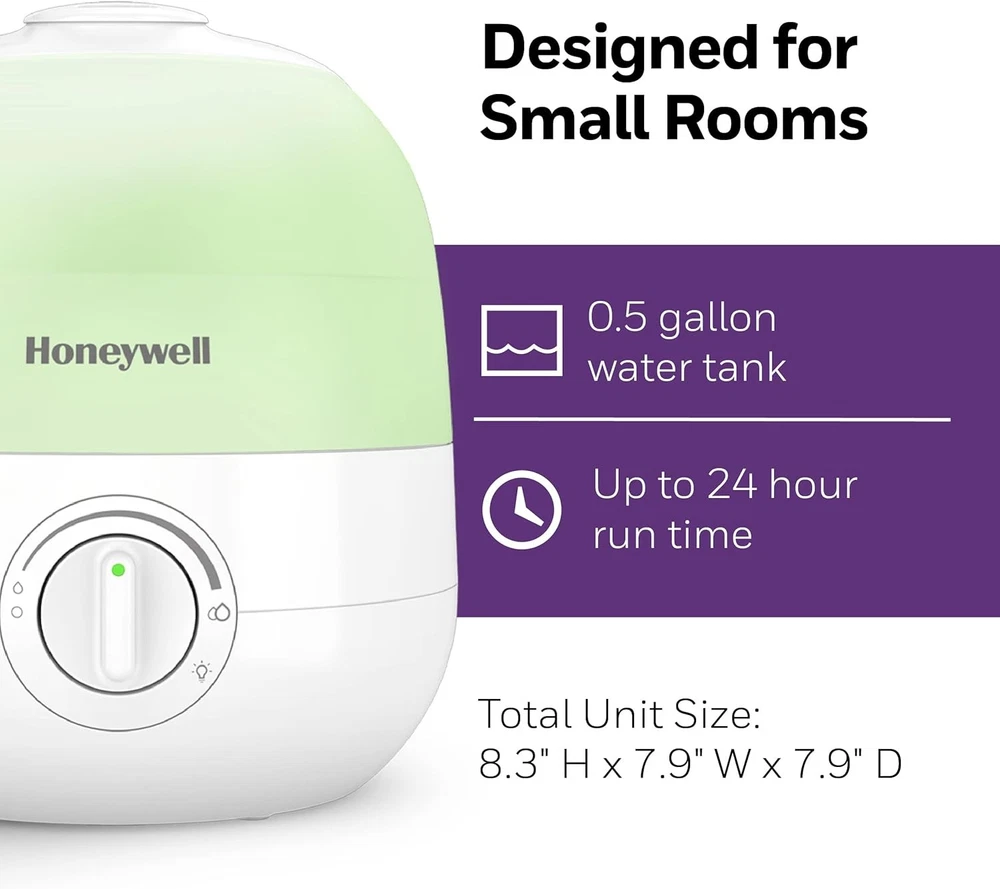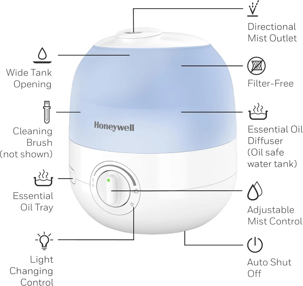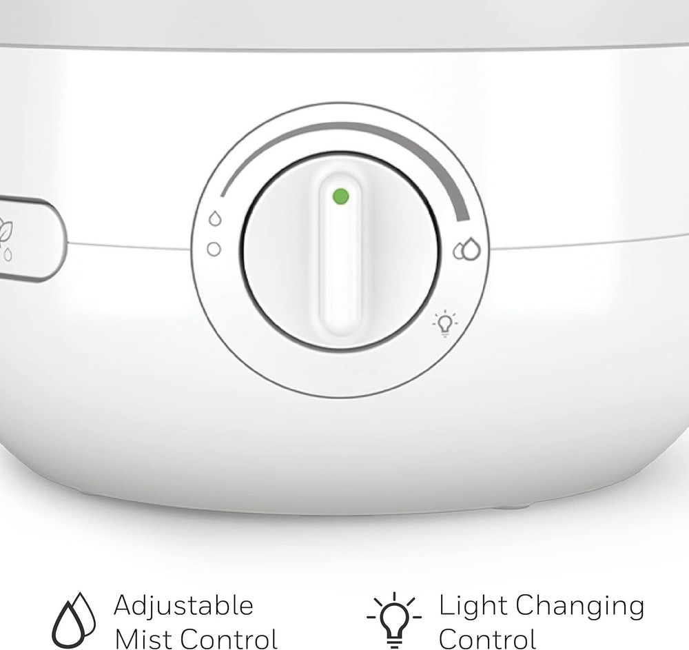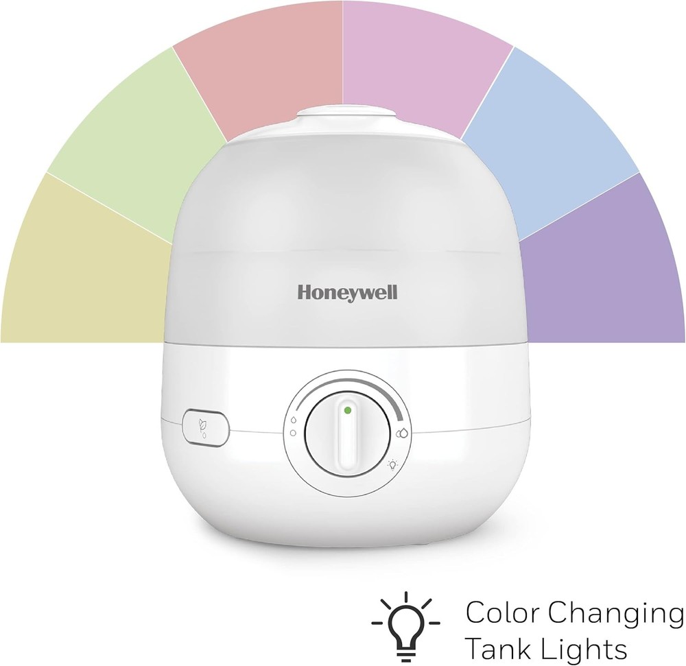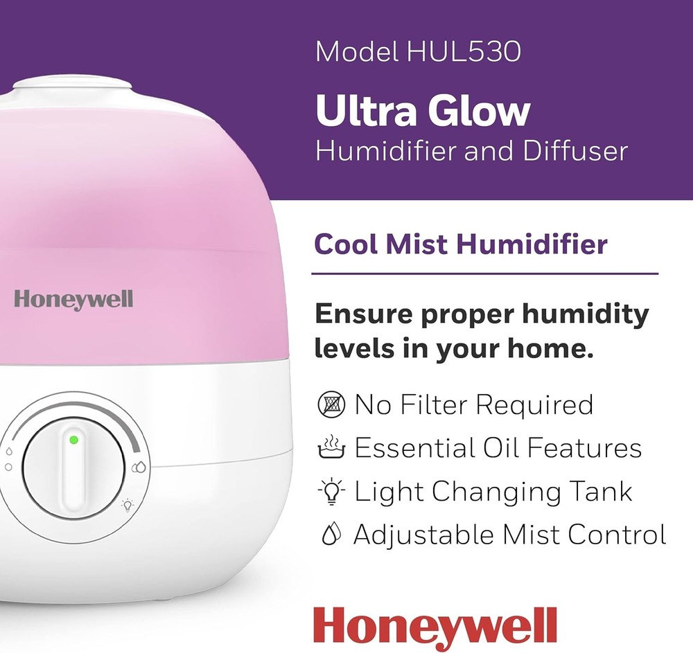 Honeywell Ultra Glow Light Changing Humidifier and Diffuser – Cool Mist White Product Details Brand: Honeywell Color: White Recommended Uses For Product: Office, Home Special Feature: Cool Mist Power Source: Corded Electric Capacity: 0.5 Gallons Model Name: Ultra Glow Light Changing Humidifier & Diffuser Product Dimensions: 7.87"L x 7.87"W x 8.82"H Light Source Type: LED Coverage: Small room Runtime: 24 hours Wattage: 12 watts Shape: Rectangular Auto Shutoff: Yes Number of Items: 1 Manufacturer: Kaz Unit Count: 1.0 Count Item Weight: 3.54 pounds Country of Origin: China Item model number: HUL530 Batteries required: No COOL MIST HUMIDIFIER – Honeywell Ultra Glow Light Changing Humidifier and Diffuser (HUL530) helps ensure proper humidity levels. Indoor humidity levels between 40-60% can help relieve cough/congestion, keep throat/nasal passages hydrated and more. ESSENTIAL OIL TWO WAYS – This small humidifier is an essential oil diffuser, too. You can add essential oils directly to the water tank, or use the oil tray for a more subtle fragrance experience. Essential oils not included. SOOTHING COLOR CHANGING LIGHTS – Cool mist humidifier with essential oil diffuser has customizable color changing tank lights, adjustable mist control and a directional mist outlet. It has no filter to change, a wide tank opening & runs for up to 24 hours. COUGH AND CONGESTION RELIEF – Humidifiers for home can be helpful during cold and flu season, when it’s difficult to sleep with cough and congestion. A humidifier can provide temporary relief by adding necessary moisture to the air. A BRAND YOU CAN TRUST – Honeywell has been keeping families comfortable in their homes for over 100 years with our full line of humidifiers, filters and more. The Honeywell Ultra Glow Light Changing Humidifier and Diffuser fills your air with refreshing moisture to help relieve dry air discomforts and also lets you relax and enjoy your favorite essential oils. During cold and flu season, or when the air is simply just dry, you can rely on this small humidifier for your entire family. It also offers calming essential oils two ways: you can add essential oils directly to the water tank, or use the oil tray for a more subtle fragrance experience. Essential oils not included. The calming ambiance gets even better with the glowing, color changing lights. Honeywell humidifiers for bedroom and beyond add necessary moisture to the air, and help ensure proper humidity levels in your home. Indoor humidity levels between 40-60% can help relieve cough and congestion, keep throat and nasal passages hydrated, temporarily relieve dry air discomfort, protect furniture, reduce static electricity and even keep plants healthier. This Honeywell humidifier and diffuser is a cool mist humidifier, and produces a fine, visible cool mist with a directional mist outlet. It has no filter to change, a quiet operation, adjustable mist control and a directional mist outlet to let you customize the moisture level in the air, making it a great choice for your family, even as a kids or baby humidifier. Plus, it has a wide tank opening that makes it easy to fill and clean, no filters to replace and it automatically shuts off when empty. It features an up to 24 hour run time.