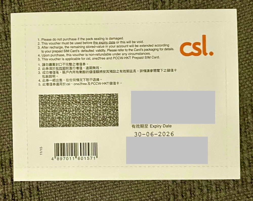 Hong Kong CSL HK$100 prepaid SIM recharge voucher, valid until 30 June 2026. It offers voice, data and anonymous activation. This recharge voucher is for use in Hong Kong and is still sealed and unused. This is for existing cellular lines on the HK CSL network. If you have an active CSL mobile phone line in HK, follow the simple, included instructions. It must be activated by 30 June 2026, and is then valid for 6 months (180 days) after activation. This pay-as-you-go service charges against the value of phone calls and 5G data. Check CSL’s website site for voice, data, message and package pricing. I’m not a professional eBay seller…I bought this with intent to use it, but my company just switched to international roaming and I have this one left (pro tip: I always bought ahead, that way I could land in HK and add the voucher as I’m taxiing to the gate and not have to wait to get to the city). I’m glad to answer any questions you may have about this CSL recharge voucher. The 3 day turnaround time on this is my because I travel a lot—I might be on a trip when you buy it. But if I’m home, I’ll send it out the same or next day. Any delay in shipping is simply me being gone! And I insist on shipping the actual (pictured) voucher as proof of receipt. **Reminder! This is NOT for a SIM card—this is to recharge your current Hong Kong CSL phone line!**