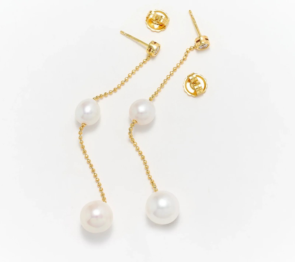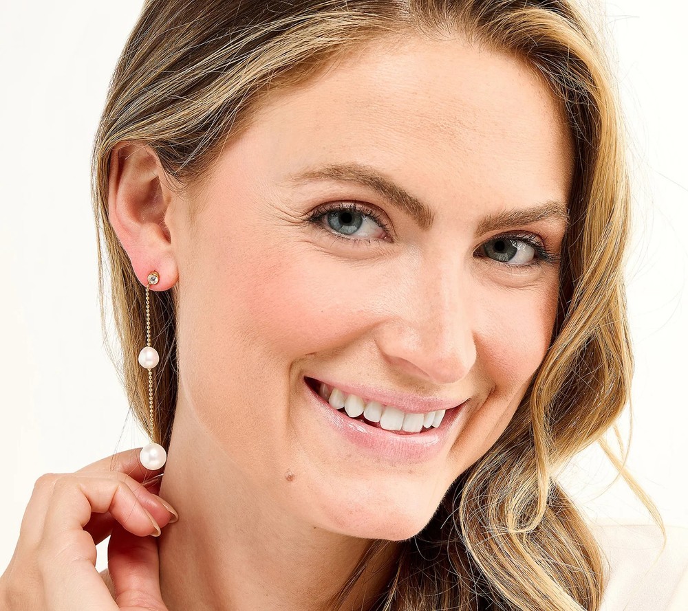 If diamonds are a girl's best friend, then pearls are a close second. These dangly earrings marry the two in a bold and vibrant way, with a chain embellished with Ming cultured pearls topped by a sparkly simulated diamond. The best of both worlds, indeed. From Honora. 18K gold-plated sterling silver Ming cultured pearls measure approximately 7.0mm and 9.0mm Diamond-cut beaded chain embellished by bezel-set, round simulated diamond top; graduated round cultured white Ming pearls Posts and clutches, for pierced ears only Measures approximately 2-1/2"L x 1/4"W