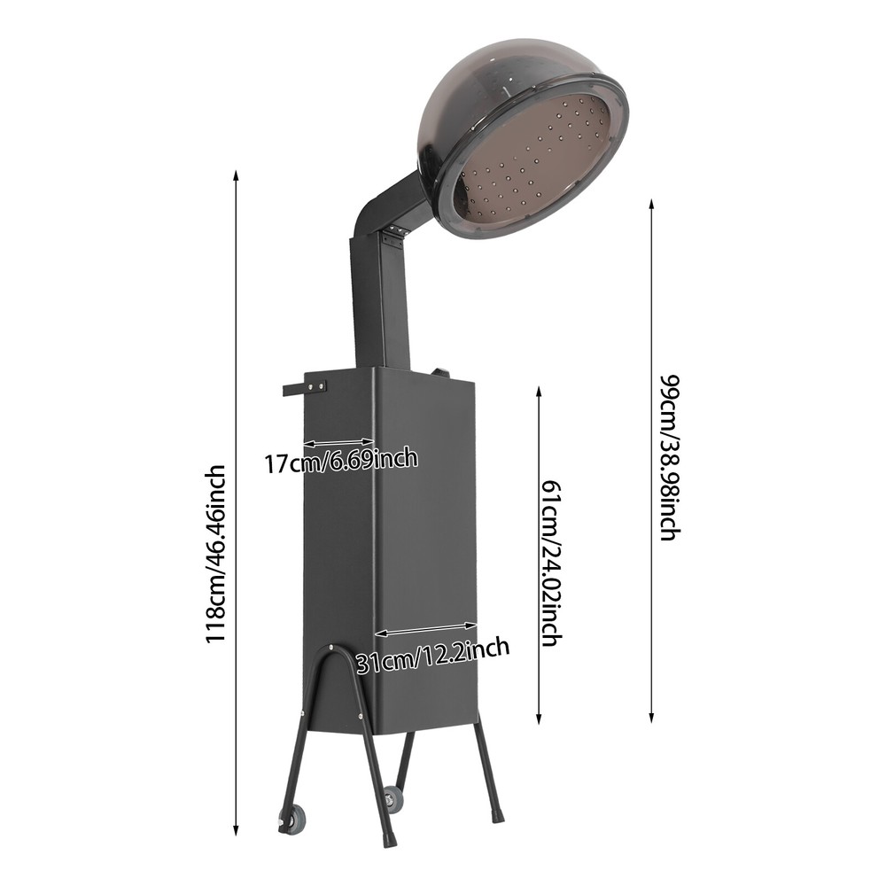 Application It is suitable for hair salons, spas, beauty salons, and homes. Specification Material: Metal, Plastic Color: Black Process: Spray Painting Style: Modern Assembly Required: Yes Installation Type: Freestanding Voltage: 110V Frequency: 60Hz Power: 1200W Plug Type: US Standard Number of Wheels: 2 (Not Equipped with Brakes) Temperature Adjustment Range: Room Temperature to 70 ℃/158℉ Power Cord Length: About 2m/6.56ft Hood Diameter: 36cm/14.17in Total Height (Excluding Hood): 118cm/46.46in Box Size: 31*17*61cm/12.2*6.69*24.02in Height without Bracket and Hood: 99cm/38.98in Package Size: 85*46.5*42cm/33.46*18.31*16.54in Gross Weight: 15kg/33.07 lbs Net Weight: 14.25kg/31.42 lbs WELCOME Description Our hair dryer is a device designed specifically for hair salons. It not only makes hair silky and fluffy but also allows you to blow dry your hair while sitting. It usually has the function of adjusting temperature and time to meet different types of hair care needs. Its vertical design not only saves space but also makes it easy to move and use, making it an ideal choice for improving salon service quality and customer experience. Key Features Premium Material: It is made of metal and plastic material, with a spray painting process, which is sturdy, Georgia-resistant and abrasion-resistant , ensuring a long service life. High Safety : This product not only automatically shuts off when overheated, but also has a heat dissipation design on the back, which can effectively prevent safety accidents and allow you to use it with peace of mind. Powerful Function : With a power of 1200W and a large 14.17 in hood, it can effectively eliminate static electricity, reduce hair knots, shorten drying time, and condition hair to make it silky and fluffy. Adjustable Design: A 60 minute timer, an adjustable 85 degree hood, and three selectable temperatures(LOW/MIDDLE/HIGH) can help you meet the needs of different customers. Simple Operation: You just need to turn on the switch after connecting the power, and then adjust the time and temperature knobs according to your needs to start using it. Easy to Move: It has two wheels and a handle on the back, which allows you to move it easily and work for your customers wherever there is space. Simple Clean-up: It has a smooth surface and a simple structure, so you only need to wipe the dust or residue with a towel. Buy with Confidence: We stand behind all our guests and look forward to assisting you with your purchase. It is our pleasure to answer your confusion and questions. The end of the story between us is not "we sell and you buy". Details Anti-slip Feet: It has two non-slip feet at the bottom to keep the machine running stably. It also prevents the floor from being scratched. Long Power Cord: An about 6.56ft long power cord can provide you with more usage positions and keep you away from the power source for safer use. Application It is suitable for hair salons, spas, beauty salons, and homes. Specification Material: Metal, Plastic Color: Black Process: Spray Painting Style: Modern Assembly Required: Yes Installation Type: Freestanding Voltage: 110V Frequency : 60Hz Power: 1200W Plug Type: US Standard Number of Wheels: 2 (Not Equipped with Brakes) Temperature Adjustment Range: Room Temperature to 70 ℃/158℉ Power Cord Length: About 2m/6.56ft Hood Diameter: 36cm/14.17in Total Height (Excluding Hood): 118cm/46.46in Box Size: 31*17*61cm/12.2*6.69*24.02in Height without Bracket and Hood: 99cm/38.98in Package Size: 85*46.5*42cm/33.46*18.31*16.54in Gross Weight: 15kg/33.07 lbs Net Weight: 14.25kg/31.42 lbs Package Included 1* Hair Dryer 2* Wheels 1* English Manual Other Accessories for Assembly Notes Please read the operating manual completely before use. And pay particular attention to the safety instructions included. Please allow the slight color difference caused by the shooting light and the 1-3 cm error due to manual measurement, and make sure you do not mind before ordering. Payment Delivery details Terms of sales About us Contact us Payment We accept ebay payment 。 Fees such as import duties, taxes are not included in the item price or shipping costs. These charges are the buyer's responsibility. Delivery details Shipping: 2-9 working days to: USA Terms of sales We maintain high standards of excellence and strive for hundred percent customer satisfaction. Feedback is very important to us. We hope that you contact us immediately before you give neutral or negative feedback, so that we can address your concerns. It is impossible to address issues if we do not know about them! About us Your satis faction is our ultimate goal. We work hard to earn your trust and future business. Our certified technicians have tested each item before shipping. The unit comes with 1 year limited warranty on all manufacturing defects. a) If you receive a defective item, you may return it or ask for a discount. Please contact us within 14 days after you receive the package. b) What you returned must be intact and in its original packaging as re? u. Customer is responsible for shipping costs of the returned item. c) We will cover the cost of shipping back t with the shipping rate indicated in the registration page. We will send you a new unit or refund the full payment you paid. Thank you. Contact us Business Hour Business Hour: Monday To Friday: 8:30 AM to 5:00 PM (Beijing China time) Due to time zones, our reply to your questions may not be immediately. But within above working time, we will reply your email within 24 hours. If it's non-workdays, please kindly be patient and wait till Monday. Please contact us with ebay message. Please feel free to contact us if you have any questions. Monday To Friday: 8:30 AM to 5:00 PM (Beijing China time) Due to time zones, our reply to your questions may not be immediately. But within above working time, we will reply your email within 24 hours. If it's non-workdays, please kindly be patient and wait till Monday. Please contact u
