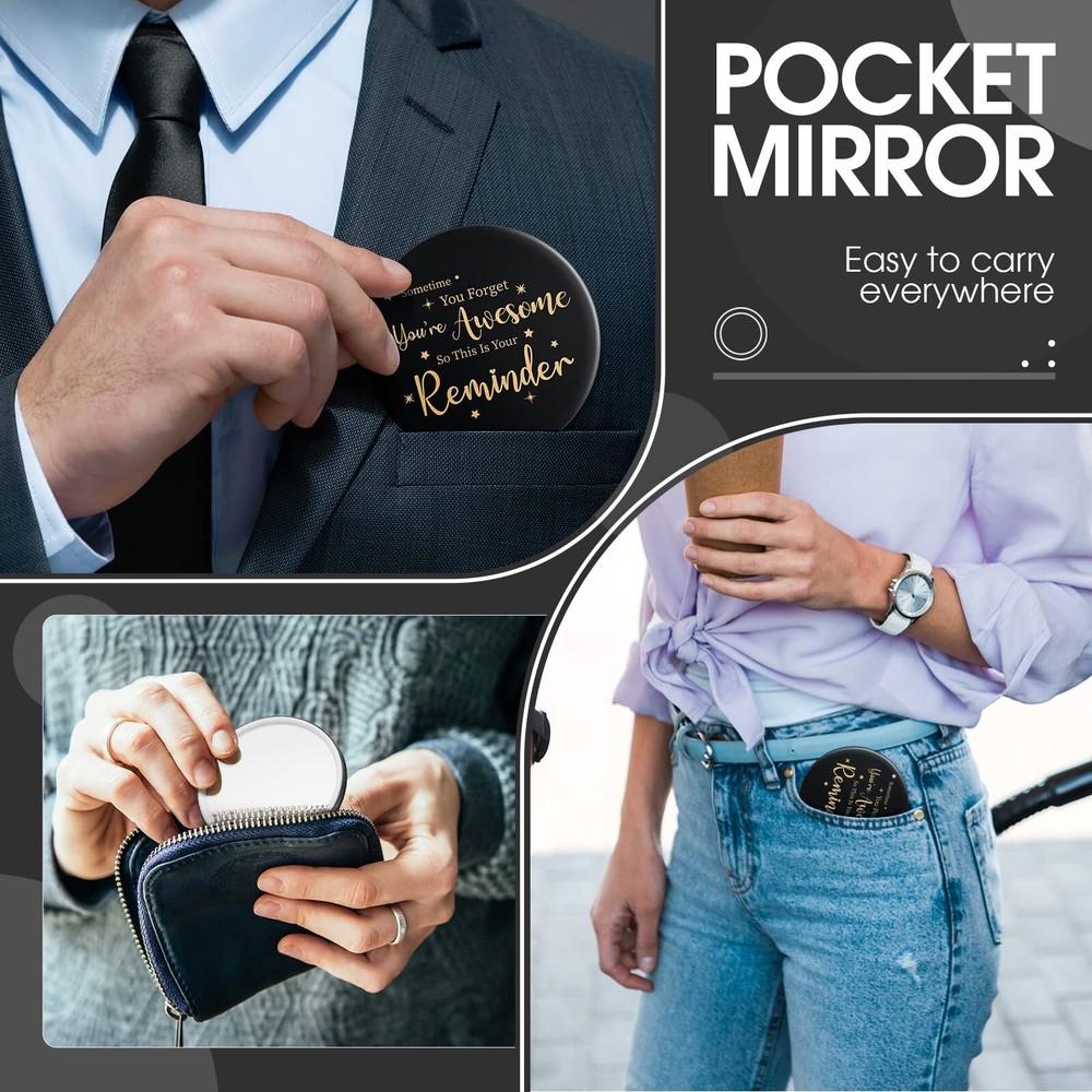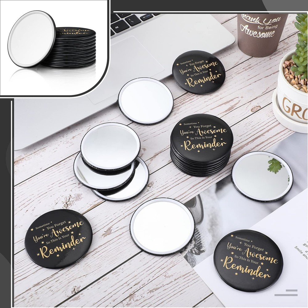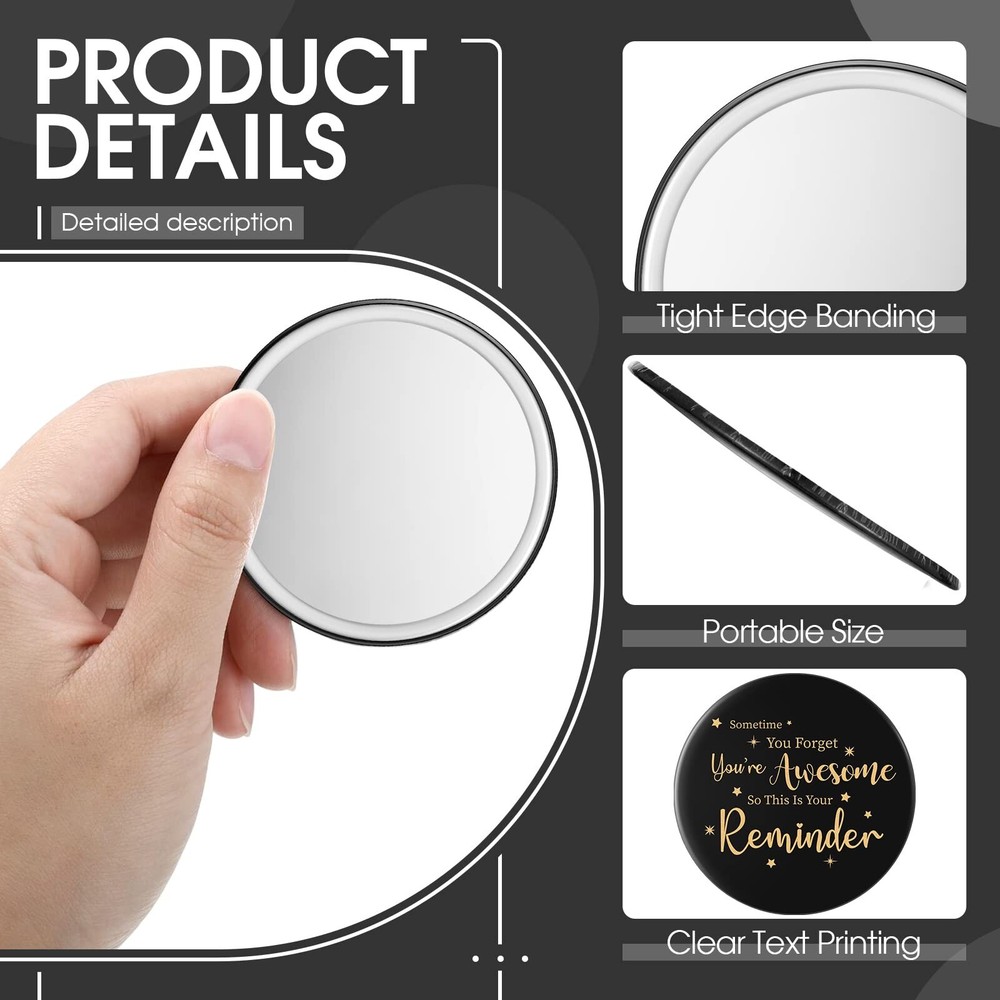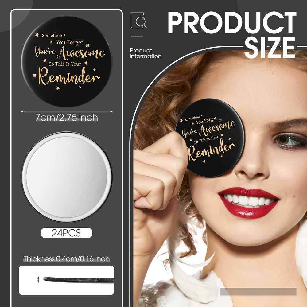 Hoolerry 24 Pcs Inspirational Compact Mirror Round Portable Pocket Makeup Mirror for Employee Teacher (Black, Gold,Stylish) Product Details Brand: Hoolerry Shape: Round Product Dimensions: 2.75"L x 2.75"W Frame Material: Glass Style: Modern Package Dimensions : 9.49 x 5.55 x 1.69 inches; 15.84 ounces Item model number : WL-Hoolerry-1070 Manufacturer : Hoolerry Inspirational Gift: there are 24 pieces of compact mirrors in the package, enough for you to share with employees, colleagues, family, sisters, female friends, classmates and others you want to thank Give You Encouragement and Confidence: [some time you get you're awesome so this is your reminder] is printed on the back of the pocket mirror, which keeps you reminding yourself to stay positive and believe in yourself Serviceable and Stable Material: the small round mirror adopts metal, plastic and glass material, smooth and clear in surface, reliable in quality, not easy to wear or fade, serving you for a long time Lightweight and Portable: each small round mirror is approx. 2.76 inches/ 7 cm in diameter, approx. 0.16 inches/ 4 mm in thickness, small in size and light in weight, can be easily put into your pocket, wallet, backpack and so forth, convenient for you to use at any time Applicable Ranges: the cute mirror is suitable for makeup, hair cutting, shaving, eyebrows trimming or just to appreciate your beautiful appearance, applied for home, hair salon and beauty shop Features: Bring you more convenience: The compact mini mirrors can be easily held in your hand, not easy to slip off. You can use the mirror to freshen your face during the meeting, on the way to work and before the speech, quickly presenting a clean and beautiful face. Practical and adorable gifts: Our pocket mirror for women features good feeling and lovely appearance, most people can't resist these cute small mirrors, suitable for giving to your colleagues, friends, girlfriend on festivals or birthdays. Specifications: Material: metal, plastic and glass Color: as pictures shown Size: Diameter: approx. 2.76 inches/ 7 cm Thickness: approx. 0.16 inches/ 4 mm Package includes: 24 x Inspirational compact mirror Notes: Manual measurement, please allow slight errors on size. The color may exist a slight difference due to different screen displays.