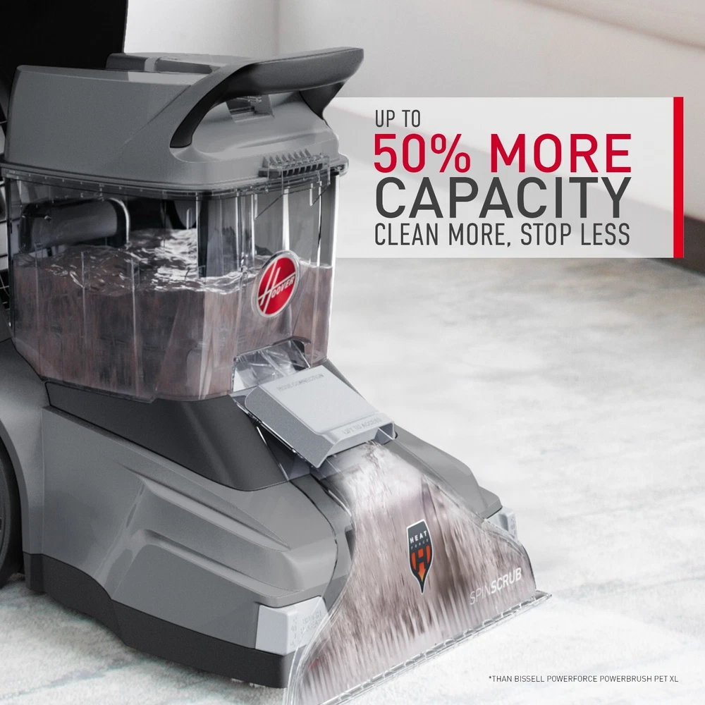 Product details The Hoover PowerScrub XL Carpet Cleaner Machine FH68010, powerfully tackles deep, set-in stains and renews your carpets for a complete, whole home clean. Easily remove stains with the combined power of the five counter-rotating SpinScrub Brushes and HeatForce faster drying. Our Recovery Tank helps you clean more without stopping frequently to empty and refill. Plus, PowerScrub XL comes with versatile tools to target stubborn messes beyond your carpets. *Hoover PowerScrub XL, Upright Carpet Cleaner Machine, FH68010, 1 Count, New Condition FIVE SPINSCRUB BRUSHES: Deep, set-in stains don't stand a chance against the five counter-rotating SpinScrub Brushes that scrub at multiple angles to loosen, lift, and remove even the toughest stains for a lasting clean SPINSCRUB + HEATFORCE: Combine the power of SpinScrub Brushes with HeatForce faster drying for a complete clean that renews your carpets from the inside out UPHOLSTERY TOOL: Scrub and lift stains on fabrics & furniture with the Upholstery Tool NOZZLE CLEANOUT TOOL: Easily clean dirt and debris from brushes with the Nozzle Cleanout Tool QUICK CLEAN MODE: Dries in as little as 30 minutes with Quick Clean Mode TWO TANKS: Clean water and formula are stored together in one tank, separate from the dirty water, so you're never cleaning with dirty water. Clean Water Tank: 1 Gal. WHAT'S INCLUDED: Upholstery Tool, Nozzle Cleanout Tool, 8 ft Hose, trial size carpet cleaner solution WARRANTY: 2-Year Limited Warranty Hoover PowerScrub XL, Upright Carpet Cleaner Machine, FH68010, 1 Count, New Condition