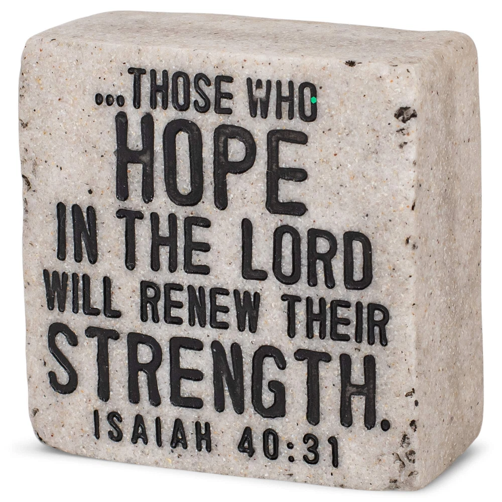 scripture stone block features simple design with deeply encouraging sentiment Features laser engraved sentiment "…Those who hope in the Lord will renew their strength. Isaiah 40:31" Made of reconstructed concrete to simulate natural-cut stone with stone texture Measures approximately 2.25 x 2.25 Inches; Display on a desk, tabletop or shelf arrangement Your purchase helps support orphans and children with special needs in Ghana, Africa