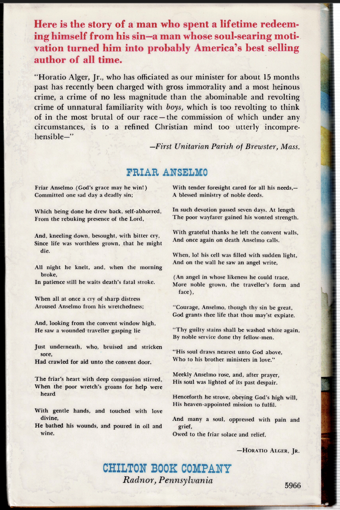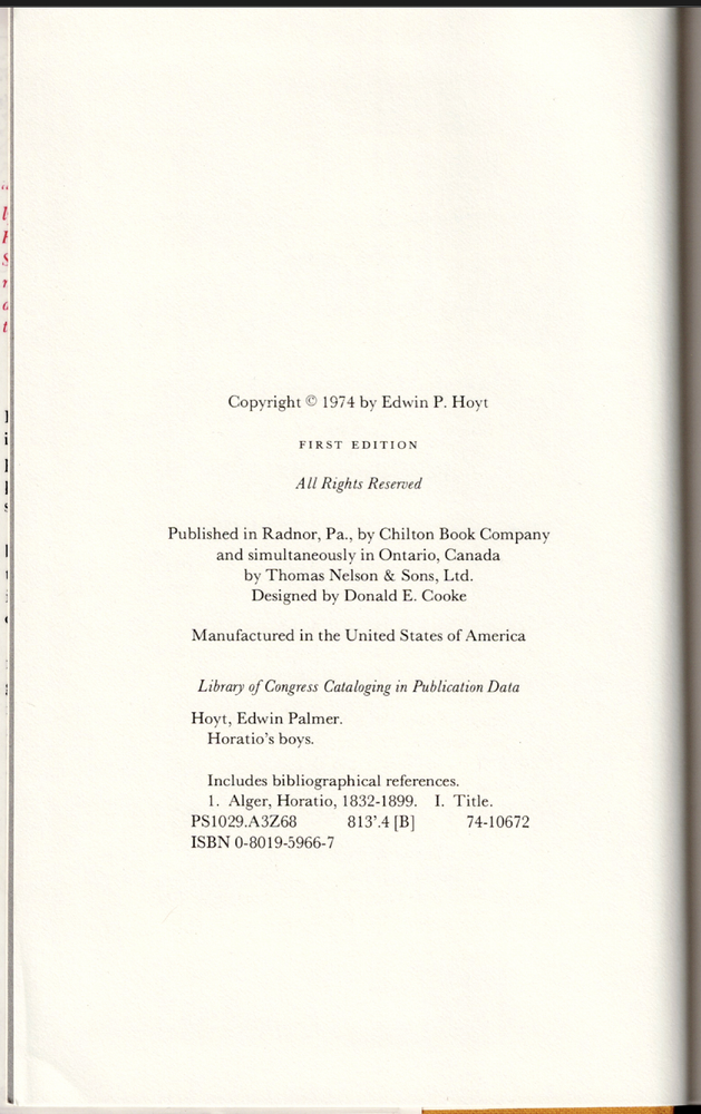 Horatio's Boys - The Life and Works of Horatio Alger Jr. ; by Edwin Hoyt - HC Horatio's Boys - The Life and Works of Horatio Alger Jr. ; by Edwin Hoyt - HC This copy is a first edition in VERY GOOD+ used condition overall. The dust-jacket has light wear, it is now covered in clear, removable, protective film The boards have minimal wear. The binding is in excellent order. The pages are clean, they DO NOT have any names, inscriptions or marking of text. Click here to visit PATRICK ANDREAS QUALITY BOOKS Store Home Page . Listing and template services provided by inkFrog