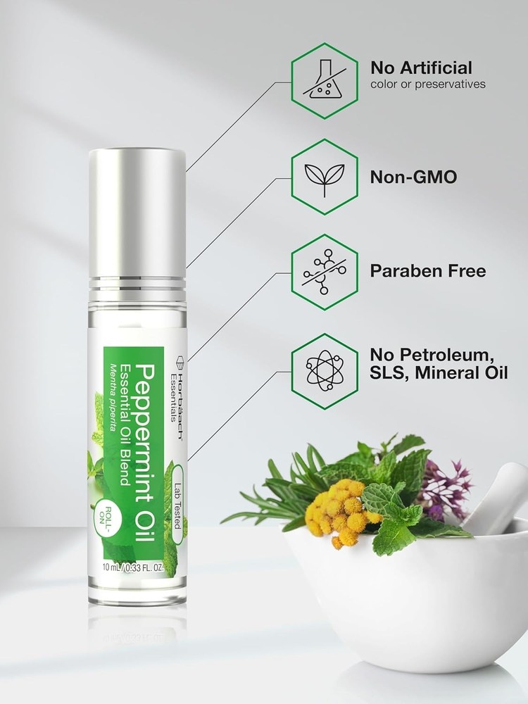 Horbäach Peppermint Oil Roll On Blend | .33 fl oz 0.33 Fl Oz (Pack of 2) Product Details Product Dimensions : 0.77 x 0.77 x 3.3 inches; 2.66 ounces Item model number : CL7079 Manufacturer : Horbaach Country of Origin : USA PEPPERMINT OIL: Now you can satisfy your senses with the refreshing and minty smell of Peppermint! ROLL-ON: Experience your favorite Essential Oils on-the-go, anytime! ADVANCED TESTING: Our formula is lab tested to ensure purity, potency, and quality FREE OF: Parabens, SLS, Petroleum, Mineral Oil, Artificial Color, Preservatives & Non-GMO