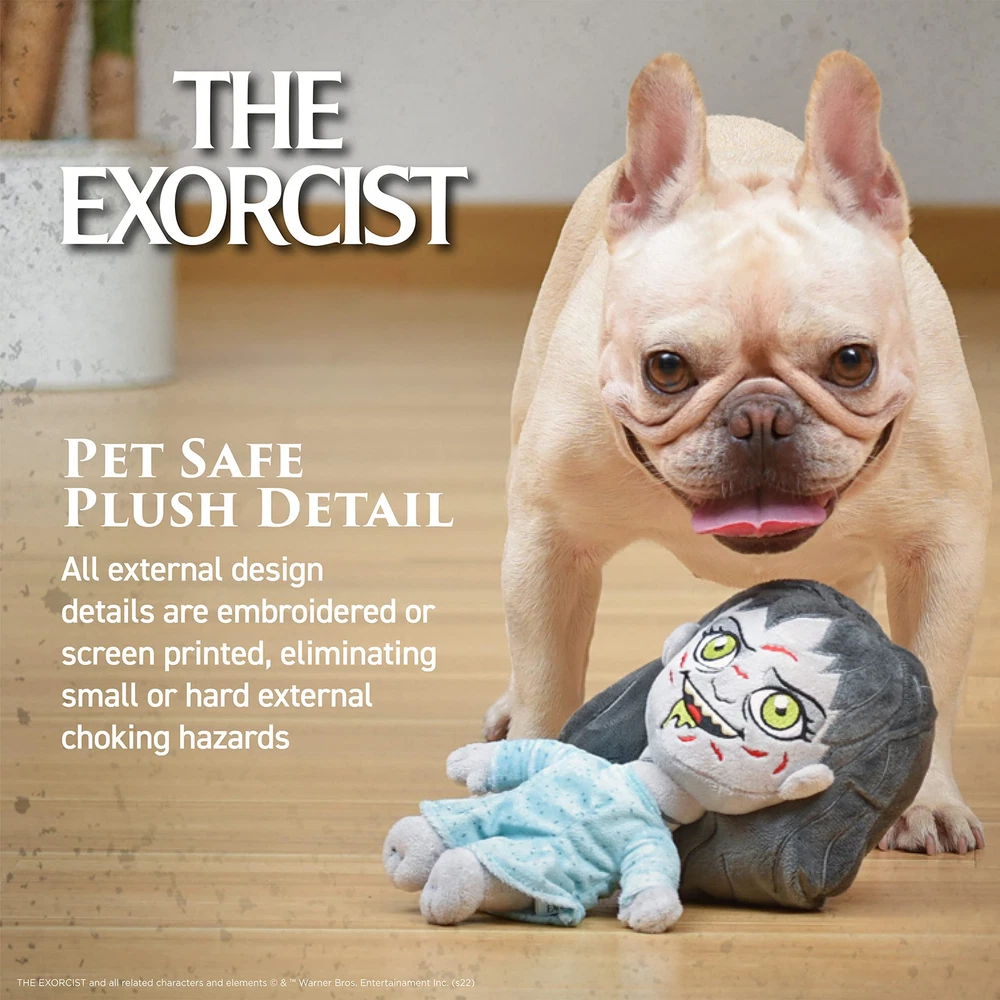 Horror fans, now you can celebrate your love of iconic horror films with the whole family – including your fur-babies! This plush dog toy is inspired by the horror classic film The Exorcist, featuring a possessed Regan, complete with her head spun all the way around on her body! The Exorcist 9” Plush Toy is perfect for afternoons of devilish fun with your pup. This dog toy is perfect to collect for your own fur-baby or to gift to other horror movie fans in your life. This plush dog chew toy is made from soft fuzzy fabric and has an irresistible squeaker inside. This dog toy for The Exorcist lovers features pet-safe plush details, meaning it has no hard plastic, sharp corners, or edges. It’s best for light chewers who love to snuggle, toss, and carry their plush dog toys. All of the design details on this pet plush squeaky toy are either embroidered or screen printed. As with all dog toys, please supervise your pet when they play with this toy. What a great new way for horror fans and their pets to collect The Exorcist! Add these dog toys to your dog’s toybox or make them part of a gift for The Exorcist lovers. For a truly epic puppy playtime for The Exorcist fans, check out our full line of horror film themed dog toys, including other characters and even costumes! For more movie-themed dog and pet toys, apparel, bowls, feeding, and accessories, browse our Fetch for Pets brand . YOUR SATISFACTION IS OUR PRIORITY* If you have any questions or feedback on this product, please reach out to us at Fetch for Pets. © & ™ NLP. © & ™ WBEI. (s21). 9 INCH PLUSH DOG TOY – Small-sized, lightweight plush that is perfect for tossing, carrying, and snuggling PET SAFE PLUSH DETAILS – All external design details are embroidered or screen printed, eliminating small or hard external choking hazards INTERNAL SQUEAKER INCLUDED - Each plush dog chew toy is made from soft fabric and contains an internal squeaker that dogs can’t resist MULTIPLE SIZES TO CHOOSE FROM: Our The Exorcist dog plush toys come in a range of sizes OFFICIAL WB DESIGN – This is an officially licensed WB dog toy for fans of the iconic films