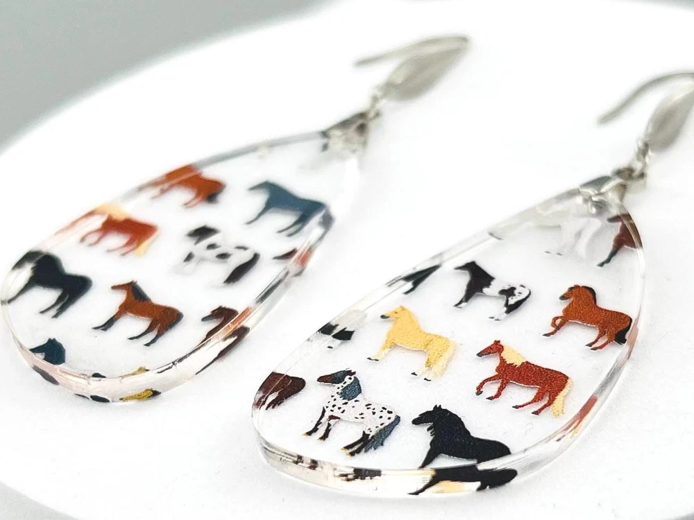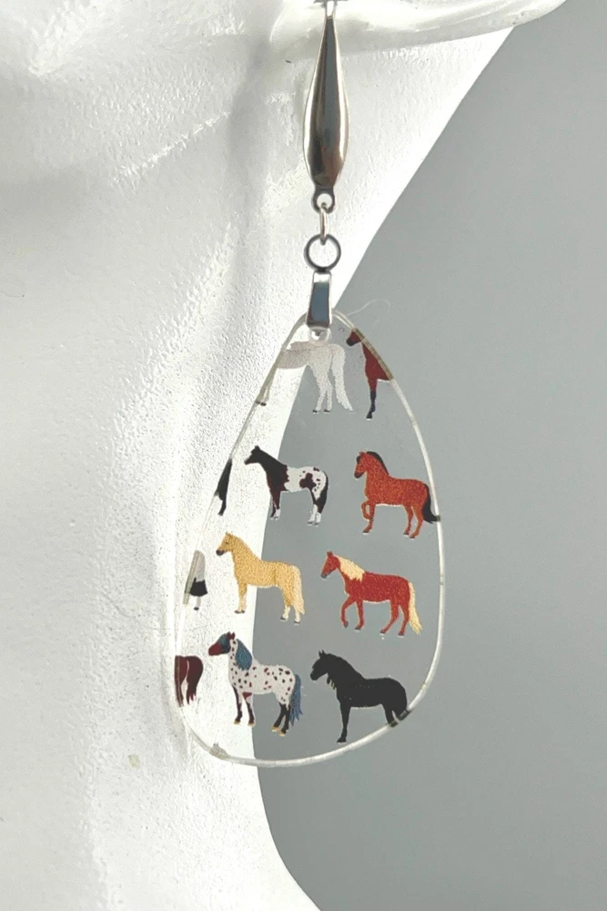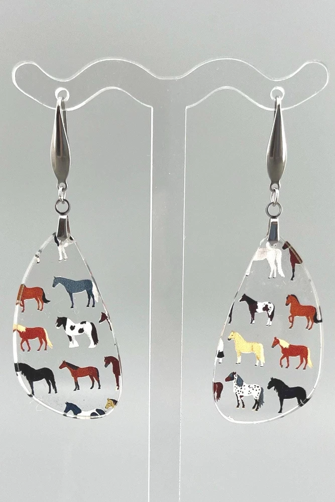 Add a touch of equestrian elegance to your outfit with these stunning Horse Earrings. Perfect for any horse lover, these Western-inspired dangle earrings are a must-have for your jewelry collection. Ideal for rodeo queens, country girls, or anyone who appreciates the beauty of horses. A unique gift for the stylish equestrian in your life. Bring a bit of the stable to your everyday look with these charming Equine Earrings. Lightweight Acrylic Earrings on a Stainless Steel hook. Earring hardware is stainless steel and nickel/lead free. 🌟(Please see item details/highlights/pictures for size information)🌟 Each earring is laser cut from acrylic and assembled by hand in our studio. 🌟Due to variation in the patterns and handmade processes, each earring will vary earring to earring. No two earrings will be identical but will look similar to what is pictured! Each pair of earrings comes on an earring card with silicone backers and packaged in an organza bag. Perfect for gift giving! We currently do not offer more gift-wrapping options. Shipping: All purchases are shipped in a box with tracking so that they arrive safely to you! Currently we only ship to US postal addresses. We have a set standard shipping time of 1-3 business days from the time your order is placed. Everything in our shop is already handmade and ready to ship FAST! Please be aware that unexpected delays can occur, which you will be notified at the time of any such occurrence. Jewelry Care: 🌟Each piece is delicate! Avoid dropping or bending! 🌟Do Not expose to excessive moisture, please remove jewelry before showering, swimming, and sleeping. 🌟Avoid abrasives, perfumes, lotions, excessive heat, chemicals etc. These may deteriorate your jewelry and may damage its appearance. 🌟Clean with the soft cloth we have included in your package (and it is FREE of Charge!) No Returns: Due to hygienic and safety reasons, ALL SALES ARE FINAL. We DO NOT accept returns. In the event you have an issue with your purchase, please feel free to message us on Etsy to discuss any possible resolution.