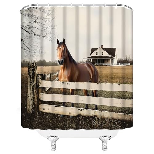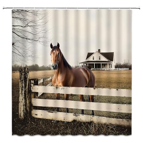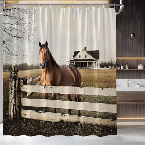 Horse Shower Curtain Rustic Farmhouse Animals Barn Country 70"WX70"H Brown