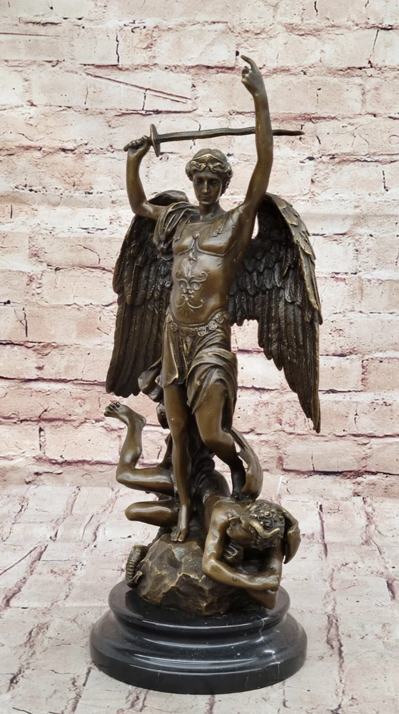 Hot Cast Archangel St Saint Michael w/ Shield Sword Color Bronze Figurine Gift Hot Cast Archangel St Saint Michael w/ Shield Sword Color Bronze Figurine Gift Condition : This sculpture is in perfect condition Bronze Dimensions with Marble Base: Height 15.5" X Width 8" Marble Dimensions: Diameter 6" Height without base:14" Weight:14 LBS Inventory:68Y4628286 Mythical Majesty in Bronze: St. Michael Slaying the Dragon This striking bronze sculpture vividly depicts a mythical figure with a dragon's tail, large wings, and a sword, standing tall with one finger raised in the air. The larger figure, exuding an imposing presence, towers over a smaller winged man who appears both frightened and awestruck, seemingly being stepped over by the dominant figure. The interpretation of this dramatic scene is left to the viewer's imagination – does this figure represent good or evil? The powerful stance and fierce appearance certainly suggest a commanding and formidable presence. Craftsmanship and Symbolism Crafted from 100% solid bronze, this sculpture captures the essence of mythological storytelling and artistic mastery. The intricate details of the figures, from the texture of the wings to the tension in their poses, highlight the artist's skill and attention to detail. The larger figure's dominating posture over the smaller winged man evokes a sense of power and conflict, inviting viewers to ponder the underlying narrative. A Statement Piece for Any Space Mounted on a black marble base, the sculpture gains a sense of weight and importance, enhancing its overall impact. Whether you are an art collector, a mythology enthusiast, or simply someone who appreciates the beauty and craftsmanship of bronze sculptures, this piece is sure to impress. It stands as a stunning work of art that adds character and depth to any space it occupies, making it a focal point and conversation starter. Signed Carpeaux Good Vs Evil Angel Striking Devil Bronze Marble Sculpture Statue www.bronzhaus.com Video will open in a new window Using the eBay App? Paste link into a browser window: [isdntekvideo] Shipping Terms : Most of our items are shipped via USPS (United States Postal Service) mail or UPS. Most orders are shipped within 24-48 hours of purchase. Please be aware that not all items are available for USPS shipping due to size and weight. We do ship to Hawaii, Alaska, Canada, Puerto Rico, APO/AE, and U.S. Virgin Islands, however, an additional charge may be required. Please contact us before making any purchases in these areas. For Non-USA customers, you may be responsible for all duty, tax, brokerage fees that may be due upon delivery (shipping costs cover freight charges only). We also ship internationally. Please refer to the "Shipping and Handling" chart for the rates for each area. Payment : We accept just about any form of payment. PayPal, Master Card, Visa or American Express credit cards. Money orders, cashiers checks, and even personal or business checks. For governmental institutions, we will also accept a purchase order. Please understand that for personal or business checks we have to wait for the check to clear (usually 7 days) before shipping. Condition : New Detailed Hand Crafted Hot Cast Bronze Satisfaction Guaranteed. This is Stock Photo, Slight Color Variation!! Listing and template services provided by inkFrog