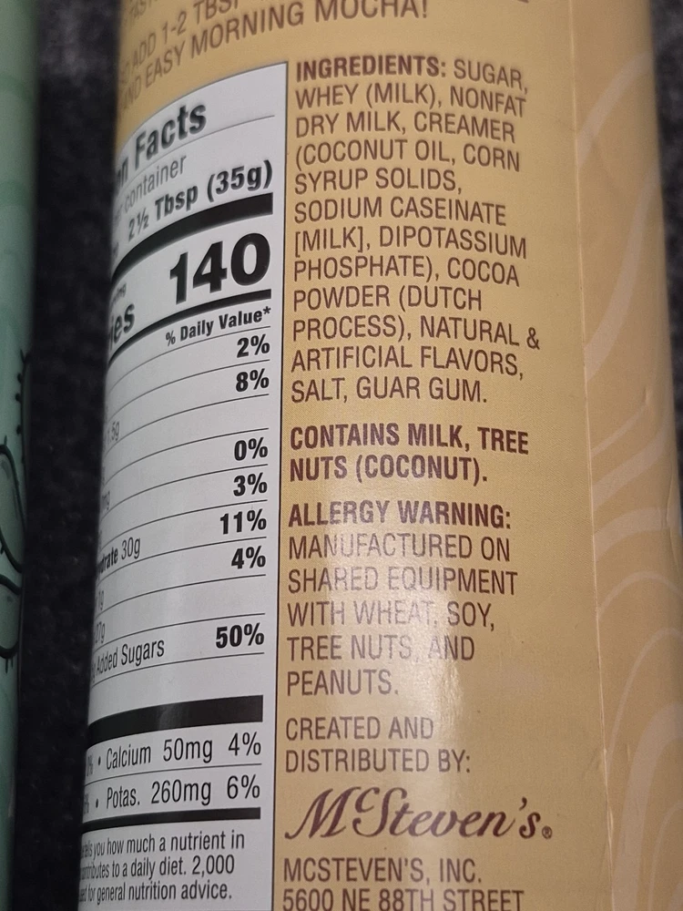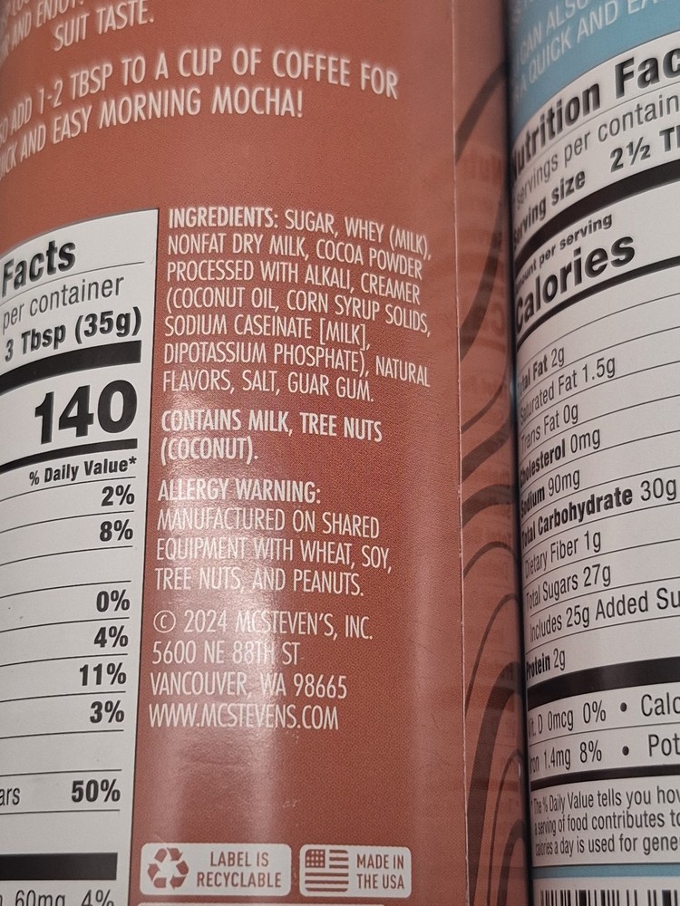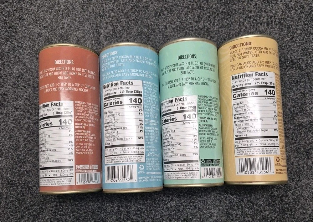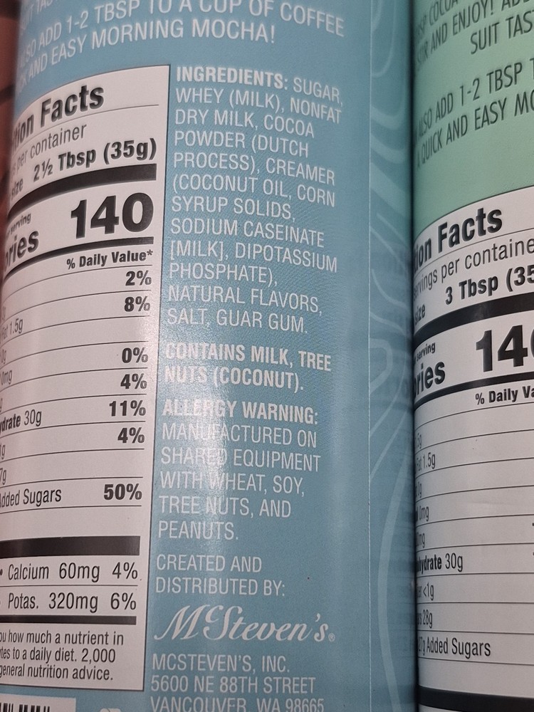 Allergens: see pictures MPN: none Number of Servings: see pics Type: Chocolate Drink Product: Hot Cocoa Mix Food Specifications: Made with real Sugar Expiration Date: 05/27 Flavor: Milk Chocolate UPC: 010532735622 Country/Region of Manufacture: United States Calories per Serving: 140 Brand: Mac Steven's Item Weight: 9oz. each can gtin13: 010532735622 Food Aisle: Pantry Serving Size: 2.5 tbsp