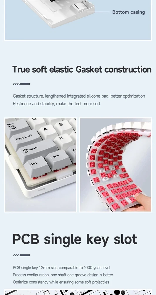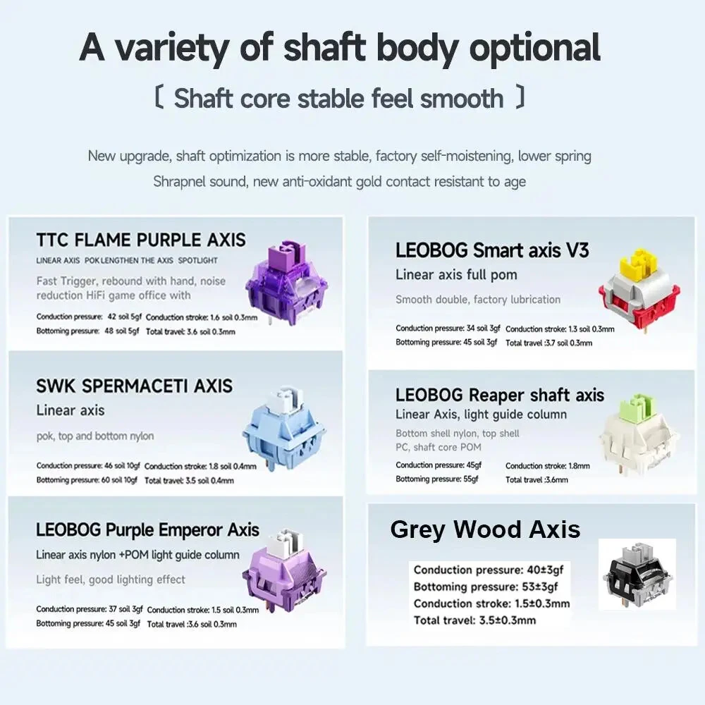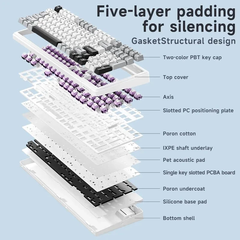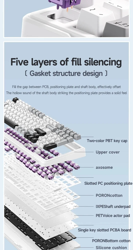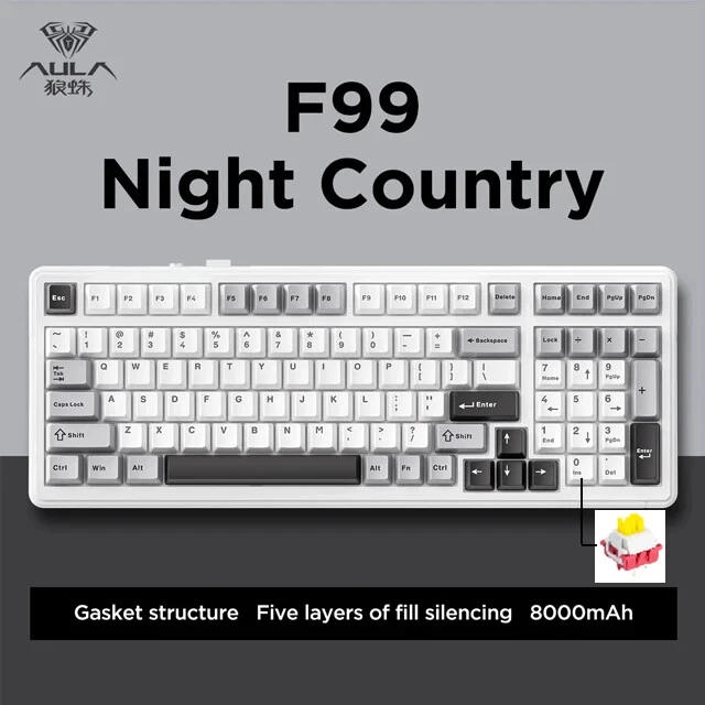 • Mechanical Operation : Experience seamless gaming with the Aula F99 Mechanical Keyboard, designed for gamers who demand high performance and responsiveness. • Bluetooth Wireless Connectivity : This keyboard offers Bluetooth wireless connectivity, ensuring you can game uninterrupted whether you're using a PC or a laptop. • Three Modes : The Aula F99 comes with three modes - wired, Bluetooth, and hot swap, giving you flexibility and convenience in your gaming setup. • PBT Gasket RGB : Equipped with PBT gasket RGB, this keyboard not only delivers superior comfort but also adds a stylish touch to your gaming setup. • 98 Keys Standard : With its 98 keys standard, this keyboard provides a complete typing experience, making it perfect for both gaming and office use. • Multilingual Support : The keyboard supports English, Chinese, and other languages, catering to a global user base. Multi-Device and Tri-Mode Wireless Connectivity: Bluetooth 5.0 & 2.4G & Type-C Cable AULA F99 supports USB wired, 2.4G wireless and Bluetooth 5.0 connection,a convenient and versatile option for users who use multiple devices and want a keyboard that can easily switch between different modes.It‘s compatible with Laptop, iPad, IOS, Windows, Mac or Android. No fussy connection process!An indicator light on the right side of the keyboard shows the state of the battery. Grey wood Switch Shaft Material:POM Shaft Type:Linear Shaft Total Stroke:3.6-0.3mm Initial pressure:30 gf Min Conduction stroke:1.50.3mm Conduction pressure:40±3 gf Bottom pressure: 53±3 gf Mechanical life: approx. 60 million cycles Nimbus V3 Switch Shaft Material: POM Shaft Type:Linear Shaft Total stroke:3.7±0.3mm Initial pressure:28 gf Min Conduction stroke:1.3±0.3mm Conduction pressure:34±3gf Bottom pressure:45±3gf Mechanical life: approx. 60 million cycles AULA F99 Mechanical Keyboard Specification: -Connection: Type-C wired & 2.4G Wireless & Bluetooth - Keys: 99 keys -Hot swapable: 3-pin/5-pin hot-Exchange - Backlight: RGB Back Light - Profile: Cherry profile -Product size:390.63X146.78 × 42.57mm - Product weight: Approx.1132g (without cable/receivery/Approx.1183g (with cable/receiver) - Rated Voltage:DC 3.7V(Full 4.2V) - Capacity:8000mAh(2*4000mAh) rechargeable Li-ion Battery - Charging Voltage/Current:DC 5V/= 830mA - Rated current: 150mA @3.7V (default light effect)/20 mA(off all lights) - Endurance:Approx.53 hours (default light effect)/Approx.400 hours (all lights off) - Operating system: WIN XP/7/8/10/Android/IOS/MAC - with software Gasket Structure with 5-layer noise reduction F99 is a high-end gasket-mounted keyboard with a PC plate. The keyboard also has a 5-layers premium silicone pads and noise reduction cotton to reduce 95% hollow noise,abosord typing noise,and enhance the unique soft and comfortable rebound of the Gasket structure. RGB backlight & Programmable software AULA F99 has multiple RGB backlit modes that you can easily switch with simple shortcuts. You can make your RGB effects with the included software. With the software, all kinds of keyboard key functions could be set, macro recorded, and personalize your function keys as you wish. The onboard flash memory unit could save the configuration to the keyboard if offline. Large capacity battery,excent endurance AULA F99 equipped with built-in 8000mhA capacity lithium battery, which can be charging through the Type-C cable while using in wired mode. When fully charged, it lasts 53 hours with the lights on, and about 400 hours with the light off. Cherry Profile PBT Meterial Double Shot Keycaps PBT keycaps is much higher than ABS material in durability, and the surface will not be shiny after long-term use, bringing a comfortable operating experience. Hot Swappable PCB, Compatible with 3Pin/5Pin Switch F99 is equipped with hot-swappable PCB to ensure free replacement or change of switches. It is compatible with most 3-pin and 5-pin mechanical switches. Pre-installed the pre-lubed custom switches providing unrivaled tactile responsiveness with up to 50 million keystroke lifespan. Side features designed for easy switching The three-mode switching and receiver storage slot are located above the keyboard. Side switching does not require flipping.which is simple and elegant. Height adjustable, to perfectly fit your comfort. With two-stage adjustable foot support design,you can autonomously adjust the bottom with non-slip rubber pads at the bottom of theinput angle of your preference, bringing a more stable use experience.