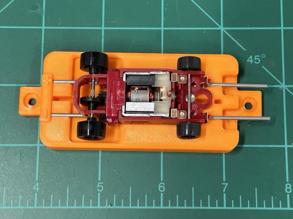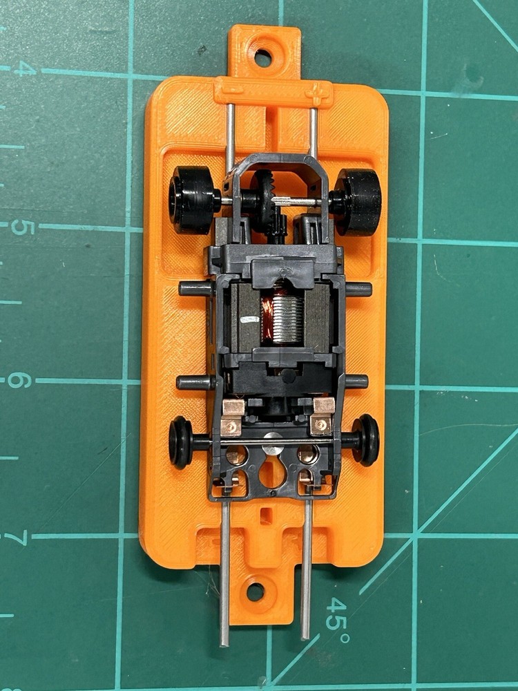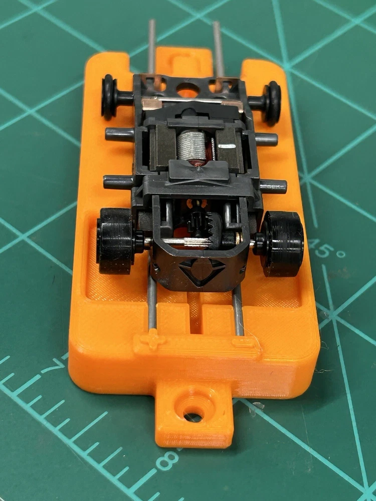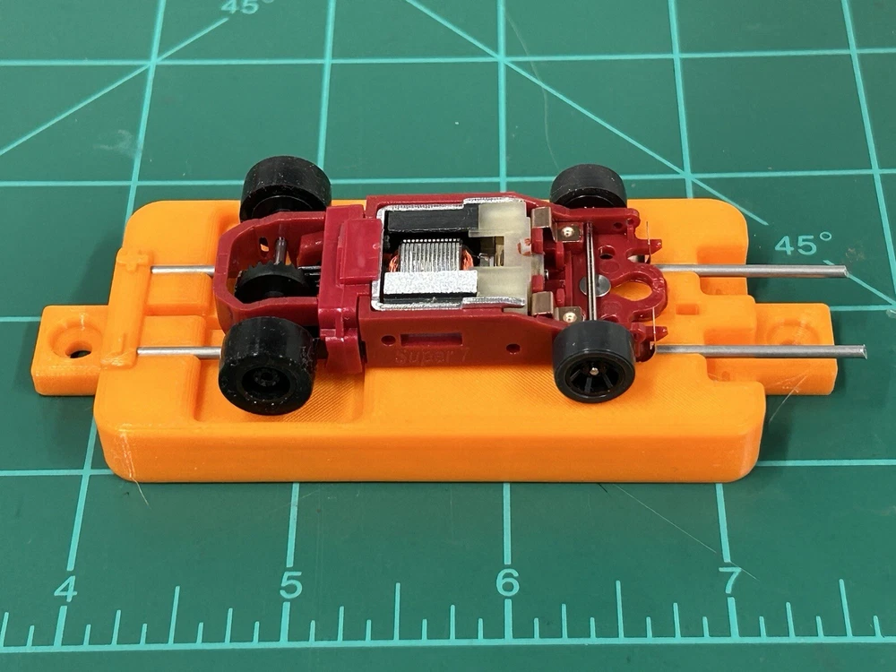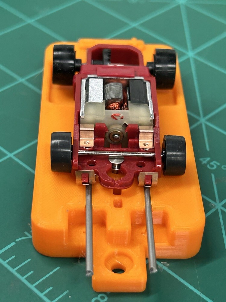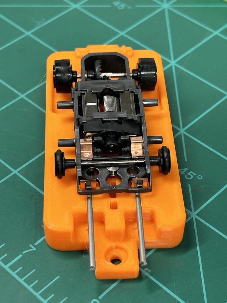 This is for SLOT CAR New style break in stand works with or without body fits many Chassis including HC slots Super 7 , Viper , Tyco AFX and many more just hook to a 9v battery or a power supply to run chassis for warm up or break in . Stand ONLY chassis are for display only. Condition is New color may vary Other colors availble See other auctions or message me