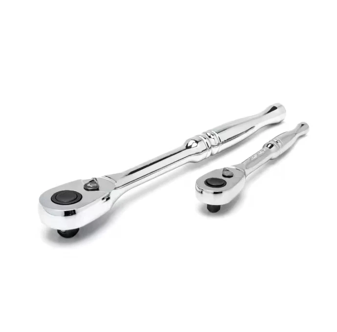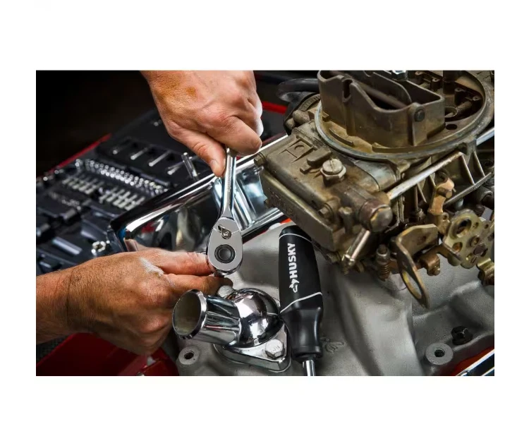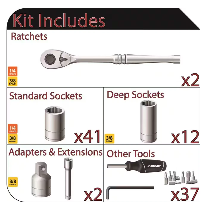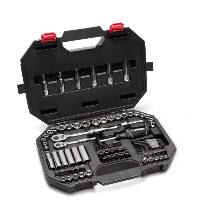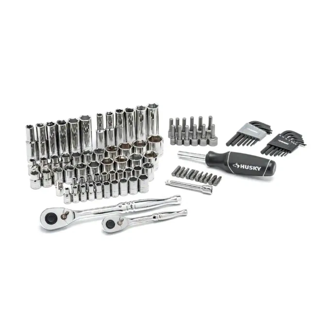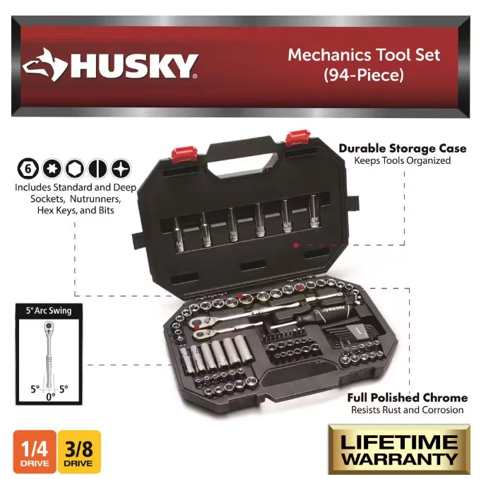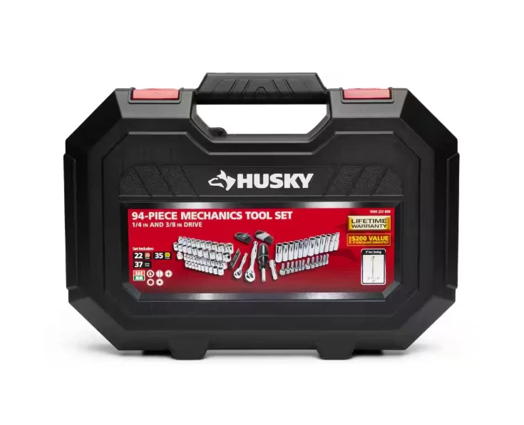 Hot Sale! Mechanics Tool Set (94-Piece) - Model H94MTS About This Product The Husky 94-Piece Mechanics Tool Set is a perfect set for the home DIYer or professional mechanic. The 53 different standard and deep sockets allow you to tackle a range of general fastening or repair projects. Sockets feature chamfered lead-ins to help provide fast and easy placement onto drive tools and fasteners. Set also includes 37 accessories, two extensions, two ratchets, and a storage case to keep it all organized. Compact and versatile for nearly any job, this mechanics tool set features an assortment of 1/4 in. and 3/8 in. drive sockets as well as accessory and drive tools for ultimate convenience. The 72-tooth ratchets need only 5° to turn a fastener, for hard to reach areas. For a complete product listing, see specification document. Highlights 94-piece set includes 1/4 and 3/8 in. drive quick-release ratchets, 21 standard length 1/4 in. drive 6-point sockets, 20 standard length 3/8 in. drive 6-point sockets, 12 deep 3/8 in. drive 6-point sockets, and 39 other accessory and drive tools 72-tooth ratchets need an only 5° arc swing to turn fasteners Quick-release button allows sockets and drive tools to be easily removed from the ratchet Full polished chrome finish easily wipes clean of oil and dirt Forged from chrome alloy steel sockets for outstanding durability and strength Sockets feature chamfered lead-ins help to provide fast and easy placement onto drive tools and fasteners Sockets are designed with off-corner loading to help prevent the rounding of fasteners Chrome finish provides corrosion resistance and added durability Large, hard-stamped size markings allow for easy readability Hex keys, screwdriver, and nut driver bits are formed from heat-treated S2 tool steel for added strength and wear protection Plastic storage case is stamped with size markings for easy identification and organization