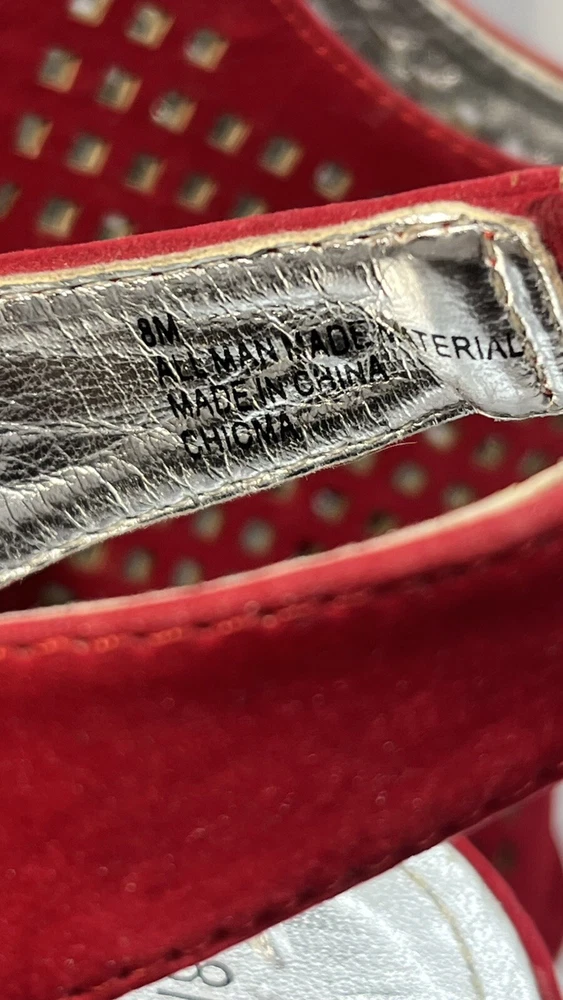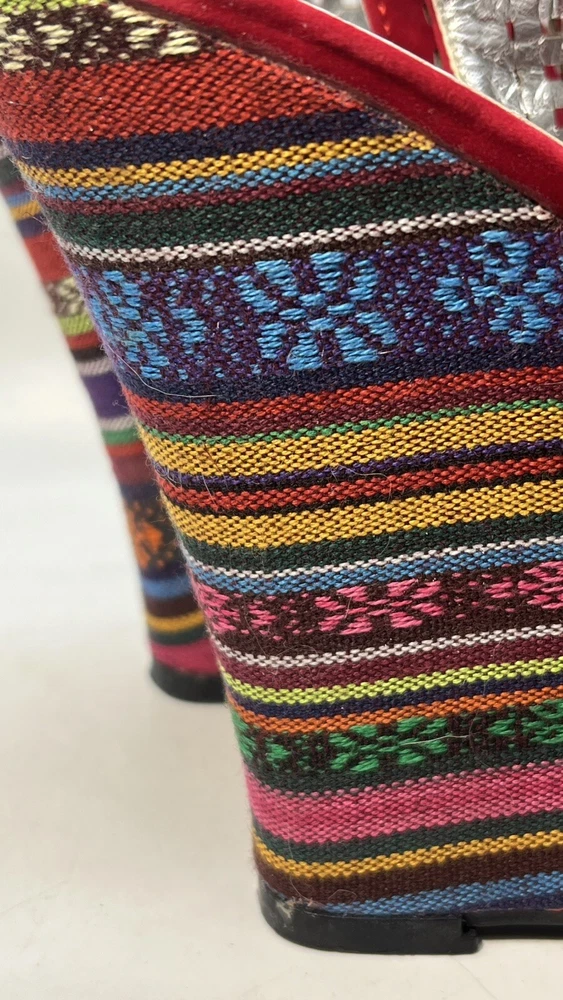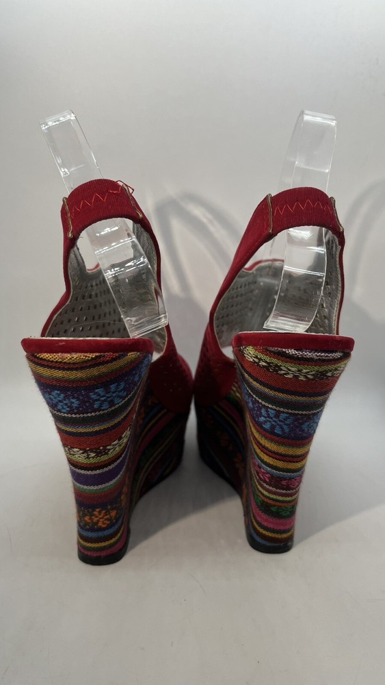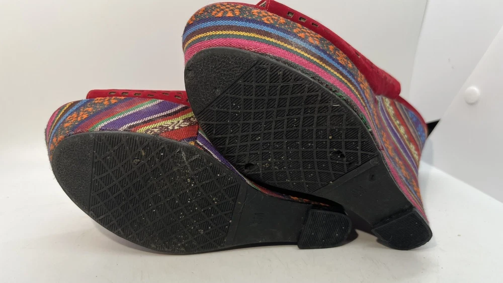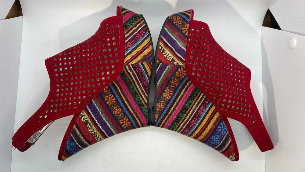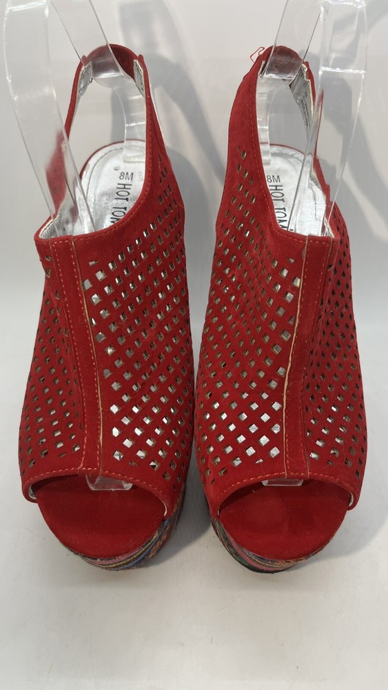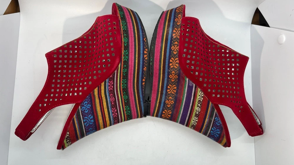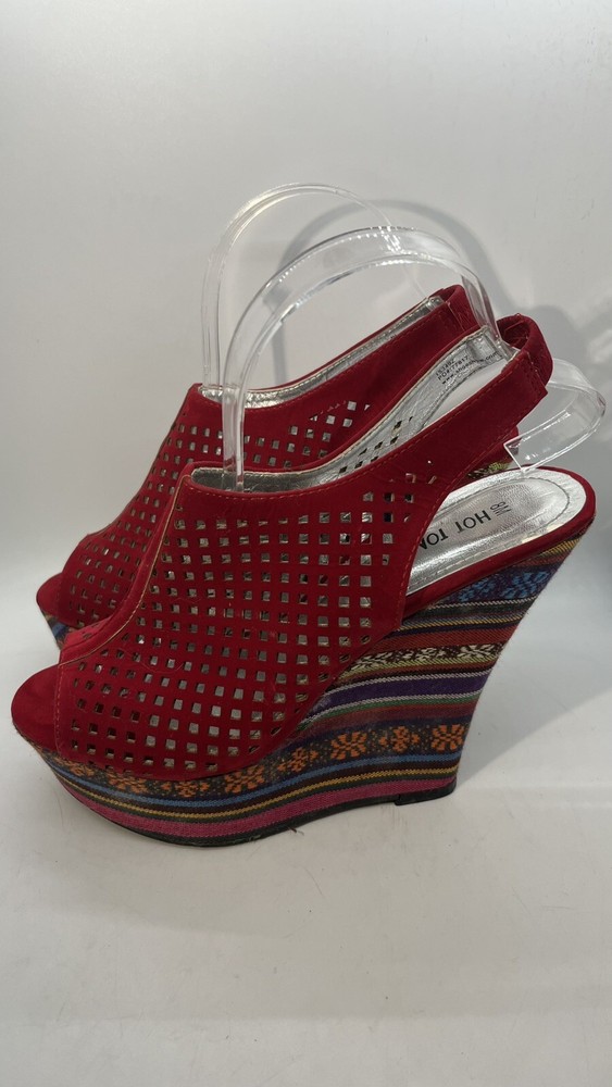 Elevate your shoe game with these stunning Hot Tomato wedges! Perfect for any occasion, these red faux suede shoes feature a peep toe and a 1.5" platform height, making them both stylish and comfortable. The geometric pattern adds a touch of bohemian flair, while the whimsy and fairytale theme make them perfect for any festival or going out event. These shoes are versatile enough to be worn for casual outings or parties and cocktails. With a M shoe width and a US shoe size of 8, they are perfect for women who want to make a statement with their footwear. Don't miss out on the opportunity to add these unique wedges to your collection!
