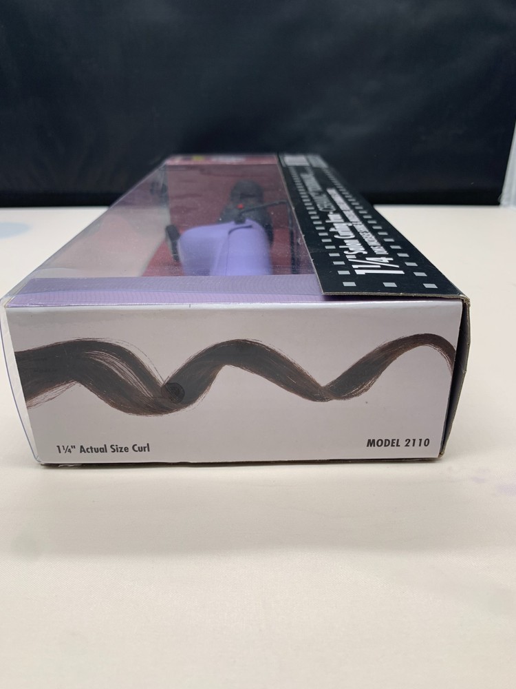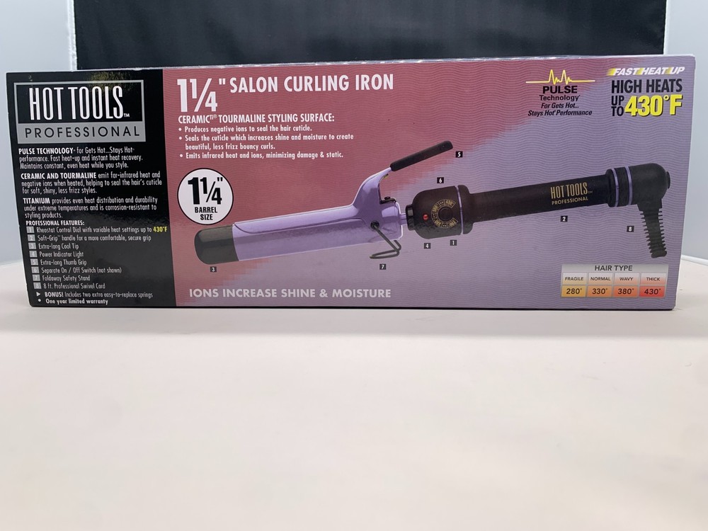 The Hot Tools 1 1/4 Inch Salon Ceramic Tourmaline Curling Iron Pro #2110 PURPLE is a hair styling tool designed to create soft, shiny, and frizz-free curls . It features ceramic and tourmaline plates that emit far-infrared heat and negative ions to seal the hair cuticle, protecting hair while styling. The curling iron has a variable heat setting up to 430 degrees Fahrenheit and includes a rotating cool tip for faster curl wrapping