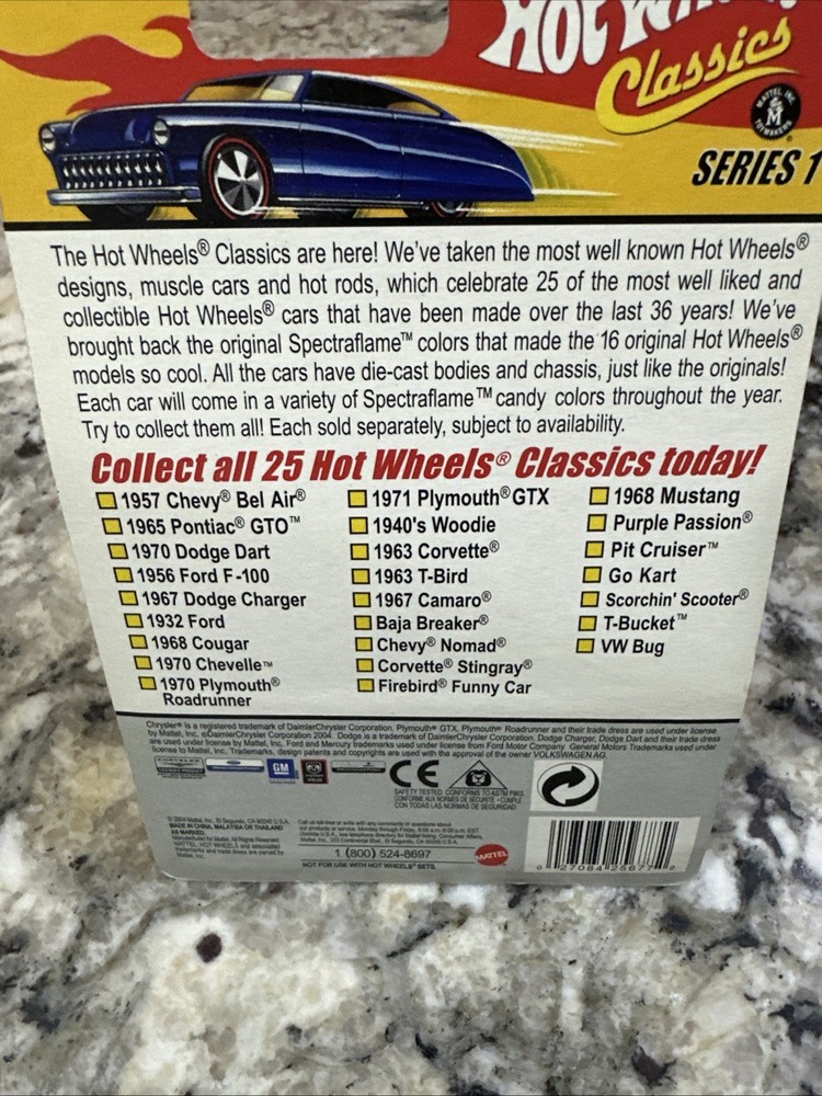 Autographed:NoFeatures:Limited Edition, Unopened Box, Special PaintCustomized:NoColor:PurpleVehicle Type:CarMaterial:DiecastRecommended Age Range:8+Series:Hot Wheels ClassicsGender:Boys & GirlsCharacter Family:Classics Series #1Year of Manufacture:2004Scale:1:64Vehicle Year:2004Country of Origin:ThailandBrand:Hot WheelsVehicle Make:Hot WheelsModel:T-Bucket
