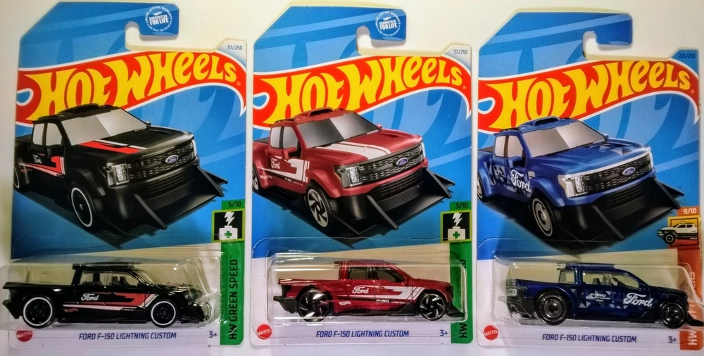 This lot includes three Hot Wheels Ford F-150 Lightning Custom trucks in black, red, and blue colors. These 1:64 scale diecast trucks are from the HW Green Speed series and are unopened in their original boxes. The trucks feature the Ford F-150 Lightning Custom model and were manufactured in 2024. The Hot Wheels brand is known for its high-quality diecast vehicles, and this lot is no exception. These trucks are perfect for collectors or children who love toy vehicles. Don't miss out on the chance to add these sleek and stylish trucks to your collection.