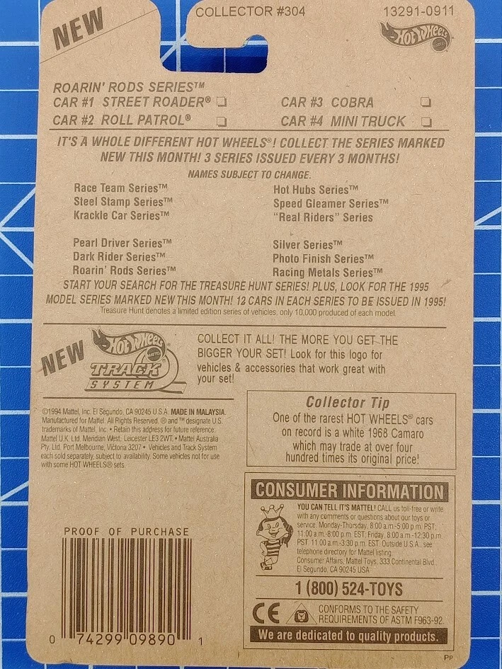 Hot Wheels Roll Patrol Roarin' Rods Series #13291 New NRFP 1994 White/Black 1:64