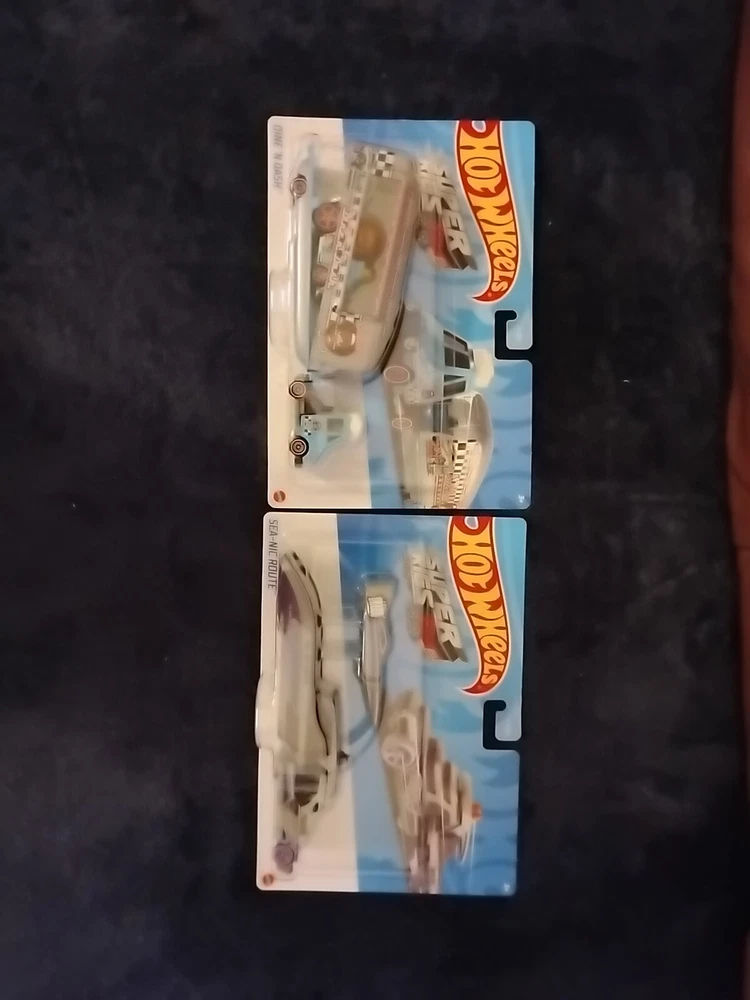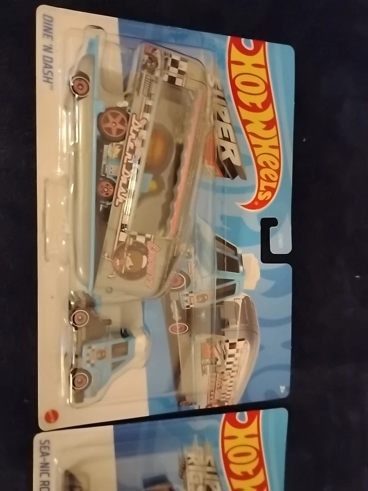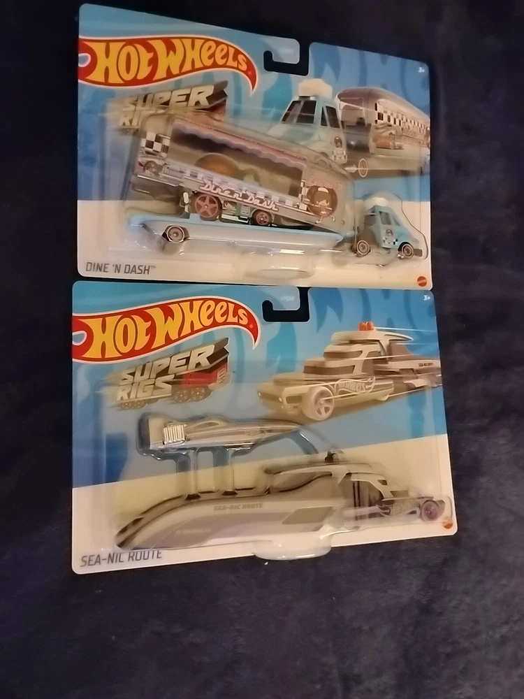 This Hot Wheels Super Rigs Dine 'N Dash, and SeaNicRoute toy trucks is perfect for collectors and kids alike. With its blue color and silver and purple 1:64 scale, these car transporters is a must-have for any Hot Wheels enthusiast. The detachable trailer truck adds an extra level of playability to the toy, making it a great addition to any toy collection. The vehicle type is a car transporter, and it is part of the Hot Wheels Super Rigs series. This toy is perfect for those who love contemporary manufactured diecast and toy vehicles. Cards may have minor issues due to shelving, refer to pictures for detail, however these are in very good condition, practically mint.