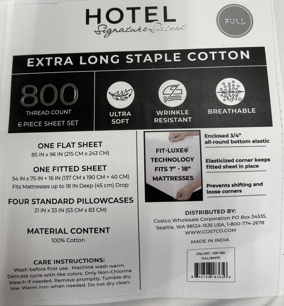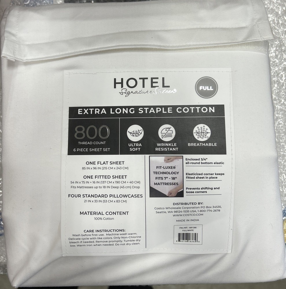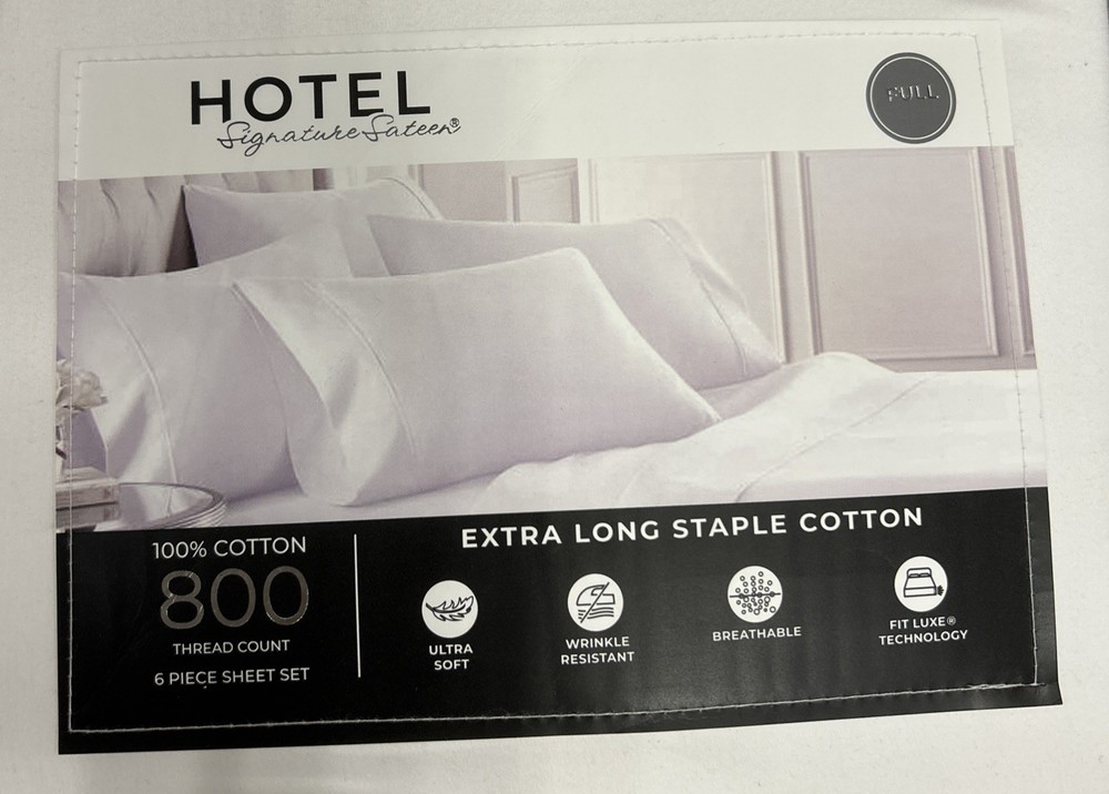 Hotel Signature 800 Thread Count Cotton 6-piece Sheet Set - White - Full Size. PREOWNED - WELL PACKAGED - CUSTOMER RETURN FROM WHOLESALE CLUB - GREAT CONDITION - FREE SHIPPING The Hotel Signature 800 Thread Count Cotton 6-piece Sheet Set in white, full size, offers a luxurious and modern touch to any bedroom. Made from high-quality cotton with a thread count of over 800, these rectangular sheets are not only stylish but also breathable and easy to care for with machine wash instructions. The solid color and deep-fitted design add a touch of elegance, perfect for adult guests seeking comfort and sophistication in their sleeping space. This sheet set is a great addition to any home looking to upgrade their bedding to a higher standard of quality and style.