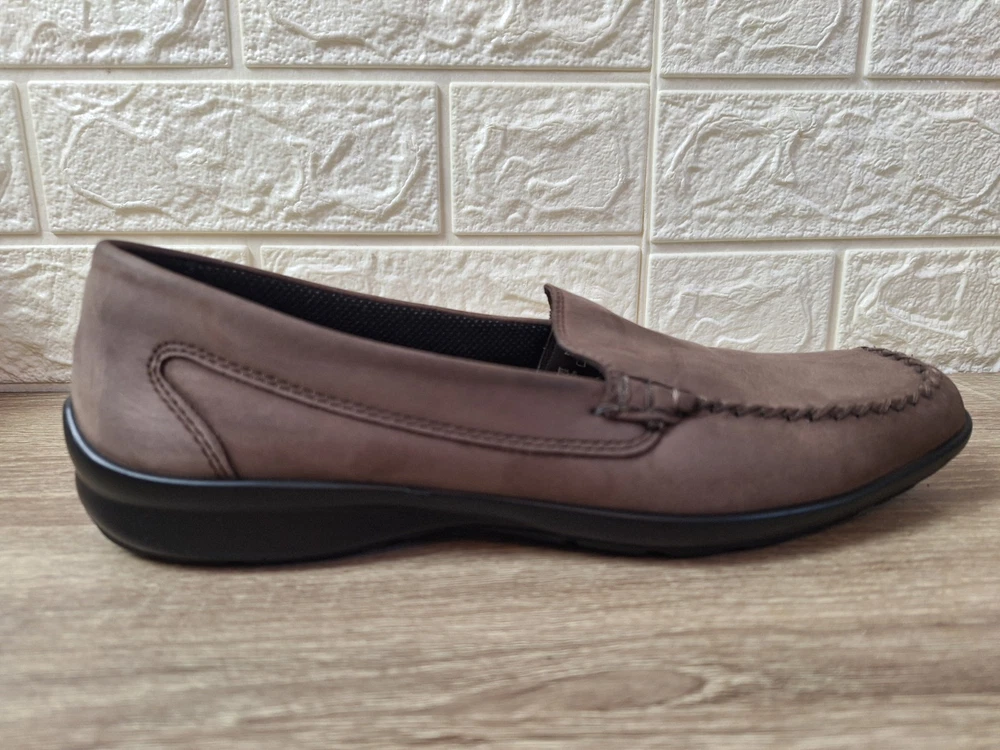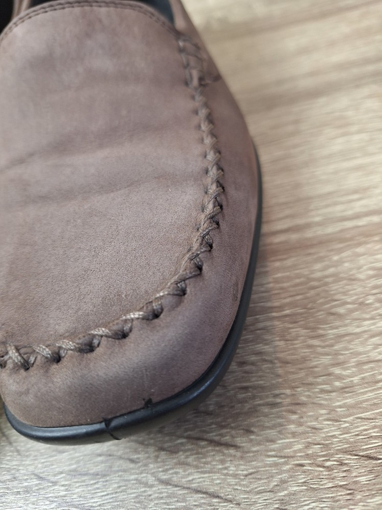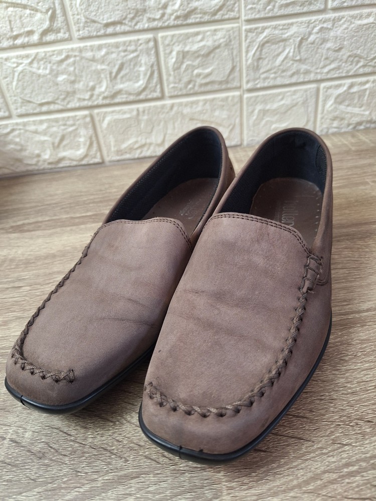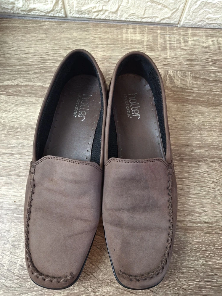 These Hotter "Retro" loafers are crafted from soft nubuck leather in a versatile brown shade. Designed for maximum comfort, they feature a classic slip-on style with attractive whipstitch detailing around the toe. Condition: Excellent pre-owned condition with very minor signs of wear. There are two very small marks on one shoe (hardly noticeable), which are highlighted in the final close-up photo. Measurements: Size: UK 7 / EU 41 / USA 9 Width: Standard (STD) Obv
