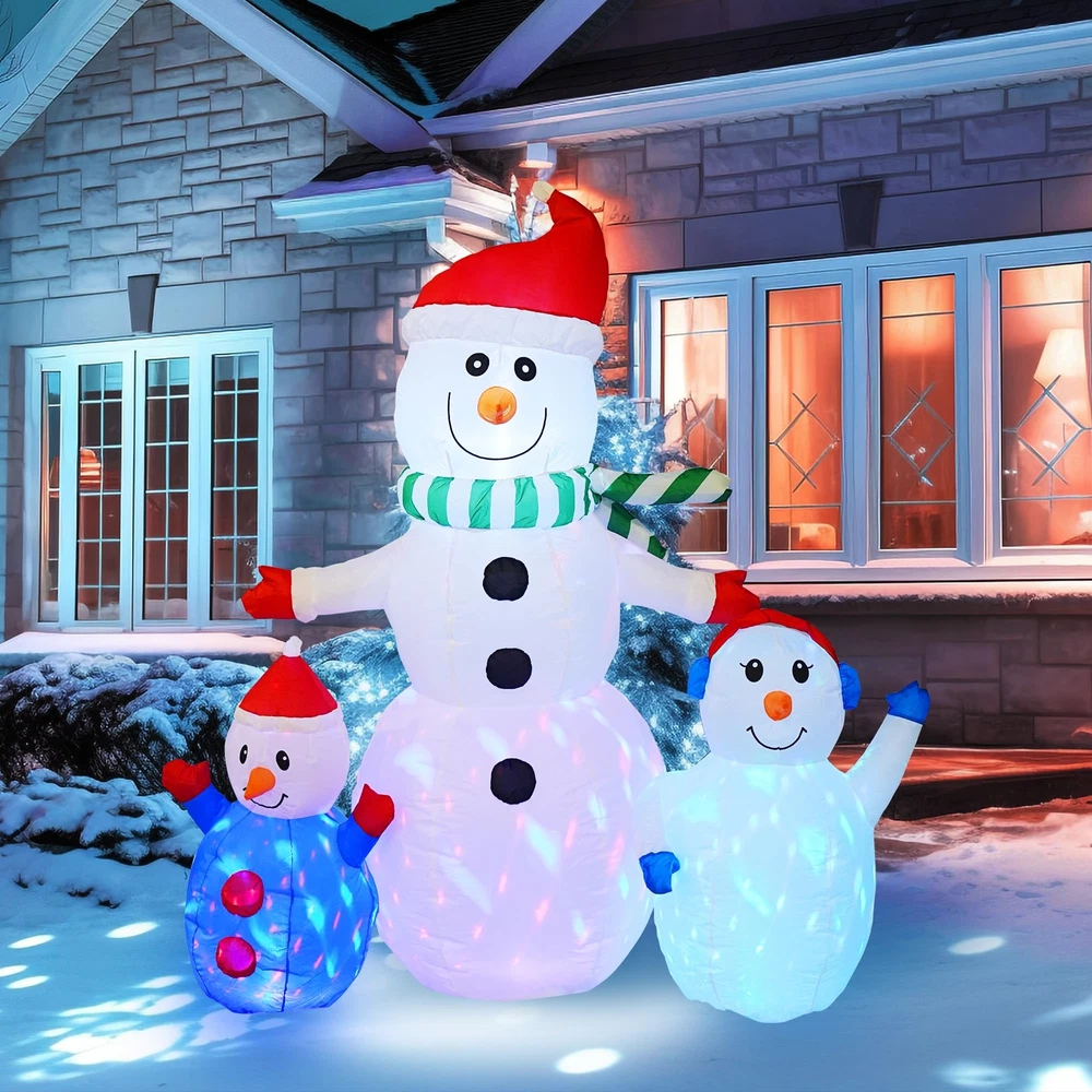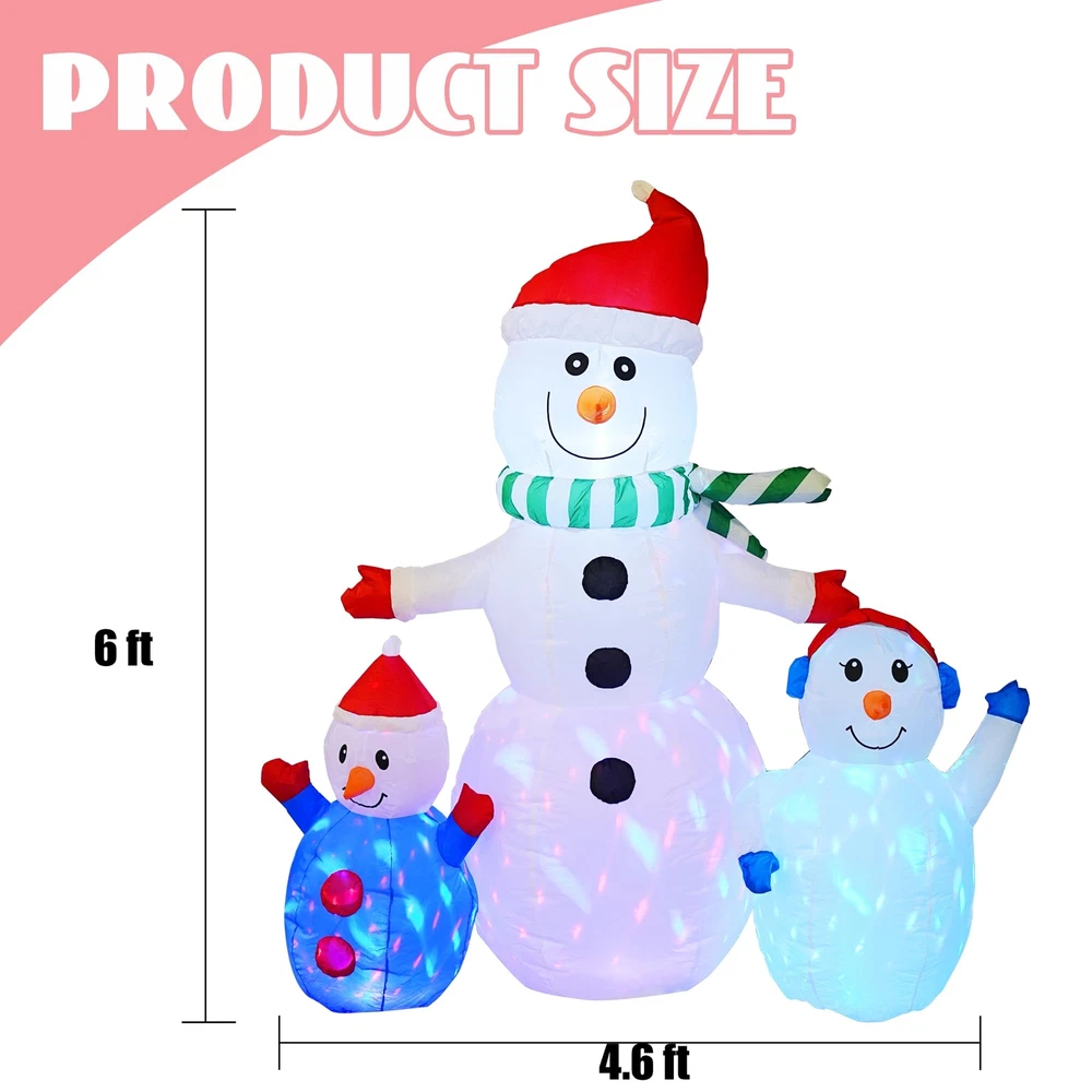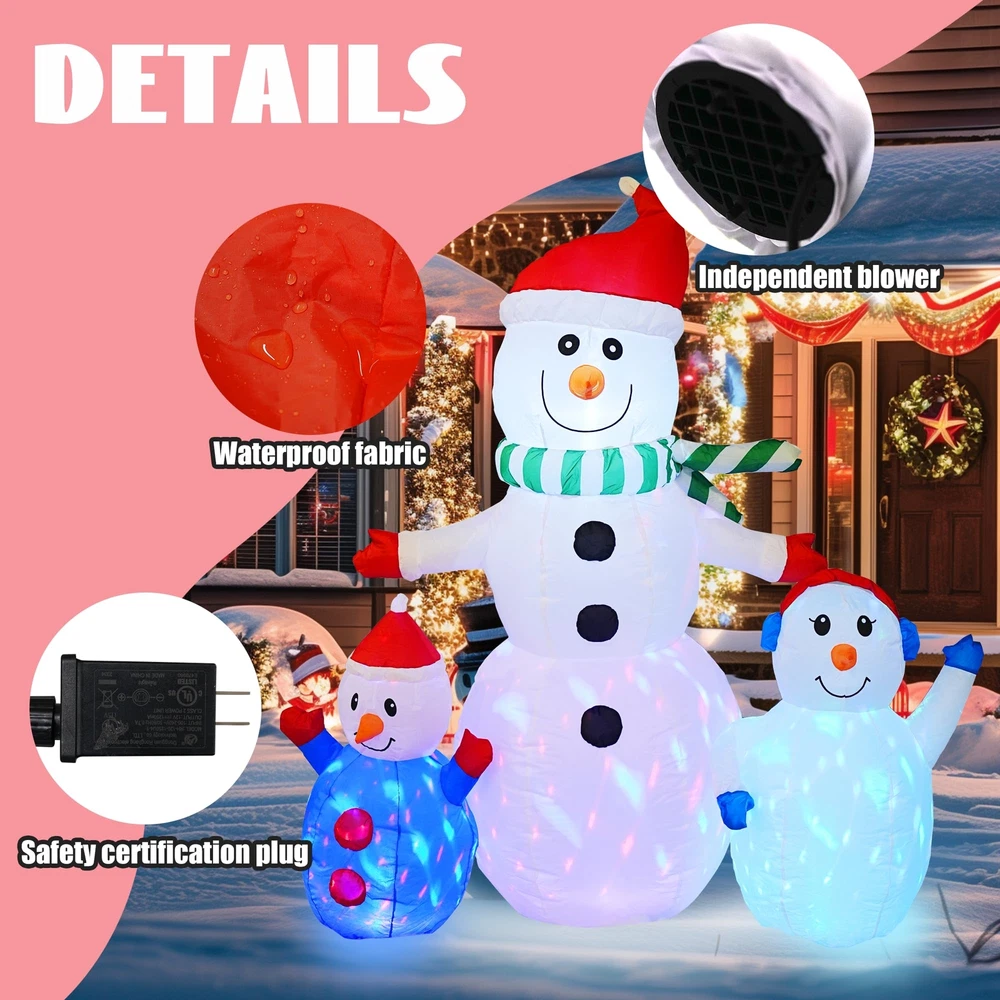 Warm Embrace Design: Our trio of inflatable snowmen exudes a welcoming charm with outstretched arms, as if offering a warm hug. The base is adorned with rotating LED lights that cast a beautiful glow, enhancing the snowman's presence and making the night view enchanting. Colorful Rotating LED Lights: The interior of the inflatable snowman houses bright, colorful LED lights that create a mesmerizing atmosphere, especially during the evening hours. The lights dance around the snowman, evoking a sense of wonder and magic. Robust and Secure: Equipped with built-in 4 stakes and 2 tethers, our inflatable snowman is designed for stability and ground security. Crafted from high-strength, waterproof polyester that resists fading, it stands up to light rain and is suitable for both indoor and outdoor festivities. Effortless and Safe Inflation: Our snowman comes with a powerful built-in blower for quick inflation. Simply zip up the closure at the bottom, connect it to a power source, and watch as the inflatable expands to full size in under a minute, ensuring a safe and user-friendly experience. Ultimate Christmas Charm: This inflatable snowman is the epitome of winter joy and the quintessential outdoor Christmas decoration. It's perfect for adorning gardens, yards, and indoor spaces, creating a festive atmosphere that brings happiness and warmth to the holiday season.