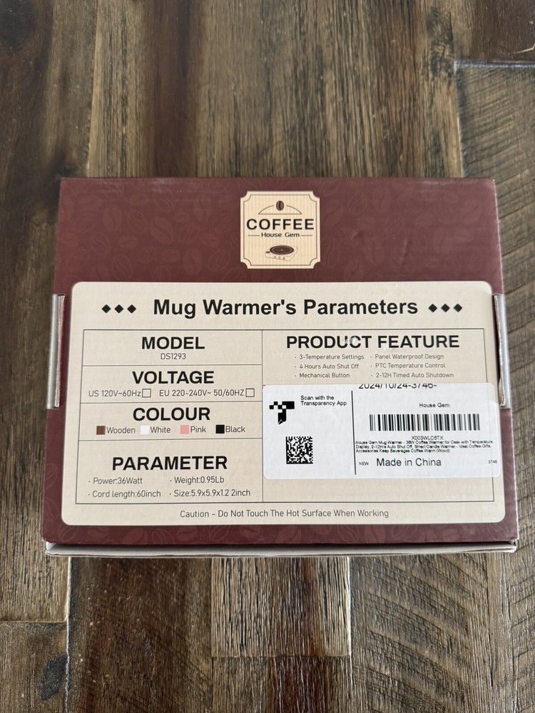 House Gem Mug Warmer is a 36W coffee mug warmer designed for desks. It has a temperature display feature and comes in a wood color. The package dimensions are 7.99x6.61x1.65 inches, and the size of the warmer is 5.86x5.86 inches. The product weighs 1.06 pounds and is suitable for keeping your favorite beverage warm while you work or relax at your desk.