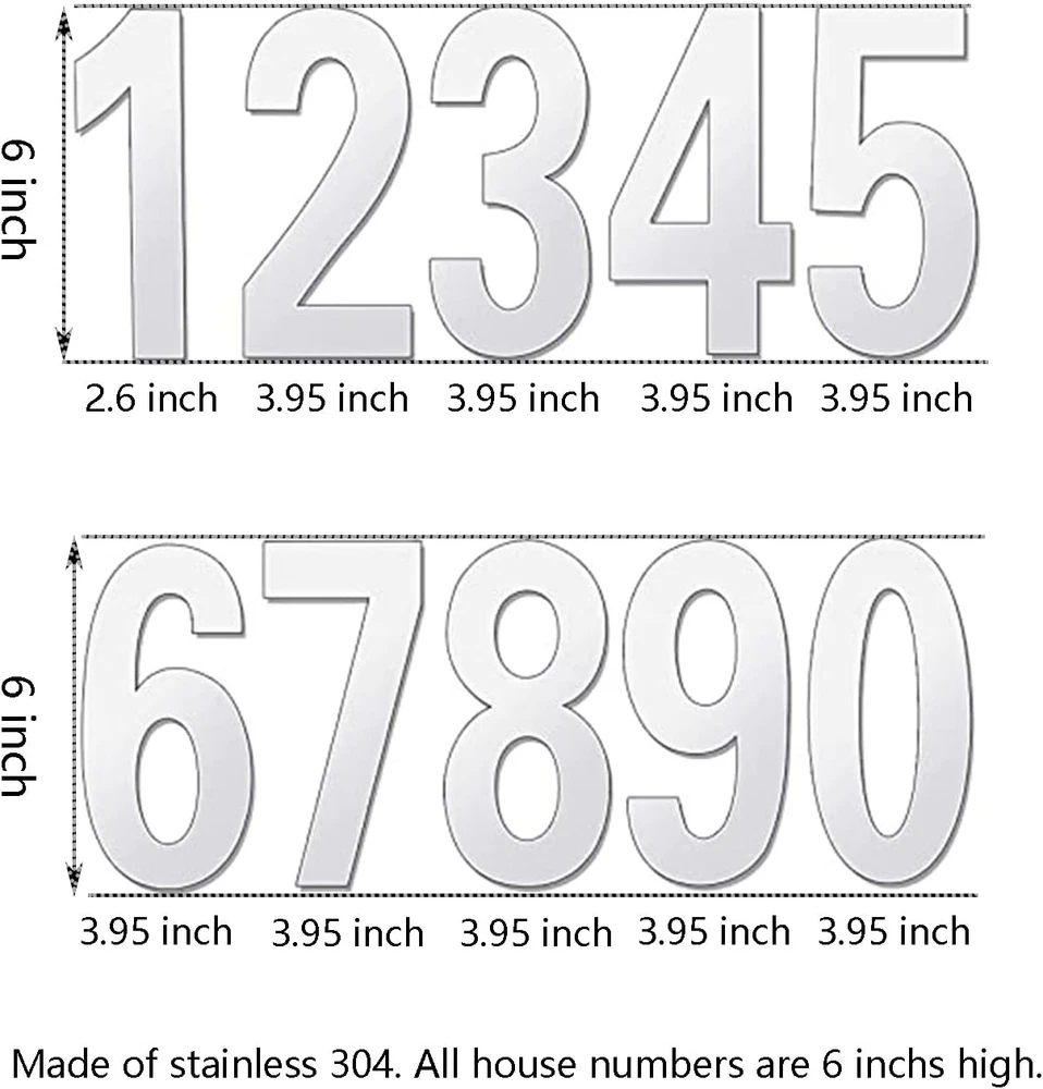 Material: made from finest 304 stainless steel, extremely durable, rust proof and weather proof Size Dimension: 6 inches high,2mm thick, ideal for most of your use Easy to install: matched screws included, can be finished install in minutes Floating Effect: 2mm length hidden mounting plugs made numbers a modern floating effect when viewed from front Widely Application: can be used as home address numbers, farmhouse numbers, front door numbers, business shop address signs, apartment or cottage, garage numbers and more