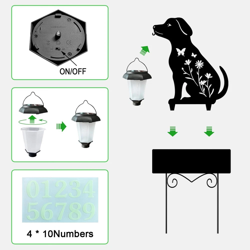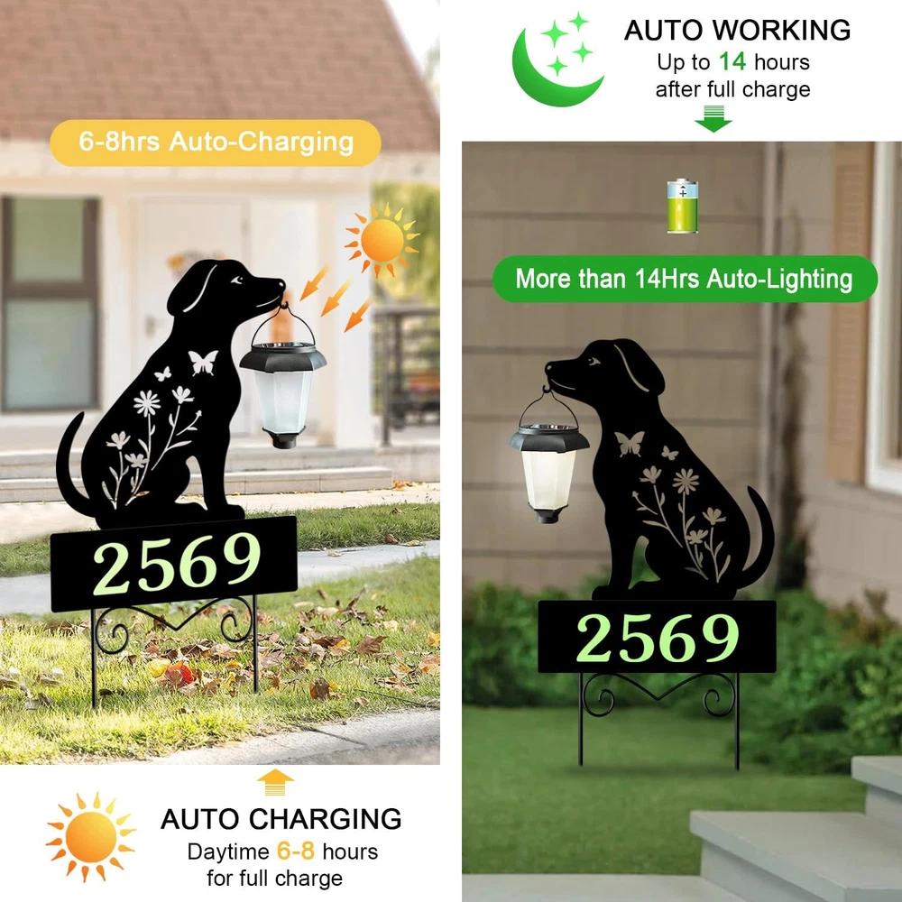 Modern house numbers Add a touch of elegance to your home with the black plaque and glow in the dark numbers, creating a modern and sophisticated house number display for outside. House address signs Ideal as a gift for garden enthusiasts, these solar stake lights not only serve as functional house numbers but also as decorative garden art, adding charm and character to any outdoor setting. Outside decorations for yard The waterproof design ensures that these yard signs can withstand various weather conditions, making them perfect for outdoor use all year round. Garden decor for outside Enhance your outdoor decor with these stylish metal black dog silhouette garden stakes featuring a solar lantern with glow in the dark house numbers for a unique and eye-catching look. Solar house numbers at night with the built-in solar-powered lights that automatically turn on when it gets dark, providing a warm and inviting ambiance to your outdoor space. Product Description Solar house numbers for outside Modern house numbers Lighted address signs for houses Black house numbers