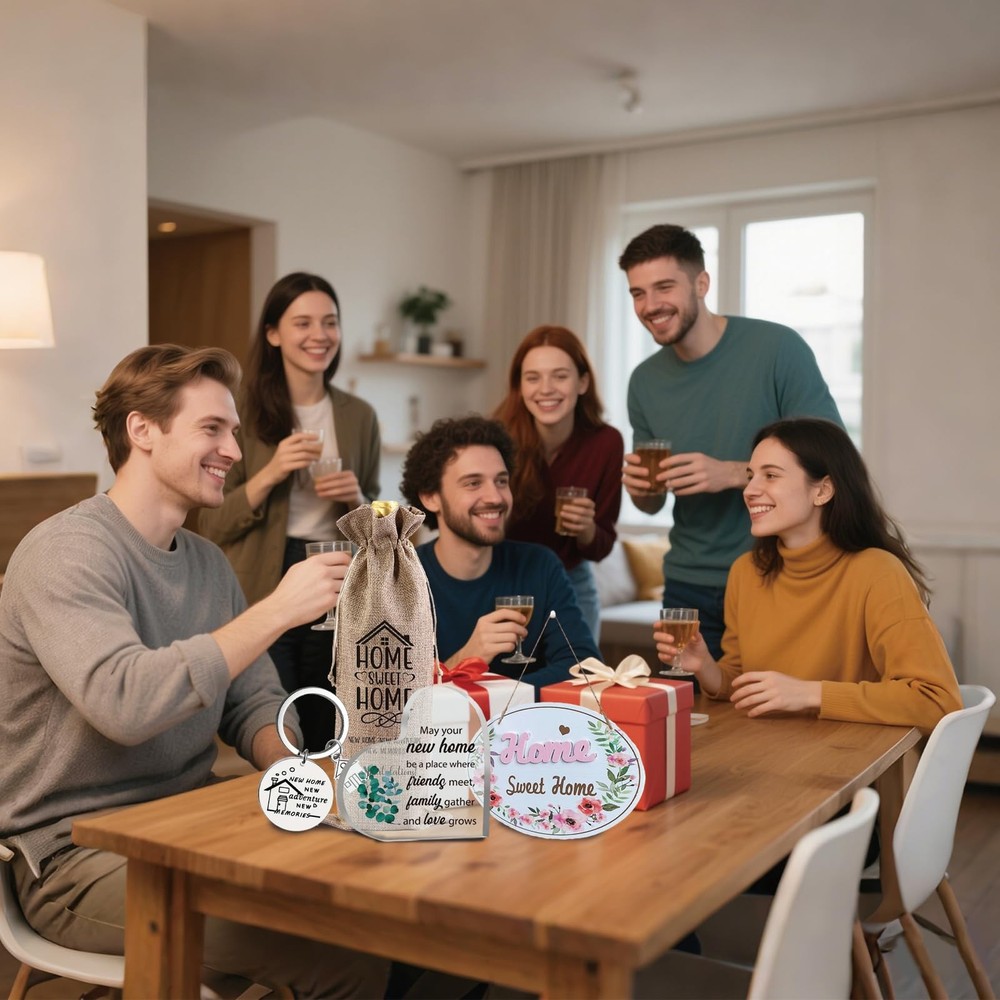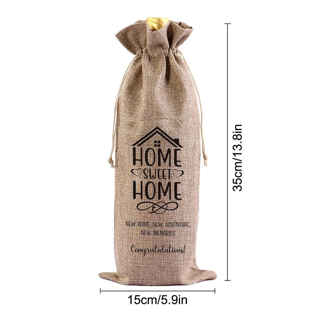 Make a new house feel like home with this thoughtfully curated 4-piece housewarming gift set. Perfect for celebrating friends or family moving into their new space, this collection includes a charming wooden 'Sweet Home' decorative sign that adds warmth to any room. The set also features a heartfelt keepsake memento to mark this special milestone, a stylish wine bag for that perfect bottle, and a practical yet decorative keychain - ideal for those new house keys! Each piece has been selected to combine both functionality and sentiment, making this the perfect way to welcome loved ones to their new address. This comprehensive gift set takes the guesswork out of housewarming present shopping, offering multiple ways to show you care about their new beginning. π‘ Housewarming Gifts for New Home β Thoughtful and Practical π Celebrate a loved βs new beginning with this carefully curated housewarming gift set, designed to bring joy and comfort to their new space. This thoughtful collection includes a charming wood door decor, a heartwarming keepsake, a stylish keychain, and a reusable wine bag β perfect for welcoming the new homeowner to a place full of fresh starts and new memories. π‘ Charming Home Door Decoration β Warm Welcome π Add a personal touch to any home with this beautifully designed door sign. The style makes it perfect for both indoor and outdoor spaces. Featuring reserved holes and a rope, itβs easy to hang on walls, doors, or handles. Ideal for seasonal decorations, it can be displayed year-round and for various holidays such as Christmas, Halloween, and Thanksgiving, making it a versatile gift for any occasion. π‘ Sweet Home Keepsake β A Heartfelt Gesture π Commemorate the excitement of moving into a new home with this lovely heart-shaped keepsake. With the words βNew Home Sweet Homeβ printed on it, this ornament serves as a beautiful reminder of new beginnings. Sized at 3.93 x 3.93 x 0.39 inches, it can be displayed on countertops, shelves, or even used as a decorative paperweight in the office, making it a meaningful and lasting gift for any new homeowner. π‘ Keychain Gift for Family & Friends β Perfect for Housewarmings π This stainless steel keychain is the perfect addition to any housewarming gift. Engraved with a heartfelt message, itβs a charming token for newlyweds, new homeowners, or anyone celebrating their move. Compact at 30 x 30mm, itβs a durable keepsake that will remind them of their fresh start in their new home π‘ New Home Wine Bag Gift β Celebrate in Style π Bring sophistication and eco-consciousness together with this reusable wine bag. Crafted from sustainable materials, itβs designed to hold wine or champagne bottles with an elegant top drawstring closure. Measuring 13.8 x 5.9 inches, itβs perfect for gifting wine at a housewarming party or simply celebrating a new chapter in life while reducing waste.