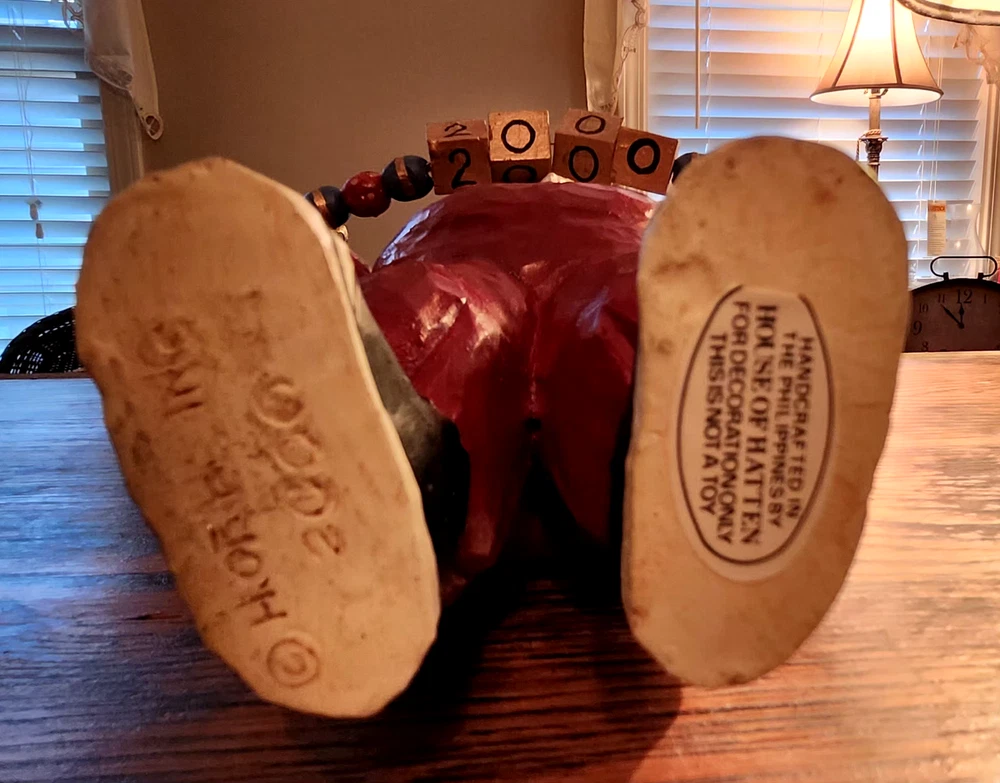 Type:FigurineShape:FiguralBrand:House of HattenYear:2000Color:RedOriginal/Reproduction:OriginalStyle:Folk ArtArtist:Kelley StadelmanTime Period Manufactured:2000-2009Material:ResinUPC:N/APattern:SolidSize:MediumTheme:Seasonal, Y2K, Santa Claus, Millenium, ChristmasHandmade:Nogtin13:N/ABattery Type:N/AYear Manufactured:2000Collection:Heritage Arts StudioFinish:MatteSigned:NoCharacter:Santa ClausEra:21st Century (2000-Now)Department:AdultsItem Height:9 inCountry/Region of Manufacture:PhilippinesSubject:SantaFeatured Refinements:House Of Hatten SantaOccasion:ChristmasCharacter Family:Y2KPower Source:N/ANumber in Pack:1Item Length:6.5 in