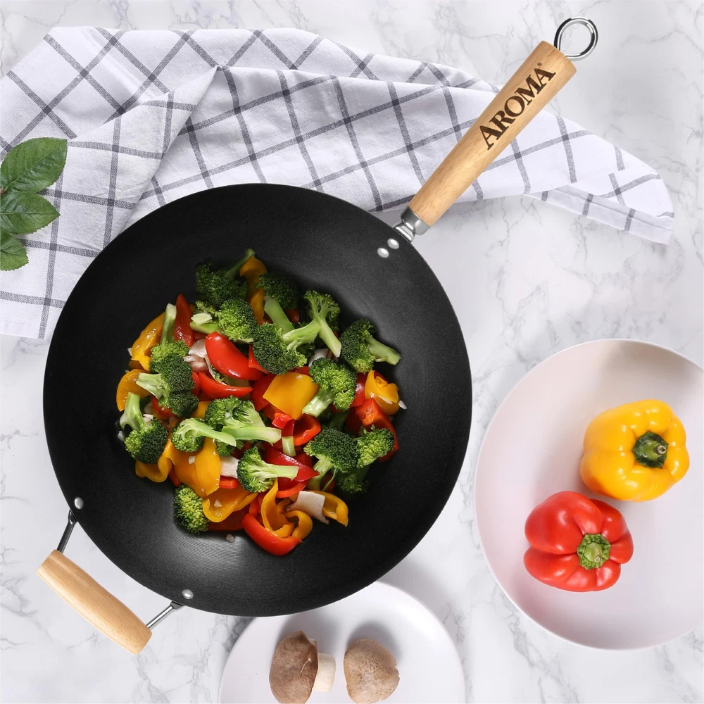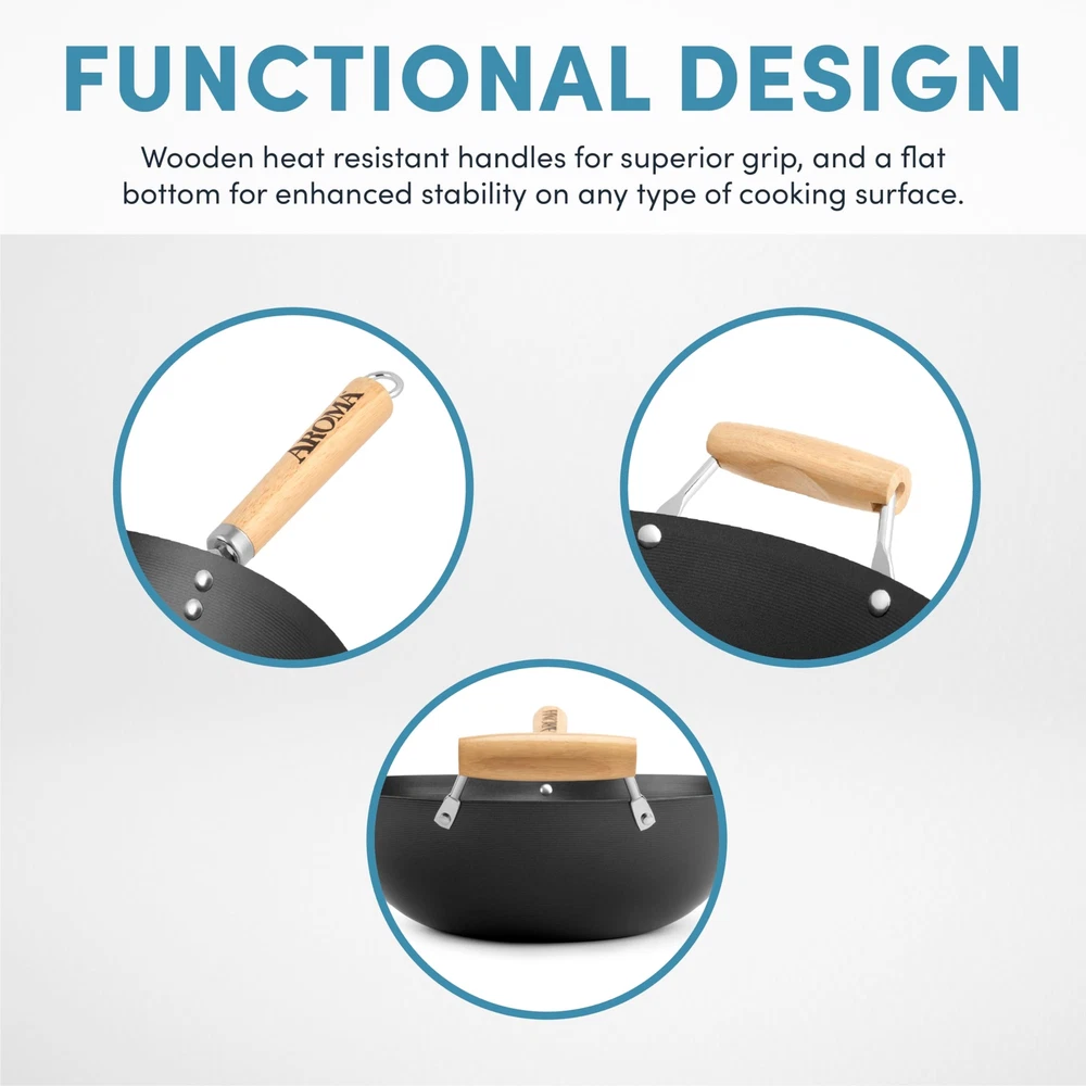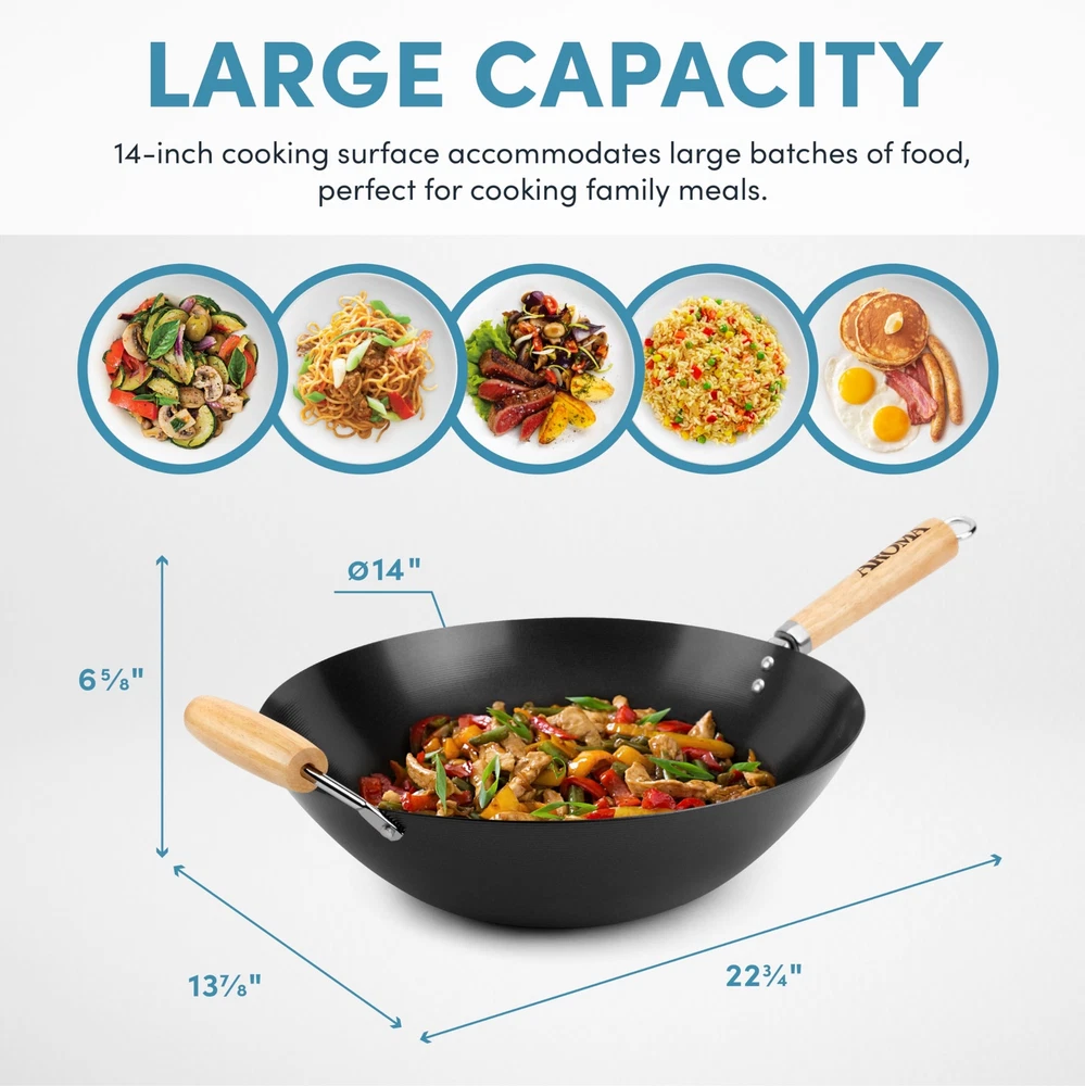 From searing to stir frying, the Carbon Steel Nonstick Wok is ideal for a variety of easy-to-make meals. Whether you're using gas, halogen, ceramic or a coil stove, this carbon steel cookware is versatile enough for any surface. The carbon steel coating has superior non-stick performance and makes for a simple cleanup. If you are a novice or an experienced chef looking to expand their recipe book, a classic Chinese wok is the -pan solution every modern kitchen needs. 1.5mm carbon steel construction allows for consistent heat distribution and optimum cooking temperatures Made of heavy-duty rust-free carbon steel designed to last longer than other types of cookware Large 14 in. diameter capacity, perfect for cooking family meals Wooden handles for superior grip Flat bottom for enhanced stability on any type of cooking surface Can be heated on all types of cooktops, including induction Completely nonstick surface makes for -free cooking and easy cleanup