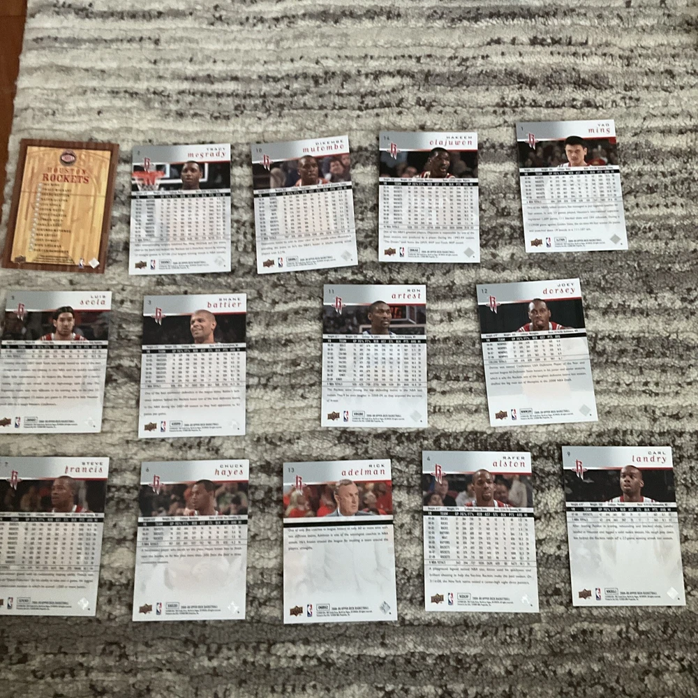 This set of Houston Rockets trading cards by Upper Deck is a must-have for any basketball fan. Featuring players like Yao Ming, Hakeem Olajuwon, and Tracy McGrady, these cards showcase the talent and skill of some of the greatest players in NBA history. With card numbers 2, 14, 1, 3, 12, and 9, this collection is perfect for both novice and seasoned collectors. These sports trading cards are a great addition to any collection and make the perfect gift for any sports fan. Whether you're a die-hard Houston Rockets fan or just love the sport of basketball, these Upper Deck cards are sure to impress. Don't miss out on the opportunity to own these of upper deck Houston cards.