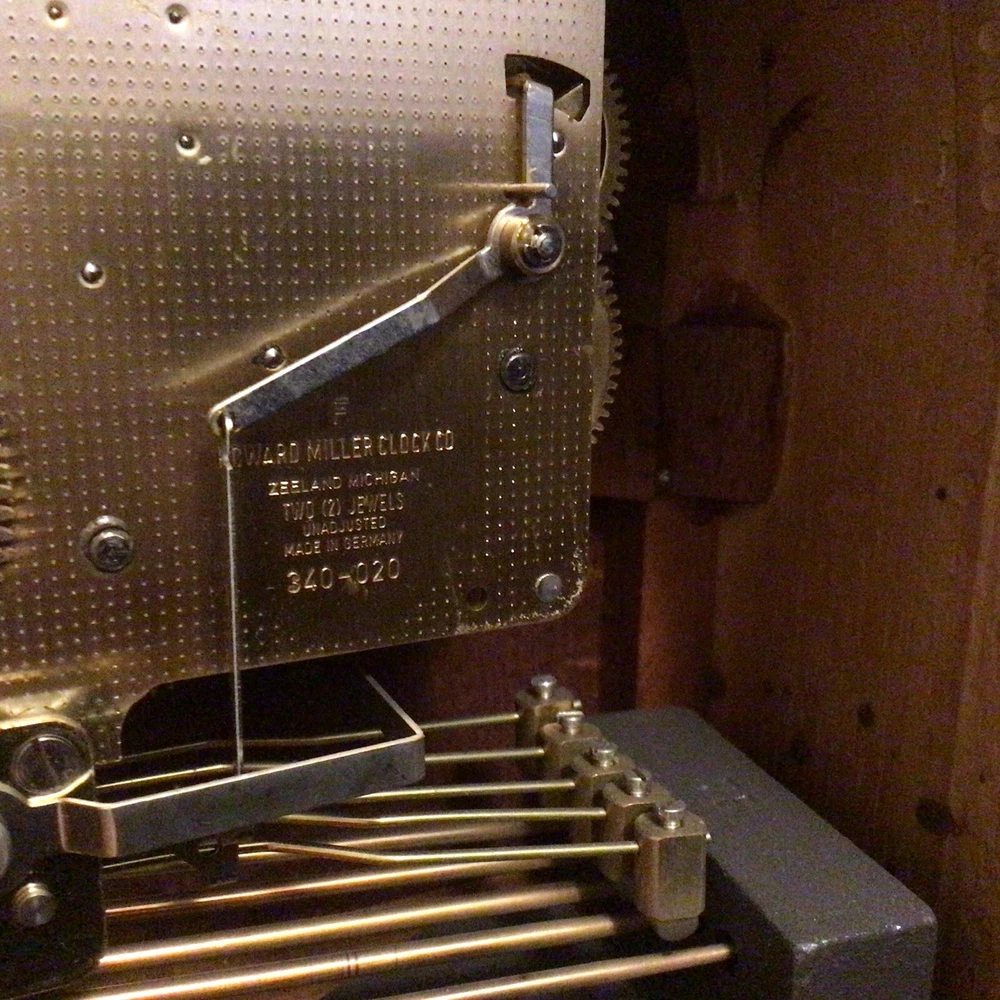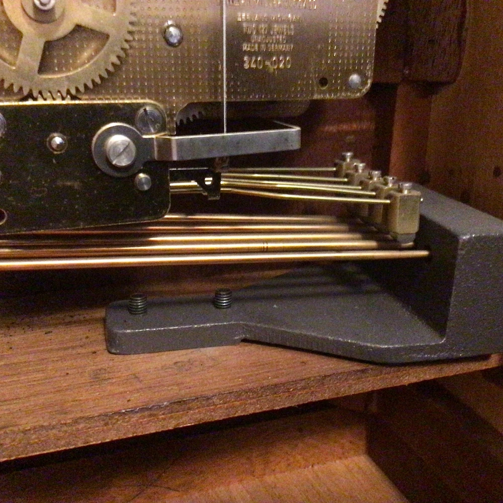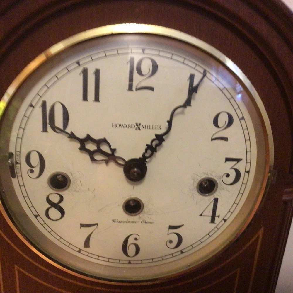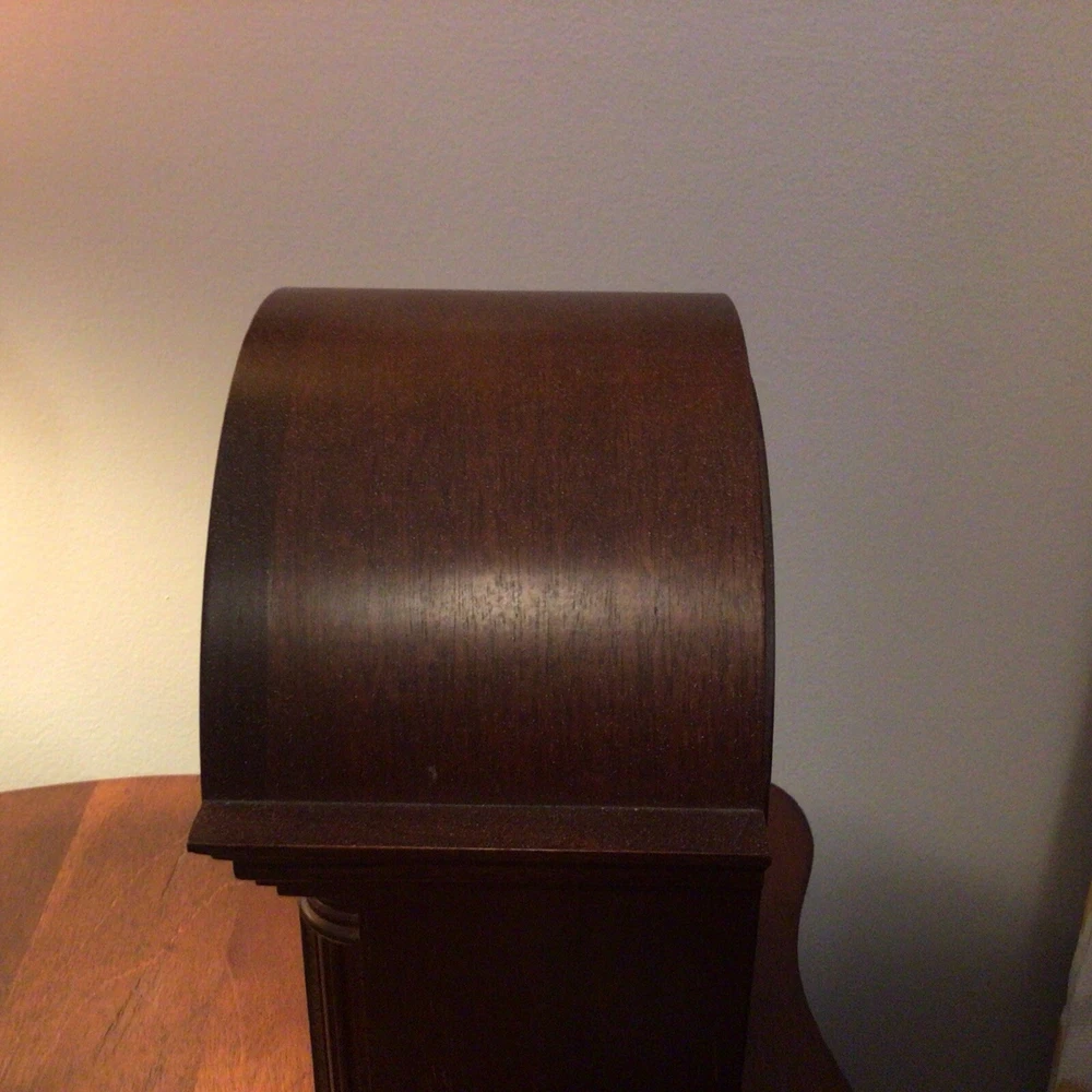 This beautiful Howard Miller Barrister Westminster Chime Mahogany Clock is a vintage piece that will add elegance to any room. The clock features a traditional style with a mahogany finish, brass accents, and glass panels. It is signed and comes with a key that allows it to keep perfect time. The clock's movement is mechanical and it has a Westminster chime sequence that plays on the hour. The display type is analog and it has two jewels. The clock is an original piece from Germany and was manufactured in the late 20th century. It will make a great addition to any collection or as a stand-alone piece.