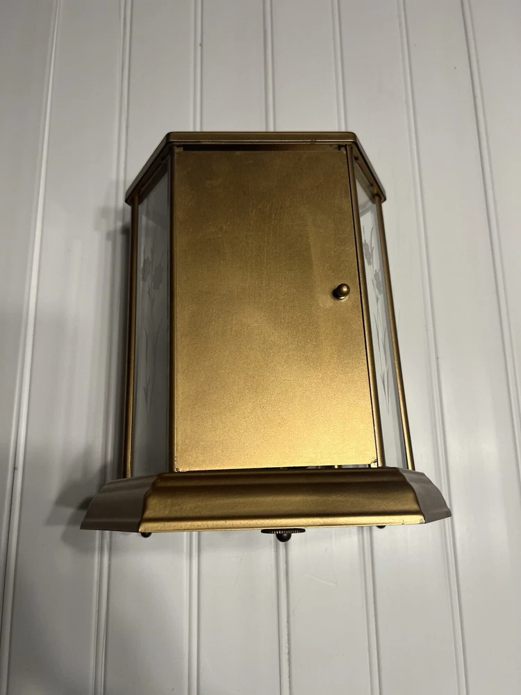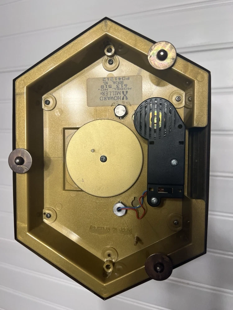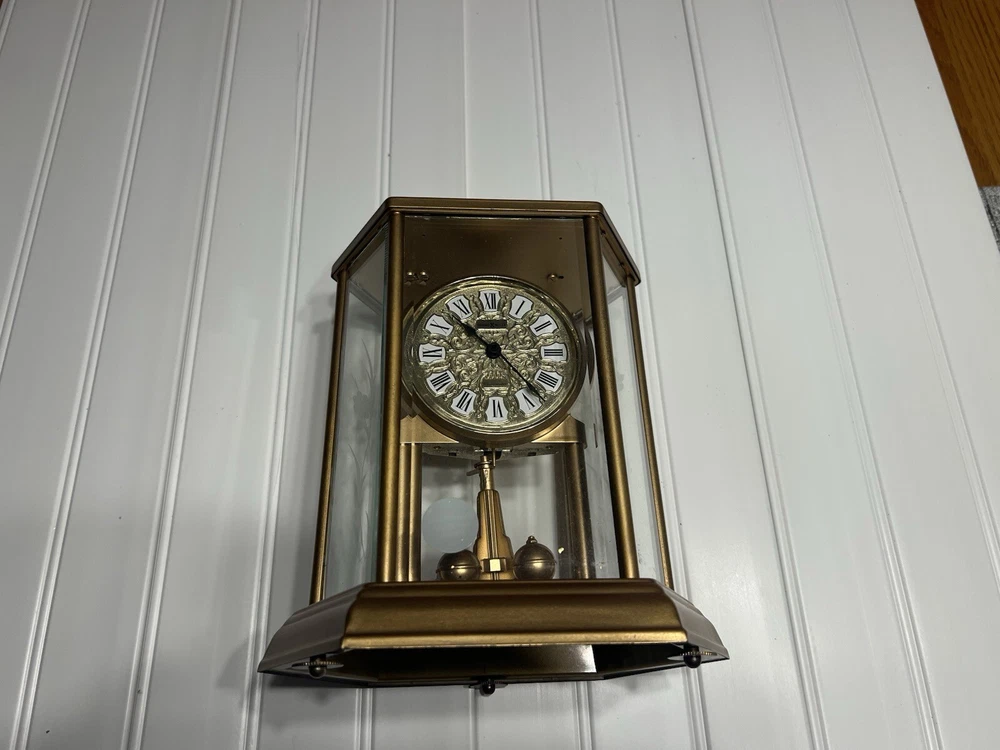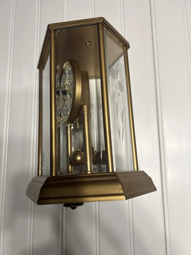 This Howard Miller Clock is a vintage/retro styled anniversary/torsion clock that features a brass frame and quartz movement. It is battery-operated and has chimes. The clock is in good working condition and is perfect for adding a touch of vintage charm to any space.