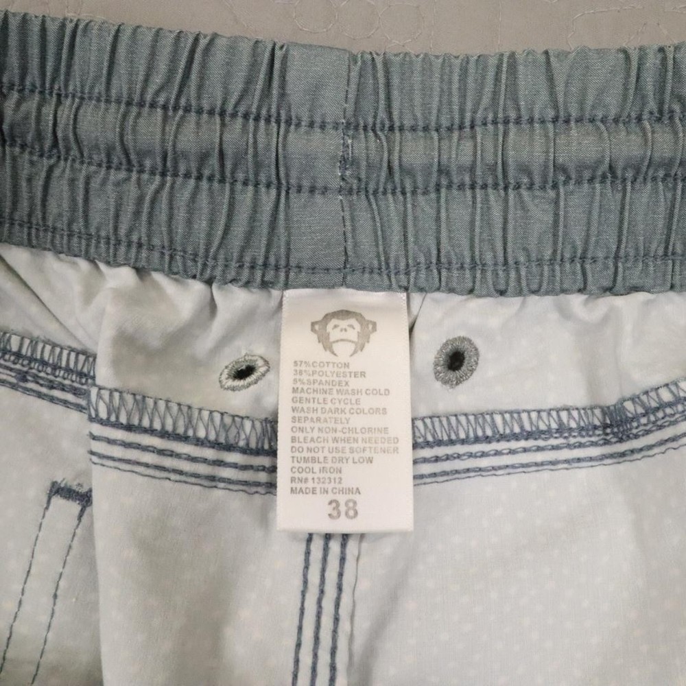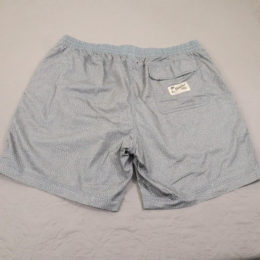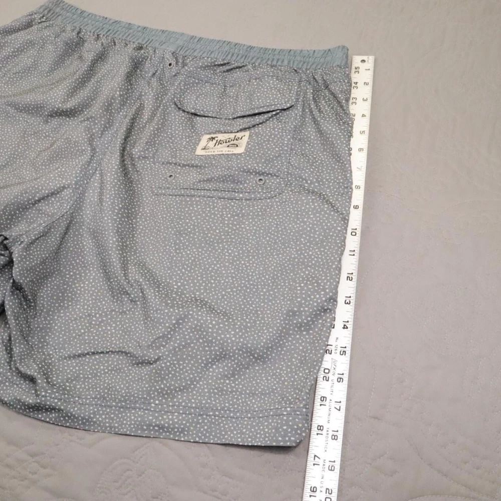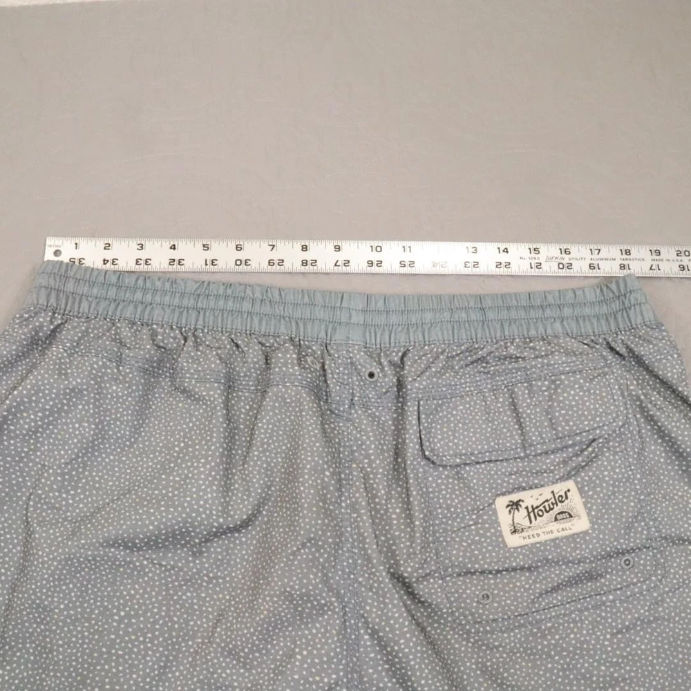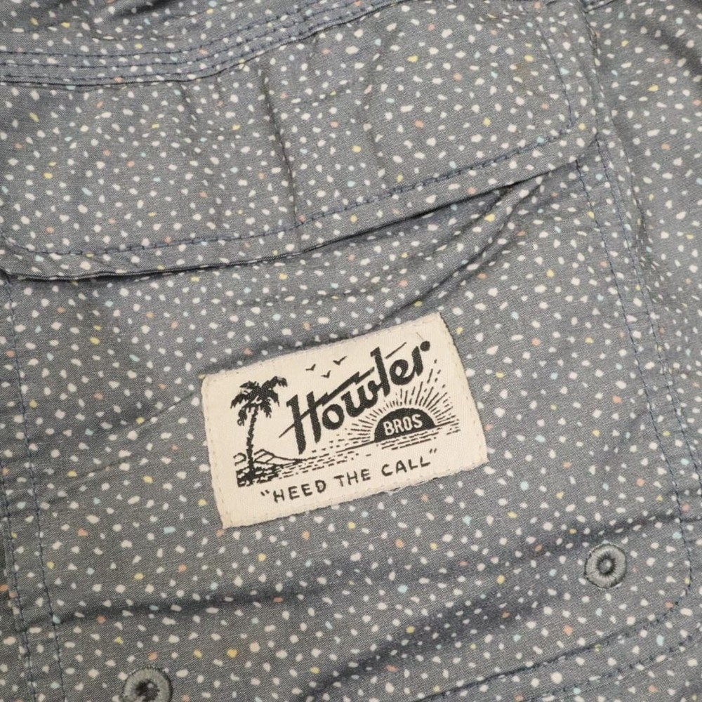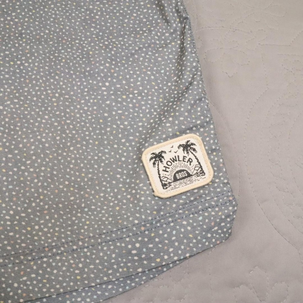 Brand: Howler Bros. Style: Mens swim shorts with elastic drawstring waist and casual fit. Color: Gray body with multicolor micro dot allover print and contrast drawcord. Size on tag: Mens 38. Material: 57% cotton, 39% polyester, 3% spandex blended fabric. Details: Side hand pockets, rear flap pocket with drainage grommets, woven Howler Bros logo patches and "Heed the Call" branding. Country of origin: Made in China.