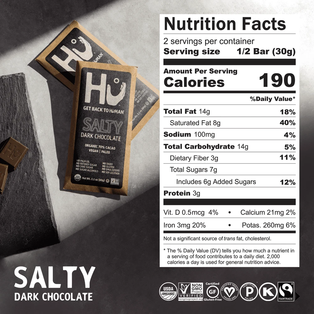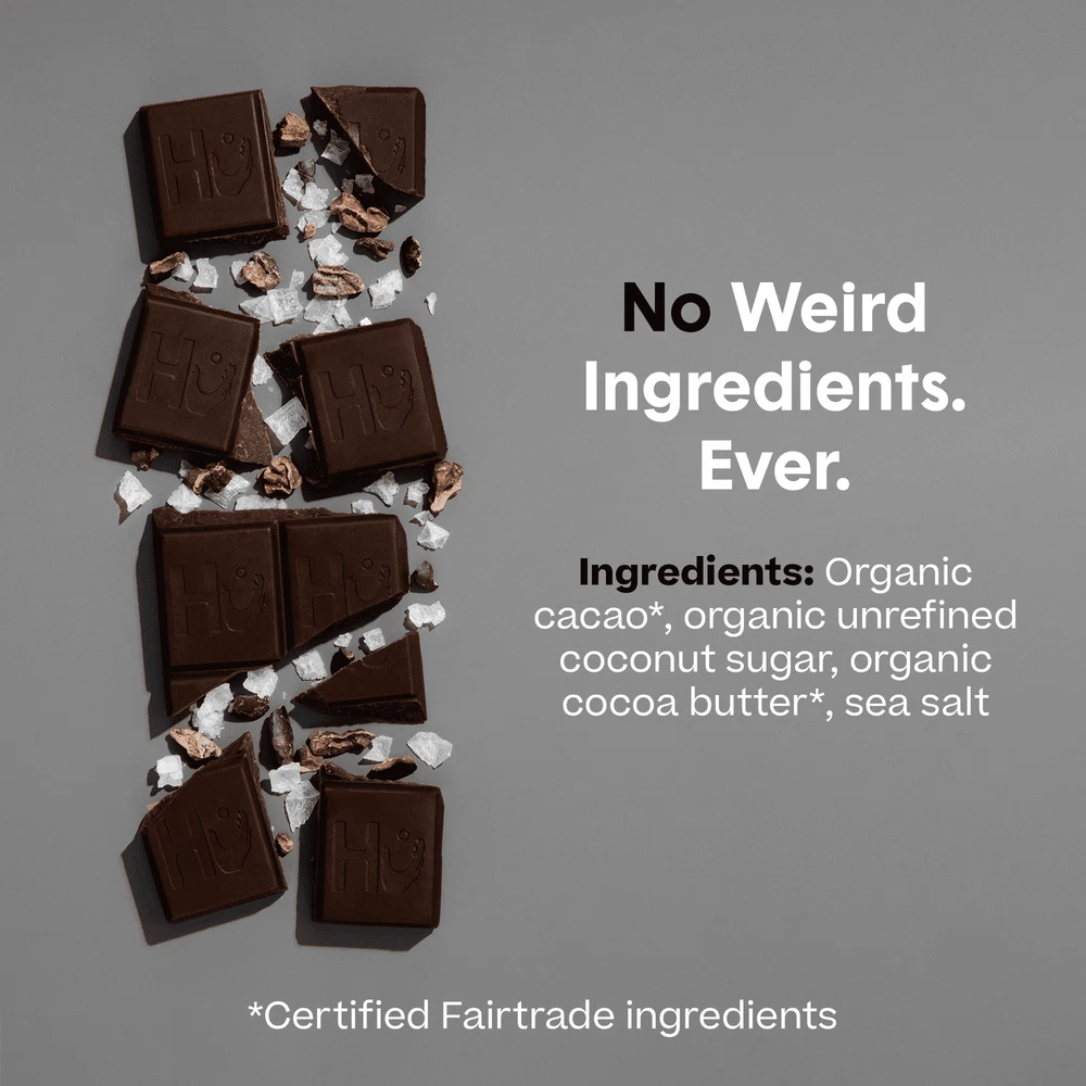 Our Organic Salty Dark Chocolate Bar is 2.1 ounces of pure better-for-you bliss made from simple, close to nature ingredients. Our organic dark chocolate Bars say “NO” to dairy, making it a vegan product that packs enough flavor to impress the most skeptical chocolate lover. Made with organic cacao, our Dark Chocolate Bars boast a rich cocoa flavor. Bitterness not included. Our dark chocolate bars are proudly Paleo, Vegan, Organic, with no dairy, no soy, no emulsifiers, no soy lecithin, no gluten, no refined sugar, no cane sugar, and no sugar alcohols.Our journey started with asking questions about our food, which led us down a crazy rabbit hole of health and wellness discovery. Inspired by quality food’s ability to heal vs poor quality food’s guarantee to hinder, we created Hu to help people get back to eating, living, and thriving like humans. The goal isn’t to just get by. The goal is to live actively, age gracefully, and flourish. NO: Dairy, Gluten, Cane Sugar, Refined Sugars, Sugar Alcohols, Palm Oil, Soy, Emulsifiers