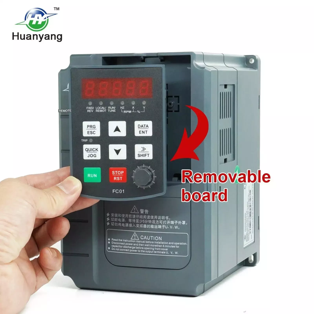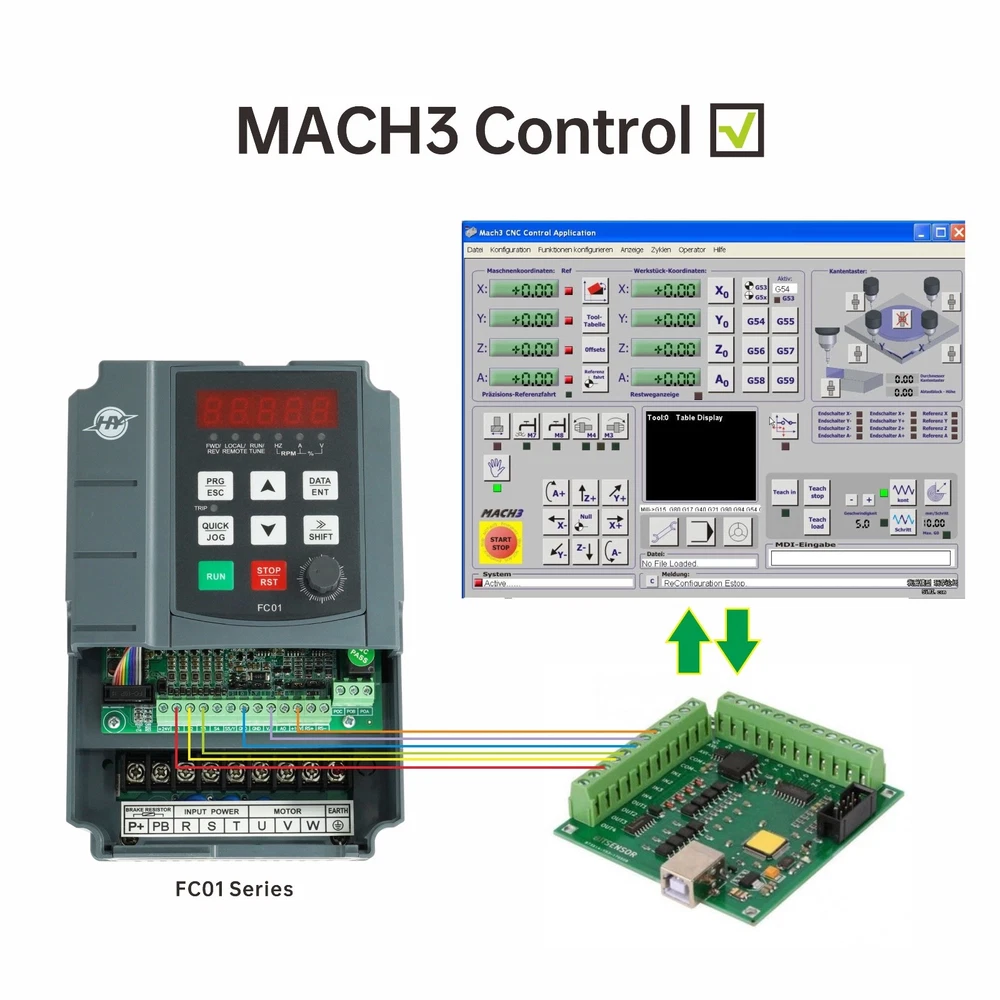 IMPORTANT NOTE The variable frequency drive can only drive three-phase asynchronous motors and cannot be used as a power source. If your motor is heavy load , pls choose a higher horsepower vfd than your motor's To protect the VFD, be sure to press the red button "Stop" and turn off the power when you stop using it. FC Series 220V-1.5kw VFD Specifications Applicable motor horse-power ≤ 1.5KW (2HP) Input valtage 220VAC(+/-5%) 1 or 3 phase (”R“,”T“ terminals for 1 phase,”R“,”S“.”T“ terminals for 3 phase) output valtage 3 phase 220v input Frequency 47-63Hz output frequency 0-400Hz, 0-50Hz/60Hz (According to motor setup) rated current 7A (Represents the maximum current the VFD can withstand,this is a fixed value) Package Including 1x manual, 1x VFD DC cooling fan DC cooling fan low noise, large air volume help vfd heat dissipation, improve product stability Small and simple The appearance is simple and has a good visual effect.Lightweight design allows customers to get excellent VFD experience application CNC router, CNC router, milling machine, drilling machine, wingding machine, mixer, extruder, compressor, ventilator, pump, grinder and other speed control machines Keyboard and connection way Panel keyboard Rich panel function keys,and support panel removal basic parameter for 400hz spindle or 400hz motor : Set P00.03=400→P00.04=400→P00.10=400 P02.02=400 . Note: The VFD is set to 400hz when you receive it, and you can connect and drive it directly basic parameter for 3 phase 50/60Hz motor for 50Hz motor: P00.04=50→P00.03=50→P00.10=50→P02.02=50 for 60hz motor: P00.04=60→ P00.03=60→P00.10=60→P02.02=60 Package Content 1 X FC series 220v-1.5kw VFD 1 X manual Detailed instructions to help customers understand and operate the VFD Double carton packaging, in the VFD inside the package is also covered with a layer of outer box, so that the VFD in the transport process has a safe protection High quality motherboard Rich features Independent research and development of the design, with powerful functions, and the surface of three layers of paint, can better protect the circuit in different environments Support external potentiometer for remote control Support external braking resistor, achieving fast accelerating/decelerating speed control. supports mcah3 function and RS-485 communication FC series 0.75kw FC sries 1.5kw FC sries 2.2kw FC sries 3.7kw Applicable motor power ≤ 0.75kw(1hp) ≤ 1.5kw(2hp) ≤ 2.2kw(3hp) ≤ 3kw(4hp) Suitable for motor type three-phase motor three-phase motor three-phase motor three-phase motor Support brake resistance ✓ ✓ ✓ ✓ RS485 communication ✓ ✓ ✓ ✓ External potentiometer control ✓ ✓ ✓ ✓