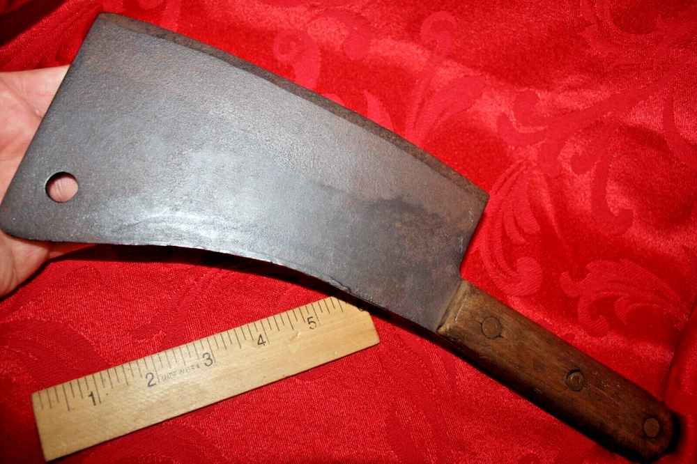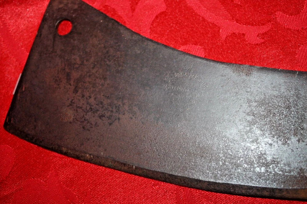 Nice old big heavy meat cleaver that is marked in center of blade VILLAGE BLACKSMITH WATERTOWN WIS in all capital letters. Its hard to read because the surface is a little rough and probably needs restoration to see clearly. No big issues. Handle is in good shape too. It measures a bit under 14" overall and the blade is apx 8" in length. See all pictures and my other listings. The last photo shows a couple of tiny dings along the very top edge. No big deal but they will be there when it arrives at your house should you buy it now for 65$ with 6$ well packaged shipping. Thank you and Good Luck! Rick