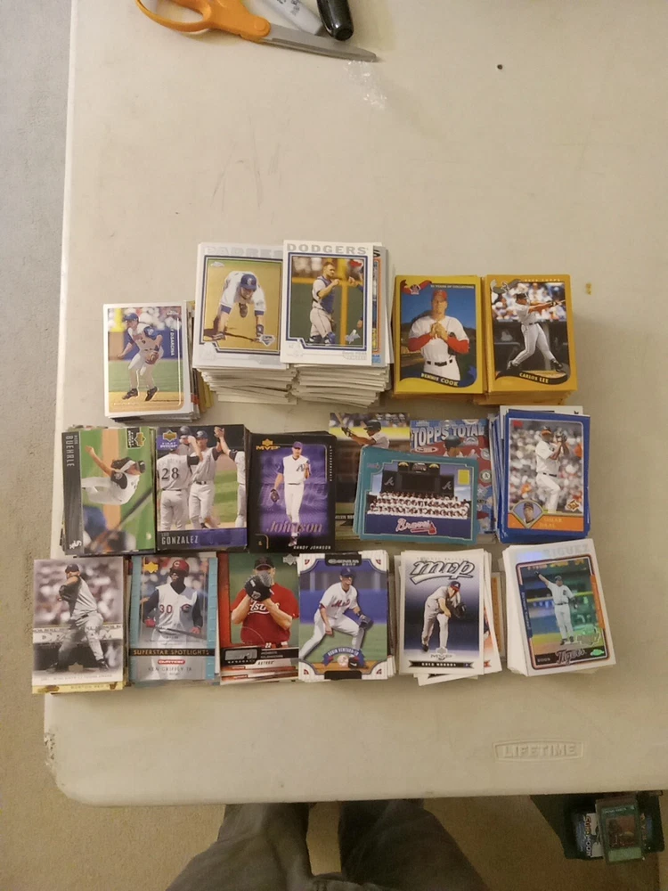 Huge Lot of atleast 1400 cards. Most are from roughly 2000 to 2005. Most of them are topps but there are some upper deck, donruss, etc. There are some topps chrome refractor cards and other limited edition and numbered cards. Some of the special edition cards are shown in photos. Most Cards are in near mint or very good condition. There are a small number in poor condition. There are some duplicate cards. Ships with usps ground advantage within two business days. Feel free to contact me with any questions or offers.