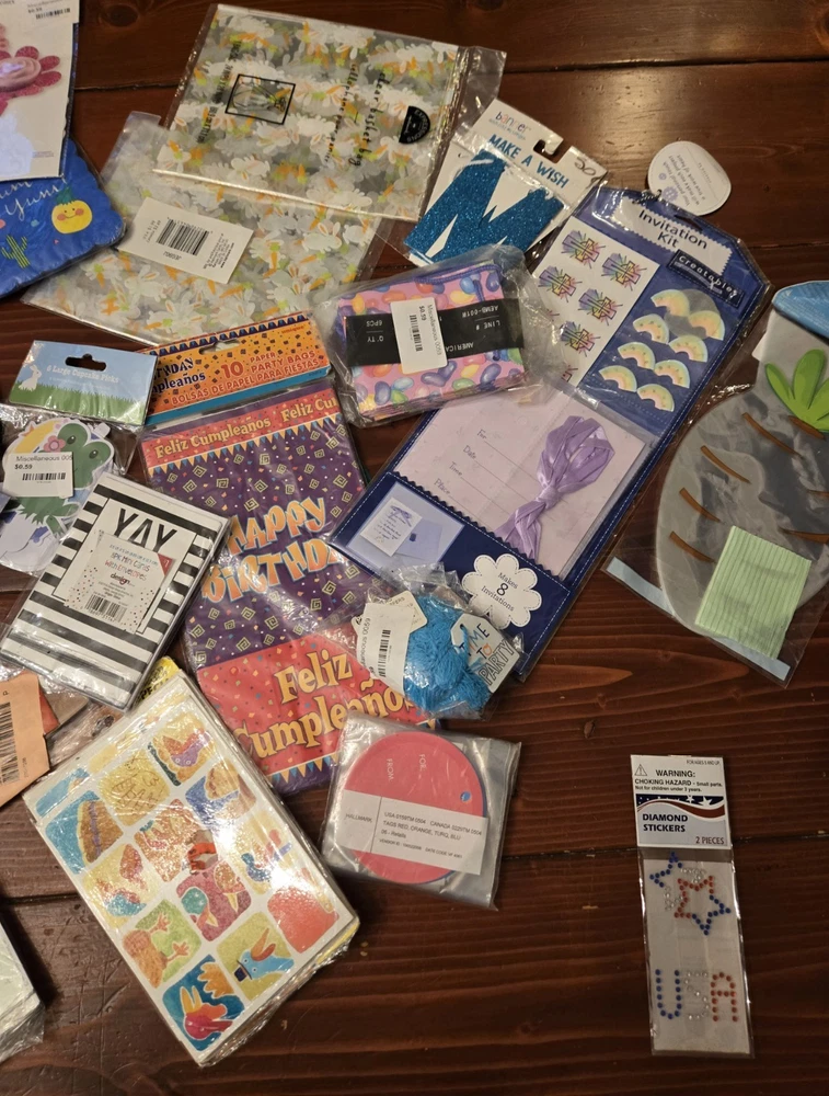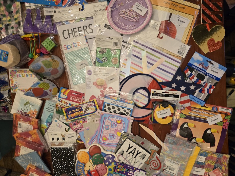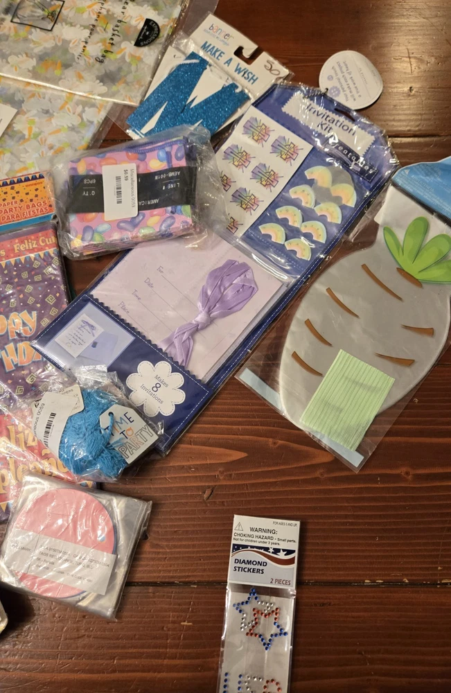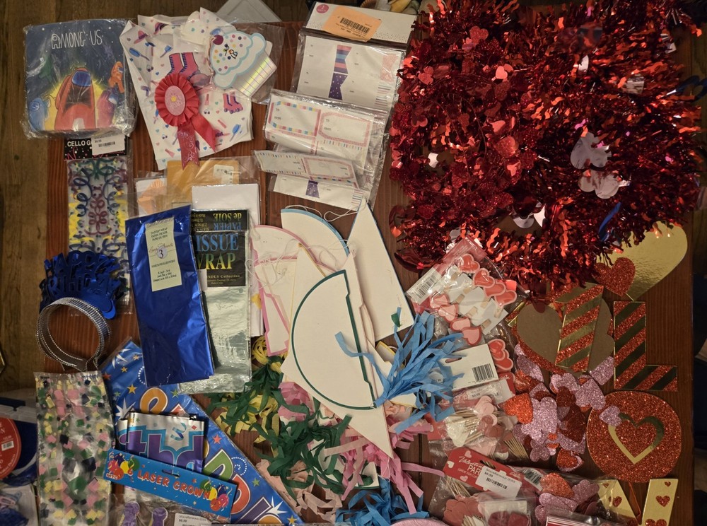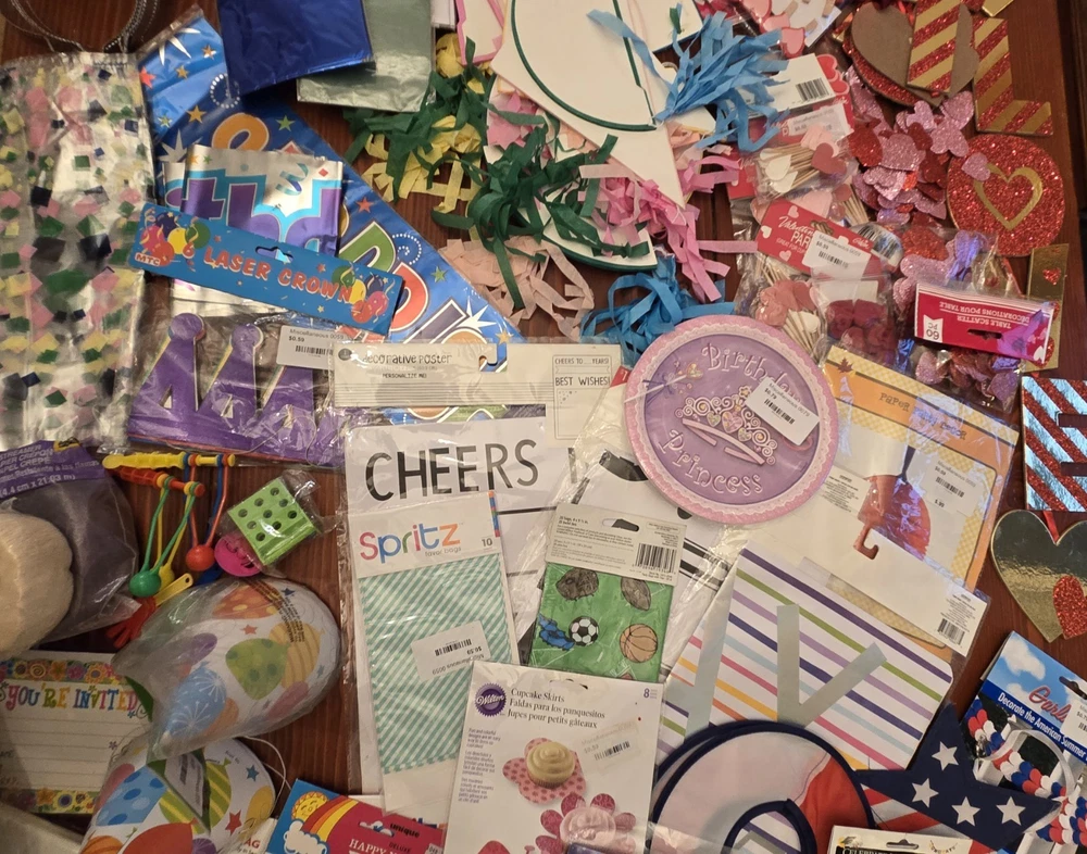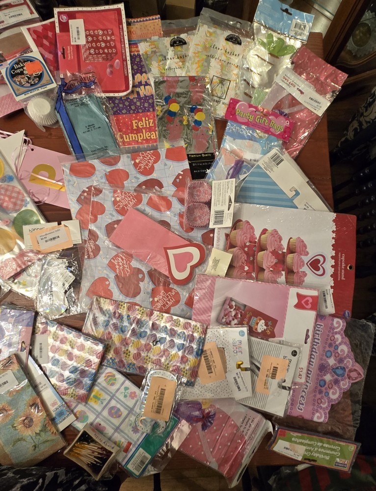 All different types of party supplies for birthdays, Valentine's day, Fiesta parties, Etc. 188 items total! Lots of very cool items like, Baking decorations, gift boxes and displays. Packages that are make your own invitations. All new and most in their original packages, except for the honeycomb decorations, they were used once. But I didn't feel like I should throw them away Because they were still in good condition. There's a few banners that are out of their packages. To tell you the truth, I'm not sure why, because I don't remember using them. I took lots of pictures so that you can see every item. Please be sure to zoom in and look at everything before you buy. This is a lot of stuff, so the shipping may be high because of the weight. Thank you so much for looking!