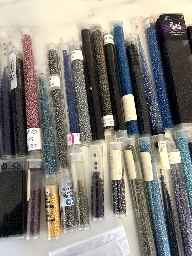 43 total tubes/ bags of mixed seed beads of many colors, styles, and sizes. Czech/ Toho/ Miyuki. Each tube originally ranged in price from $1-$6 back in the 2000's, worth more today. Mix of unopened and partially used tubes.
