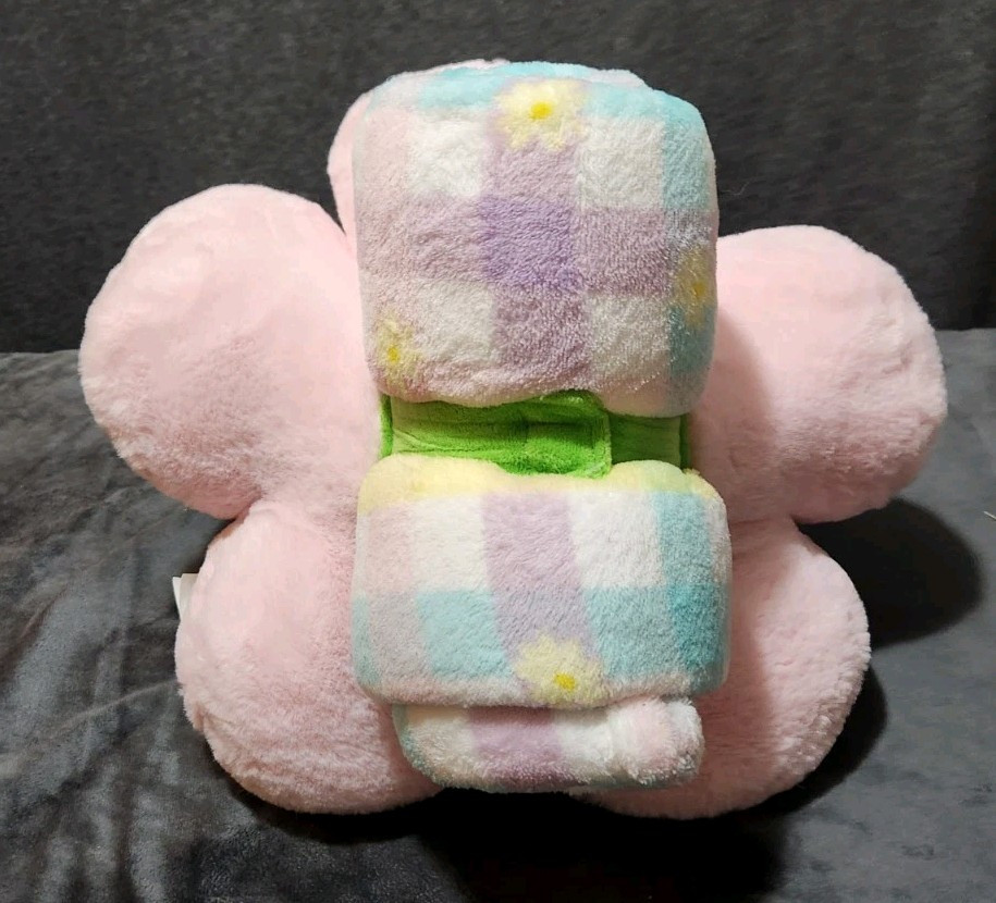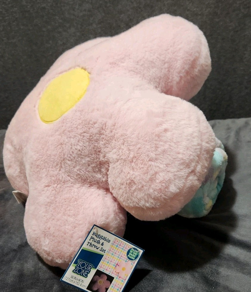 This is a huggable plush throw set with a pillow and fleece blanket, measuring 50x60 inches. The blanket is warm and machine washable, made of polyester and fleece in a multicolor design. It is a modern style item from the brand your zone, suitable for kids' bedrooms. The set includes a rectangular blanket with no closure and is machine washable. It is designed in China.