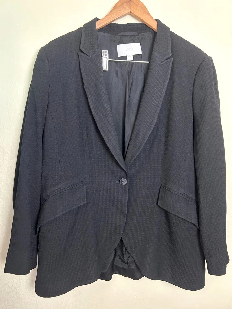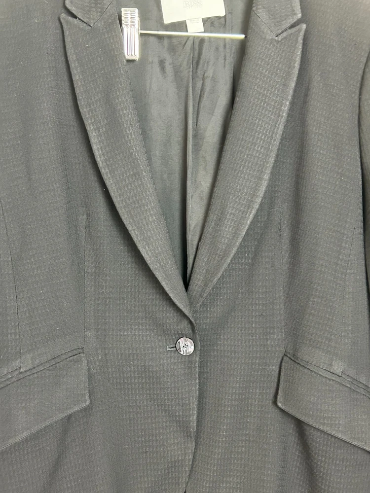 Hugo Boss Blazer BLACK Women's Size 14 US Jabina Stretch Wool Blend One Button *This item is in GOOD condition. Please see pictures for more detail. * (We grade most items as Good if preowned; even if they are above good condition, since they are pre-loved and are not perfect. Items will always be noted if they are stained or ripped.) Sold from a smoke free home and shipped within the USA; packaged with care! Thank you for supporting our small family business! . 🌼 *PLEASE REVIEW PICTURES FOR MEASUREMENTS AND ASK QUESTIONS BEFORE BUYING. TAKE YOUR MEASUREMENTS FOR CLOTHING ITEMS AND COMPARE TO MEASUREMENTS IN PHOTOS TO DETERMINE IF THIS ITEM WILL FIT YOU. RETURN SHIPPING IS NOT FREE FOR SELLERS AND IS AN UNNECESSARY HASSLE FOR BUYERS. TAKE YOUR MEASUREMENTS. *All trademarks, brand names, and logos stated in this listing are used for identification purposes only and are registered trademarks of their respective owners who reserve the rights of ownership. * Returns : No Returns for this item. Look at measurements before buying.