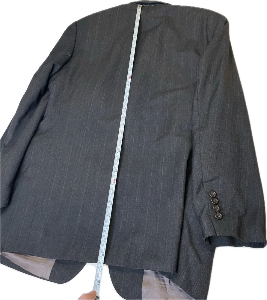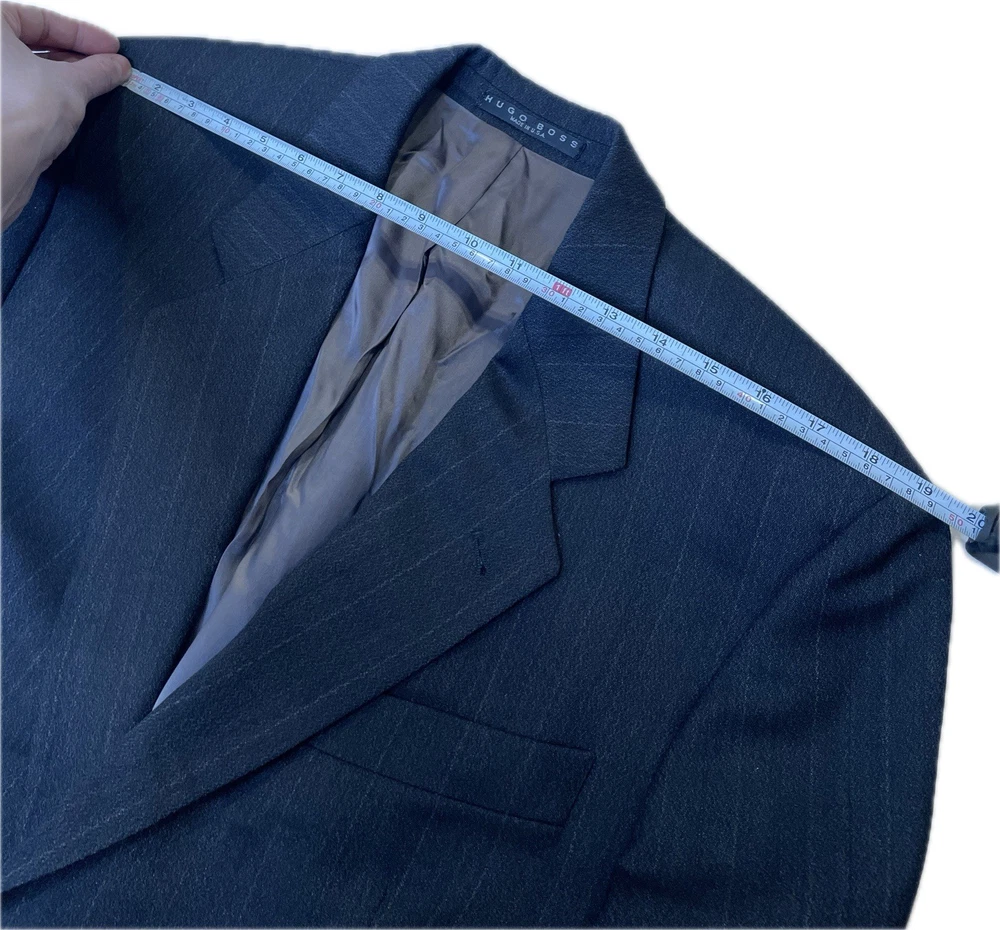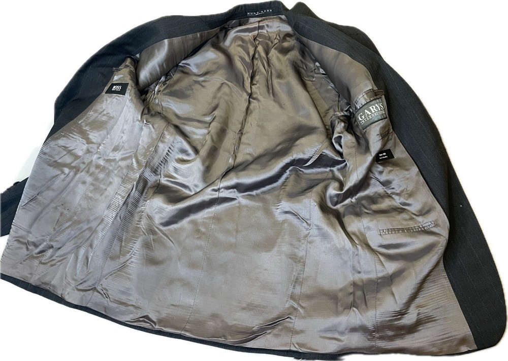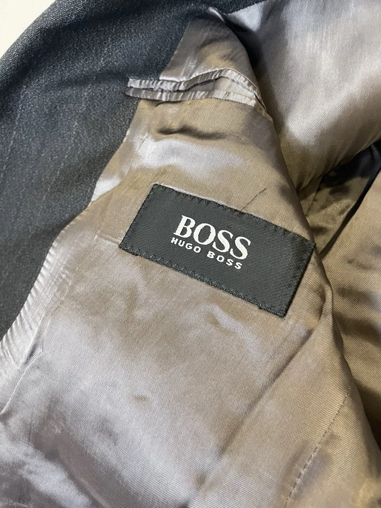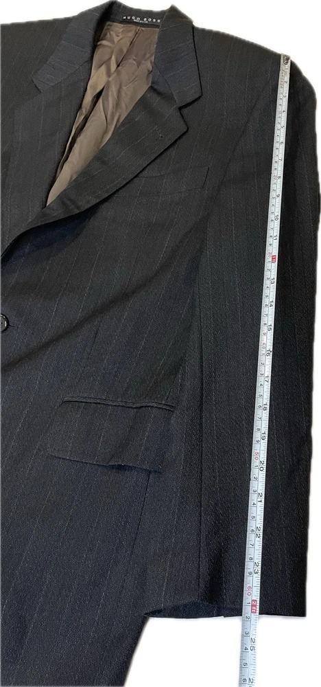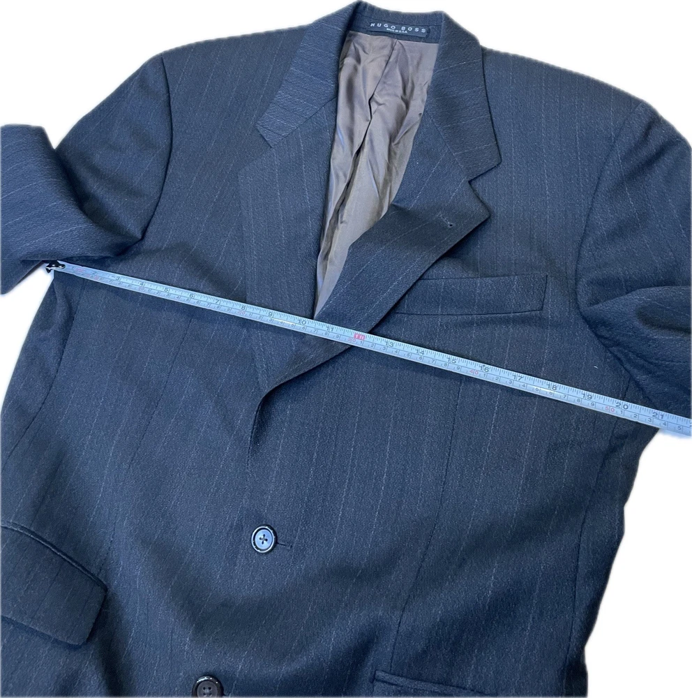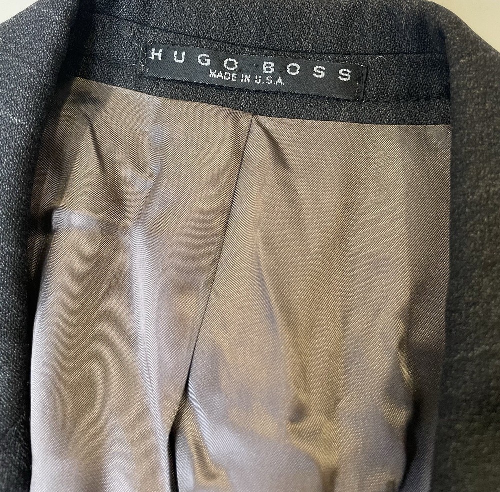 Hugo Boss Men’s 100% Wool Blazer Gray Black Einstein Striped Made In USA 40R Pit2pit 21” Shoulders 19” Sleeve length 24” Length 30.5” Excellent condition Made in USA